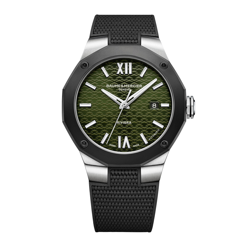 Ref. M0A10763 - Die Riviera ist zurück, in dezenten dunklen Tönen und mit einer Variante der automatischen „Swiss Made“ Riviera in 42 mm mit Edelstahlgehäuse und dunkelgrünem Zifferblatt an einem auswechselbaren schwarzen Kautschukarmband. Die Lünette aus sandgestrahltem, ADLC-beschichtetem Stahl, die mit vier funktionalen Schrauben am Gehäuse befestigt ist, verleiht dieser zeitgenössischen Kreation einen dezenten und zugleich dynamischen Look. Ihr sportliches Erbe ist nicht zu übersehen. Das Zifferblatt ist in einem schönen Dunkelgrün lackiert, das durch ein Ton-in-Ton-Wellendekor sowie römische Ziffern und Indizes unterstrichen wird.