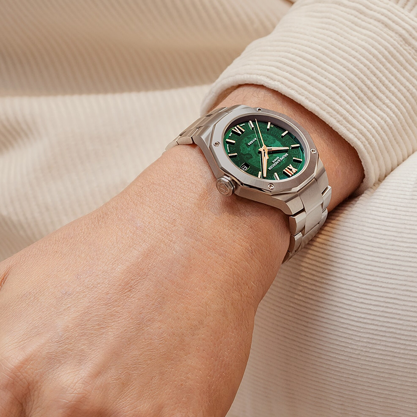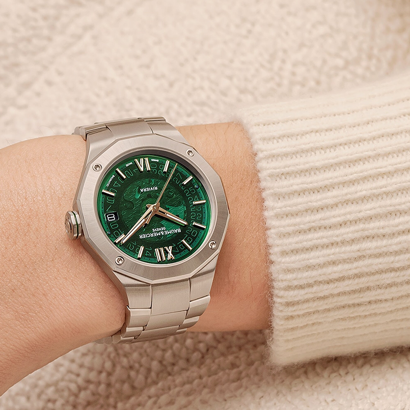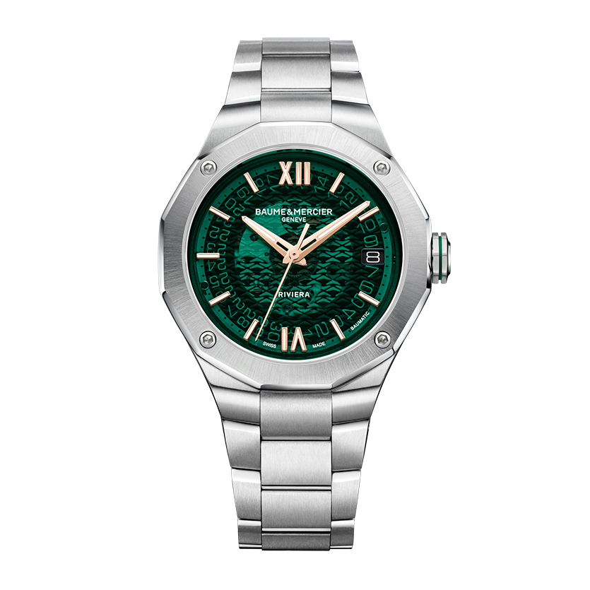 Ref. M0A10770 - Die Riviera kehrt 2024 mit einer Version in 39 mm mit grünem Zifferblatt zurück. Dieser neue Zeitmesser zeichnet sich durch die charakteristische zwölfeckige Form mit zwölf Seiten und vier Schrauben sowie einen unvergänglichen modischen, sportlich-schicken Charme aus. Angetrieben wird sie vom Manufakturwerk Baumatic, das seit seiner Einführung 2017 seine Leistungsfähigkeit unter Beweis gestellt hat und das durch das für die Riviera Baumatic so charakteristische getönte Saphirzifferblatt bewundert werden kann. Auch wenn das ursprüngliche Design beibehalten wurde, ist der Wunsch, sich der heutigen Zeit anzupassen, offensichtlich. Als jüngste Ergänzung der Riviera Kollektion versprüht diese neue 39-mm-Variante mit grünem Zifferblatt die suggestive Kraft des Originalmodells von 1973.
