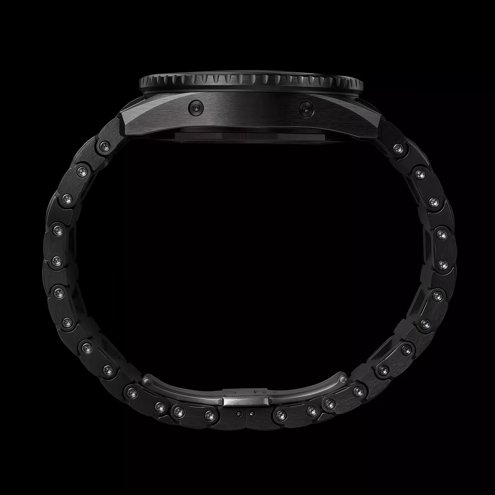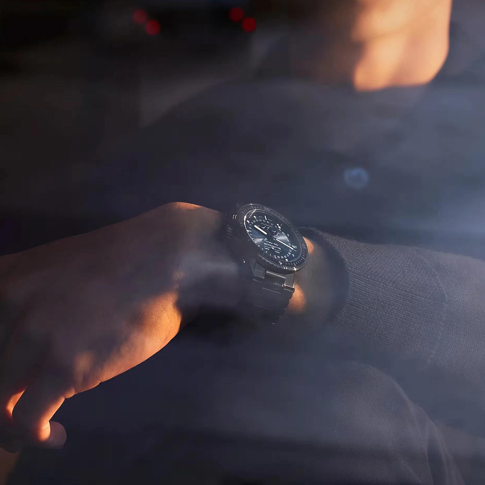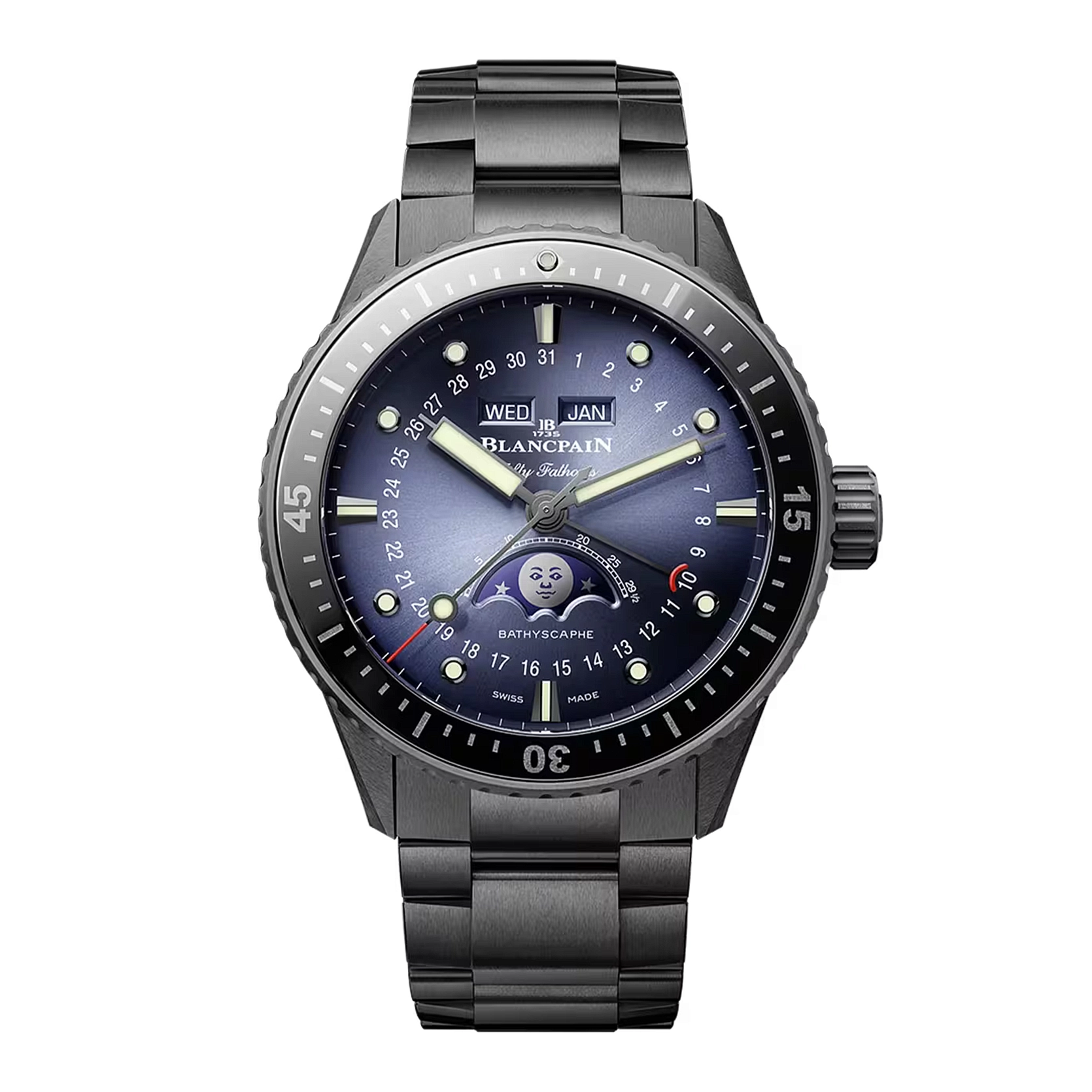 Ref. 5054 0140 01S - Die Bathyscaphe Quantième Complet Phases de Lune vereint Taucherleistung mit raffinierter Komplikation. Vollständig gefertigt aus handveredelter schwarzer Keramik – einschließlich des Hightech-Armbands – bietet diese ikonische 43,6 mm Uhr außergewöhnliche Kratzfestigkeit und Komfort. Angetrieben vom Kaliber 6654.P.4, verfügt sie über eine Gangreserve von 72 Stunden. Ihr blaues Sonnenschliff-Zifferblatt zeigt einen vollständigen Kalender, Mondphasen und Sekundenkomplikationen und demonstriert Blancpains technologische Innovationskraft und Abenteuergeist.