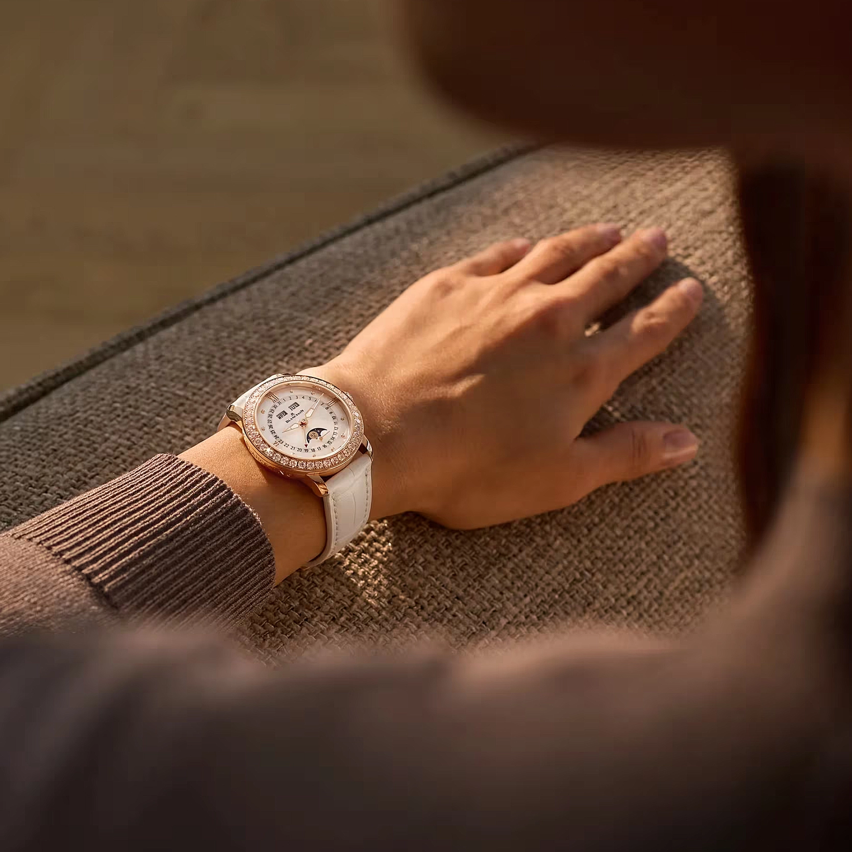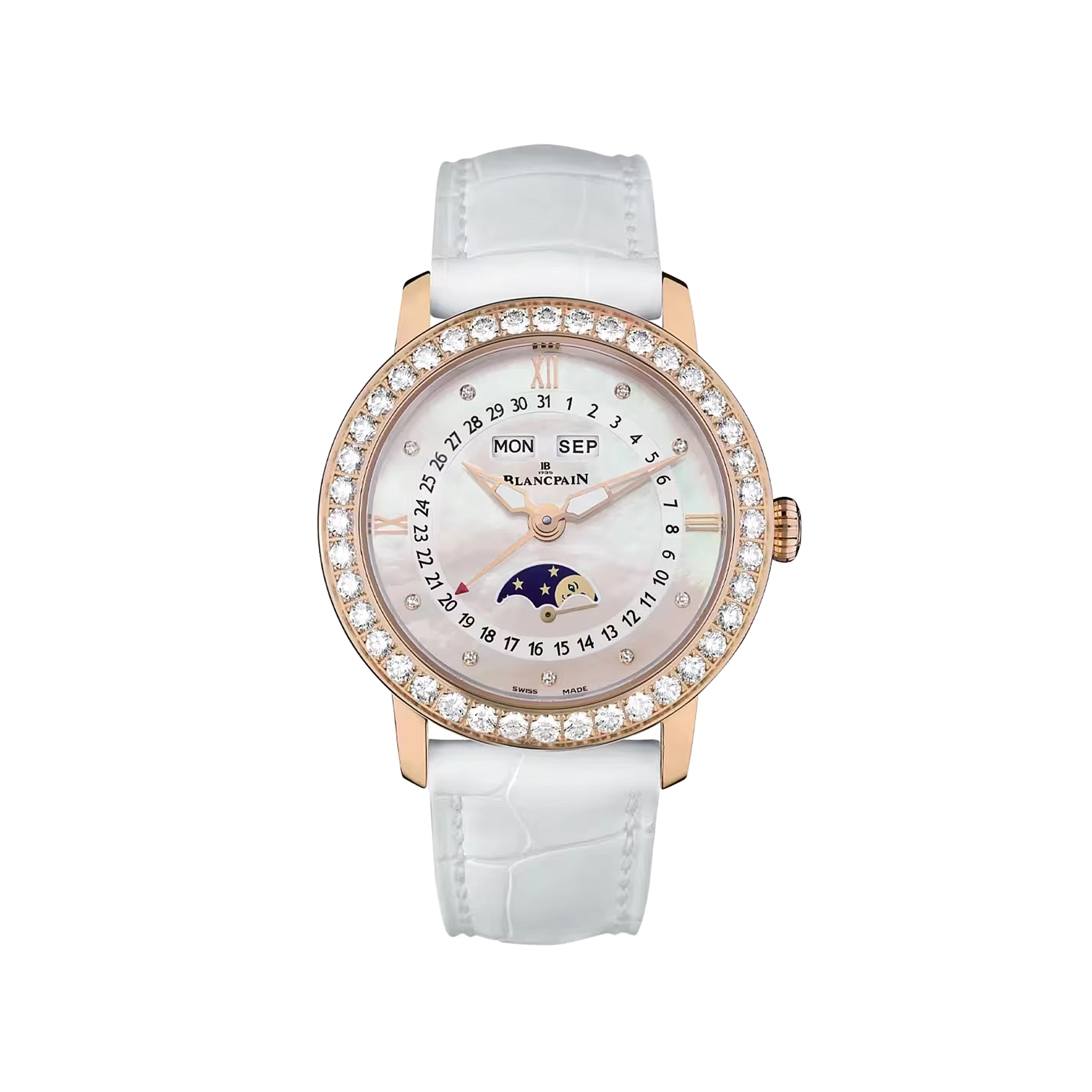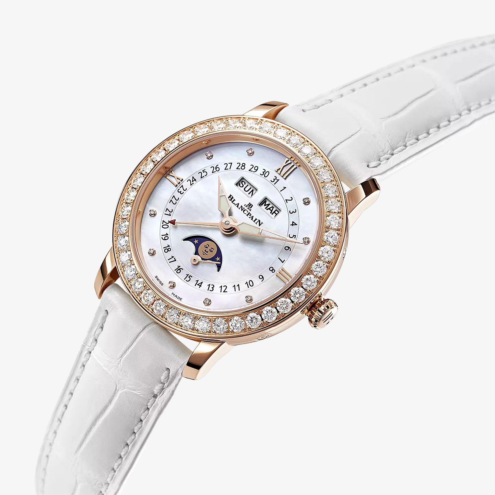Ref. 3663 2954 55B - Die Ladybird Quantième Complet ist ein wahres Meisterwerk, das Eleganz und Kunstfertigkeit nahtlos vereint. Eingefasst in einem 35 mm Gehäuse aus 18-karätigem Rotgold, wird sie von 40 Brillanten auf der Lünette und 9 weiteren Diamanten auf dem Perlmuttzifferblatt umrahmt, die wie Sterne am ruhigen Himmel leuchten. Die vollständige Kalenderkomplikation verfolgt anmutig den Lauf der Tage, während die Mondphasen über das Zifferblatt gleiten und eine poetische Note hinzufügen. Angetrieben vom Automatikaufzug Kaliber 6763, bietet sie eine Gangreserve von 100 Stunden. Ein weißes Alligatorlederarmband mit Faltschließe vervollständigt diese raffinierte Kreation.
