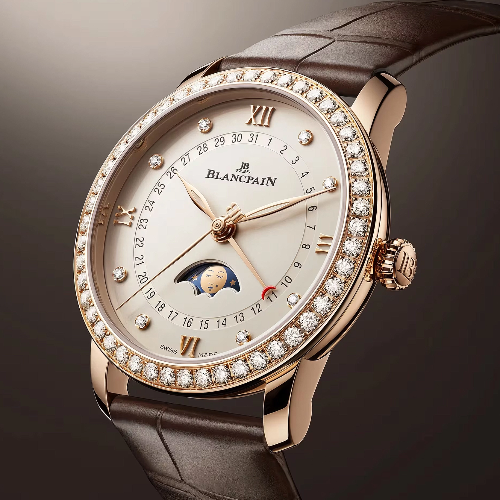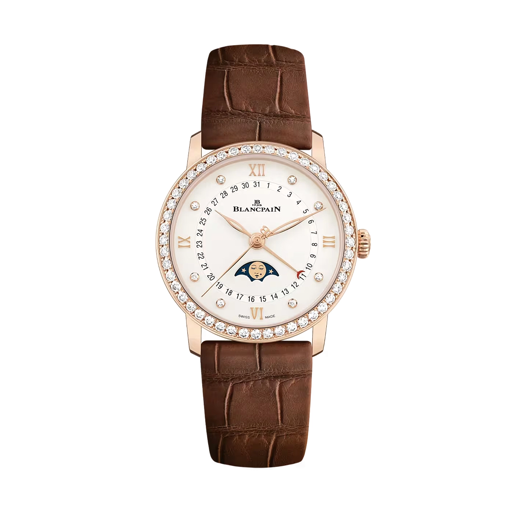 Ref. 6126 2987 55B - Die Villeret Quantième Phases de Lune zeigt Blancpains Kunstfertigkeit in einem 33,2 mm Gehäuse aus 18-karätigem Rotgold. Umgeben von 48 Diamanten auf der Lünette und 8 Diamanten auf dem Zifferblatt, schmücken insgesamt 56 Diamanten diese Uhr. Das opale Zifferblatt zeigt elegant die Mondphasen, den Kalender und die Sekundenkomplikationen. Angetrieben vom Automatikaufzug Kaliber 913QL.P bietet sie eine Gangreserve von 40 Stunden und ist mit einem braunen Alligatorlederarmband und einer Faltschließe ausgestattet.