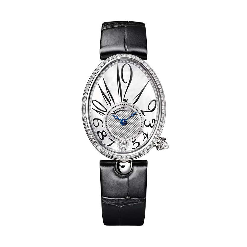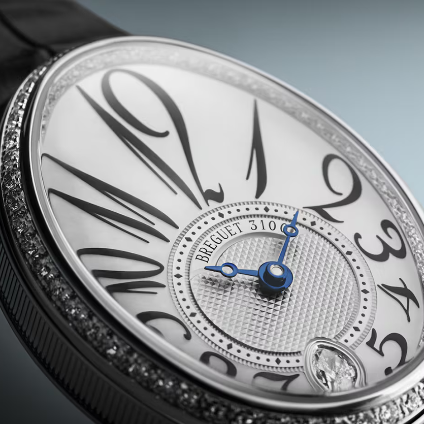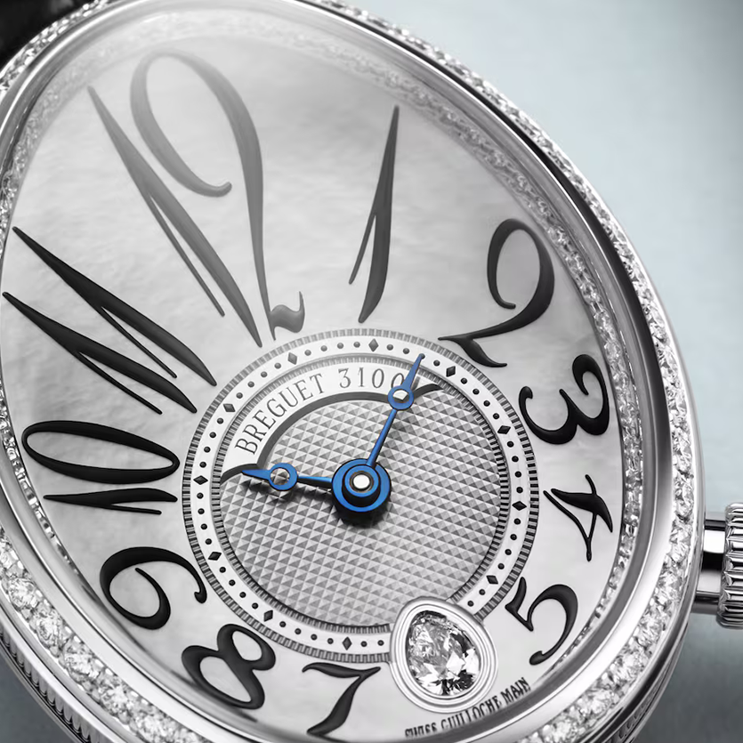 Ref. 8918BB/58/964 D00D 3L - Diese Uhr zeichnet sich durch ihre stark vergrößerten Breguet-Zahlen aus, die sich an das Zifferblatt schmiegen und den Stundenring umschließen. Ergänzt werden sie durch die Breguet-Zeiger mit Pomme-Spitze. Auf der 6-Uhr-Position dieser 36,50 mm x 28,45 mm großen Kreation geben zwei weitere Details den Ton an: ein Stein im Tropfenschliff und ein „Kugel“-Bandanstoß, der den Gehäuserahmen mit dem Armband verbindet. Um dem Ensemble einen zusätzlichen Hauch Glanz zu verleihen, sind die Lünette, der Höhenring und die Krone mit Edelsteinen besetzt.