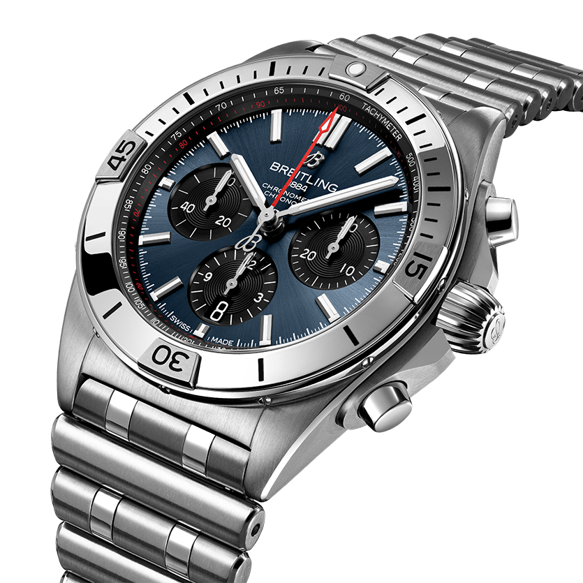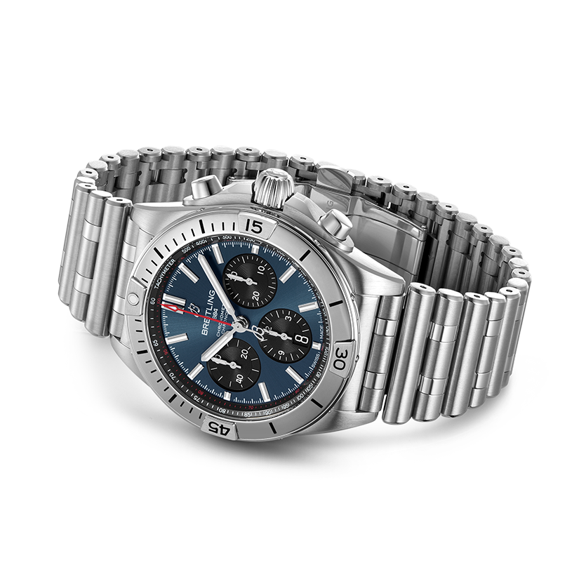 Die Markteinführung erfolgte 1984, zu einer Zeit, in der besonders flache Quarzuhren angesagt waren. Breitling setzte dabei mutig auf eine eindrucksvoll proportionierte mechanische Uhr. Die Chronomat beruht auf dem Chronometer Frecce Tricolori, ...der in Zusammenarbeit mit der berühmten italienischen Flugstaffel entwickelt und 1983 auf dem Markt eingeführt wurde. Mit dem Modell wurde stilvoll das hundertjährige Bestehen von Breitling gefeiert. Es bedeutete die Rückkehr des mechanischen Chronometers zu seiner rechtmässigen herausragenden Stellung innerhalb der Marke, die ihren weltweiten Ruf auf diesen herausragenden Uhren aufbaute. Die Chronomat ist in vielen verschiedenen Materialien erhältlich – angefangen bei Edelstahl bis hin zu luxuriösem 18-karätigem Rotgold. Das Modell verfügt über ein 42-mm-Gehäuse und die legendäre Lünette mit den vier Reitern. Die Chronomat ist mit verschiedenen farbenfrohen Zifferblättern lieferbar und auf das charakteristische Rouleaux-Armband aus Metall oder Kautschuk abgestimmt. Angetrieben wird das Modell vom Breitling-Manufakturkaliber 01, einem COSC-zertifizierten Chronometer.
