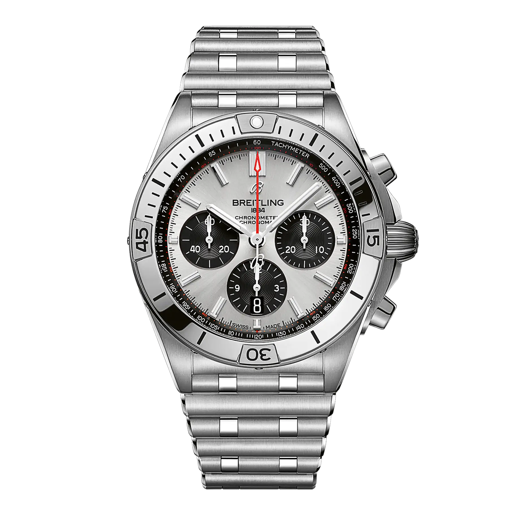 Die Markteinführung erfolgte 1984, zu einer Zeit, in der besonders flache Quarzuhren angesagt waren. Breitling setzte dabei mutig auf eine eindrucksvoll proportionierte mechanische Uhr. Die Chronomat beruht auf dem Chronometer Frecce Tricolori, ...der in Zusammenarbeit mit der berühmten italienischen Flugstaffel entwickelt und 1983 auf dem Markt eingeführt wurde. Mit dem Modell wurde stilvoll das hundertjährige Bestehen von Breitling gefeiert. Es bedeutete die Rückkehr des mechanischen Chronometers zu seiner rechtmässigen herausragenden Stellung innerhalb der Marke, die ihren weltweiten Ruf auf diesen herausragenden Uhren aufbaute. Die Chronomat ist in vielen verschiedenen Materialien erhältlich – angefangen bei Edelstahl bis hin zu luxuriösem 18-karätigem Rotgold. Das Modell verfügt über ein 42-mm-Gehäuse und die legendäre Lünette mit den vier Reitern. Die Chronomat ist mit verschiedenen farbenfrohen Zifferblättern lieferbar und auf das charakteristische Rouleaux-Armband aus Metall oder Kautschuk abgestimmt. Angetrieben wird das Modell vom Breitling-Manufakturkaliber 01, einem COSC-zertifizierten Chronometer.