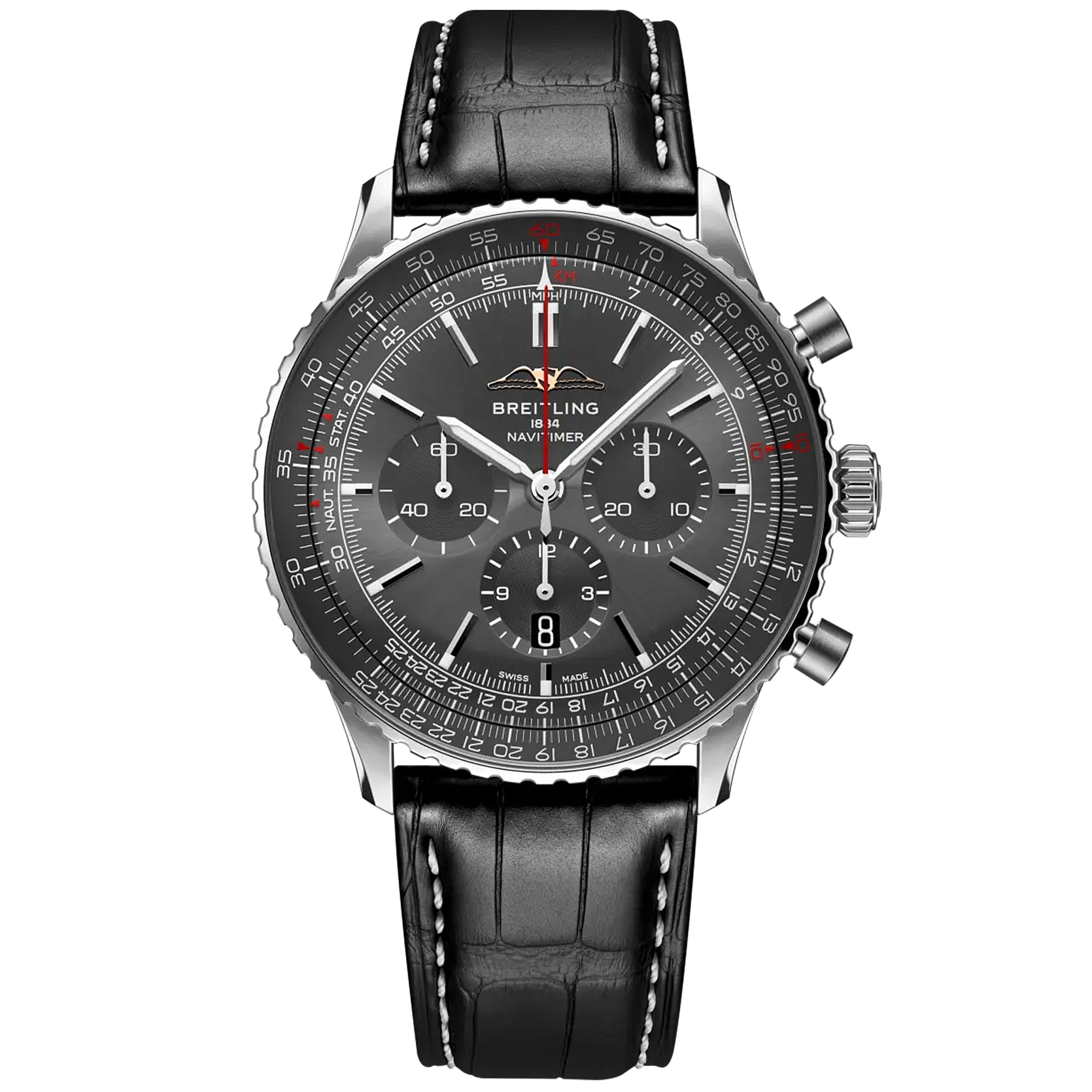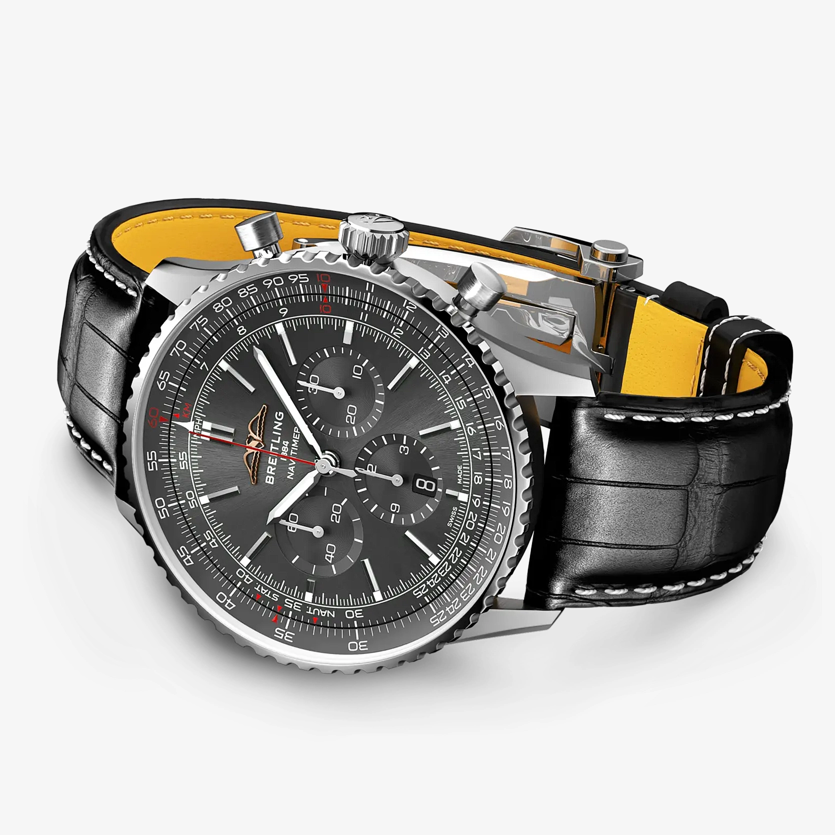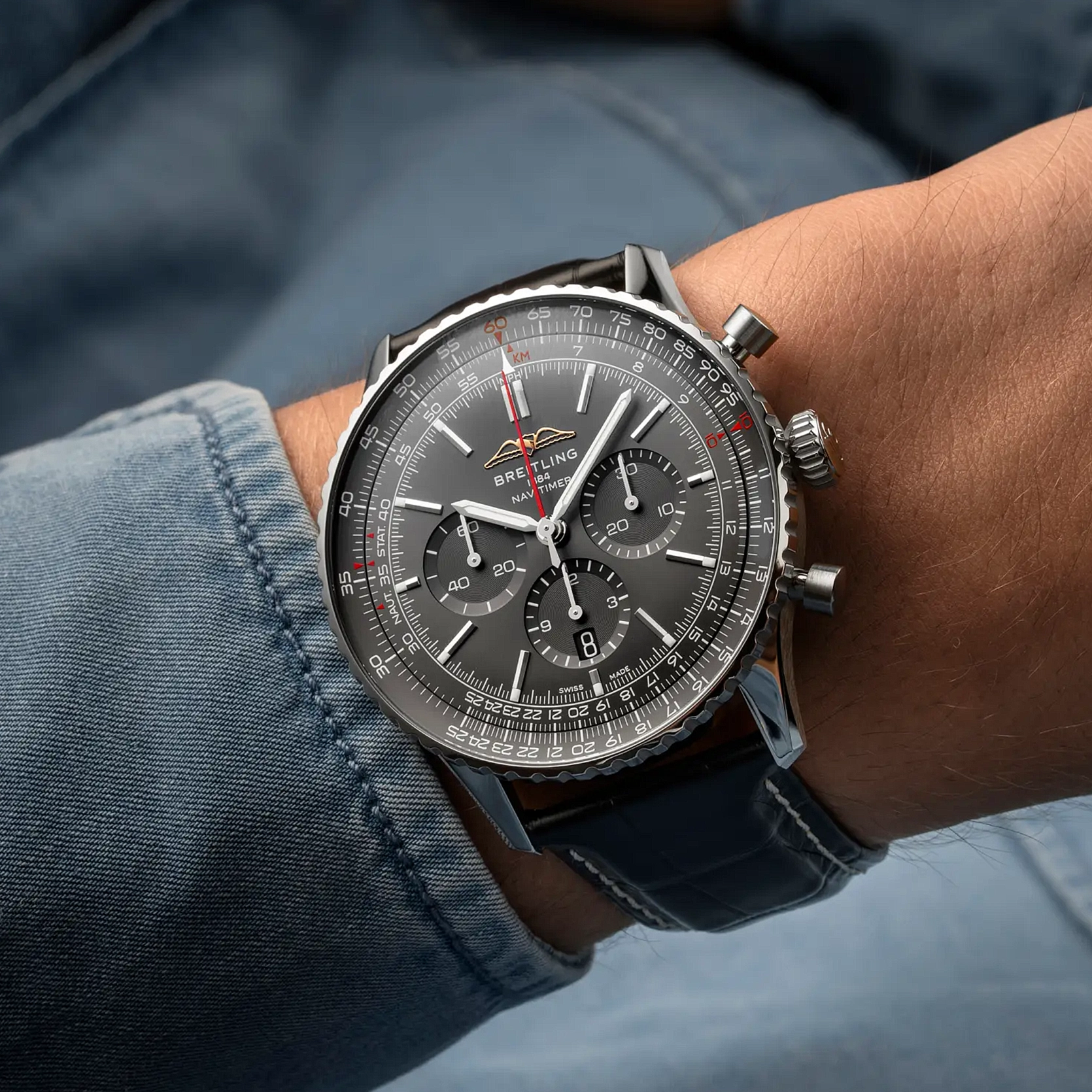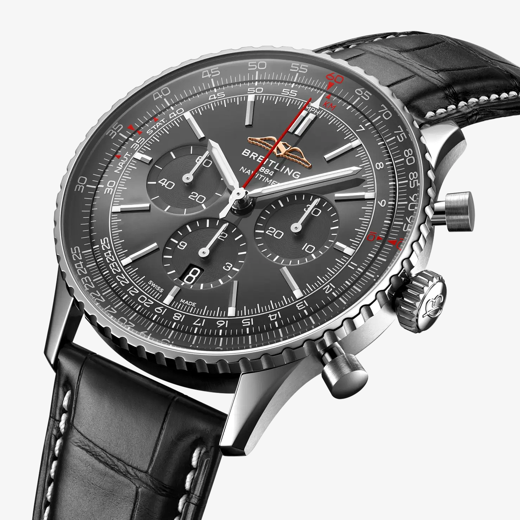 Ref. AB01376A1B1P1 - Der legendäre Fliegerchronograph von Breitling – für die Reise. Im Jahr 1952 entwickelt Willy Breitling einen Chronographen mit einem kreisförmigen Rechenschieber, mit dem Piloten alle notwendigen Flugberechnungen durchführen können. Zwei Jahre später macht die renommierte amerikanische Vereinigung AOPA (Aircraft Owners and Pilots Association) diese Ausführung zu ihrem offiziellen Zeitmesser. Die «Navigation Timer» – oder Navitimer – ist geboren. Die AOPA ist und bleibt der grösste Pilotenverein der Welt und zählt fast jeden US-Piloten zu ihren Mitgliedern. Als De-facto-Fliegeruhr während der glorreichen Ära der zivilen Luftfahrt wurde die Navitimer von Piloten und Flugbegeisterten gleichermassen getragen. 1962 schaffte sie es am Handgelenk des Astronauten Scott Carpenter sogar ins Weltall. Doch nicht nur Piloten waren von der unbändigen Ästhetik der Uhr beeindruckt. Berühmtheiten wie Miles Davis oder Serge Gainsbourg gehörten ebenfalls zu ihren Fans und bewiesen damit, dass die Navitimer nicht nur stilvoll, sondern auch funktional war. Seit ihrer Markteinfürung vor 70 Jahren wurden diverse Modelle dieser Breitling Ikone lanciert, doch diese neue Navitimer überzeugt mit ihren klassischen Eigenschaften, die mithilfe moderner Verbesserungen noch verfeinert wurden. Ein abgeflachter Rechenschieber und ein gewölbtes Glas schaffen den Eindruck eines schlankeren Profils. Der Wechsel von polierten und gebürsteten Metallelementen sorgt für ein schimmerndes und dennoch dezentes Aussehen. Es sind vor allem die neuen Farben in Blau-, Grün- und Kupfertönen, die die aktualisierten Zifferblattoptionen definieren. Und wenn es eine Neuerung gibt, die für Nostalgie sorgen wird, sind es die AOPA-Flügel, die nun wieder dort sind, wo sie ursprünglich waren – bei 12 Uhr. Seit bereits 70 Jahren erfreut sich die Original-Fliegeruhr grosser Beliebtheit bei Piloten und Trendsettern gleichermassen. Getragen von Astronauten im Weltraum und von den grössten Stars der Welt, handelt es sich um den legendärsten Zeitmesser von Breitling und um eine der unverwechselbarsten Uhren aller Zeiten.