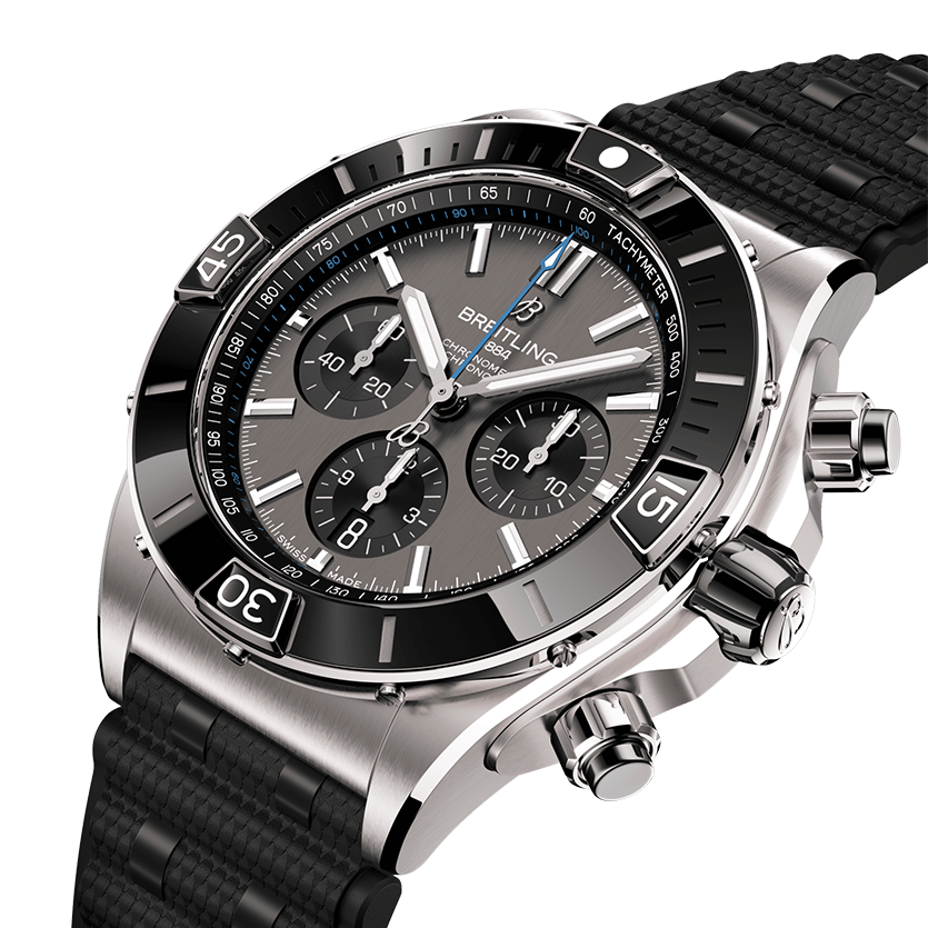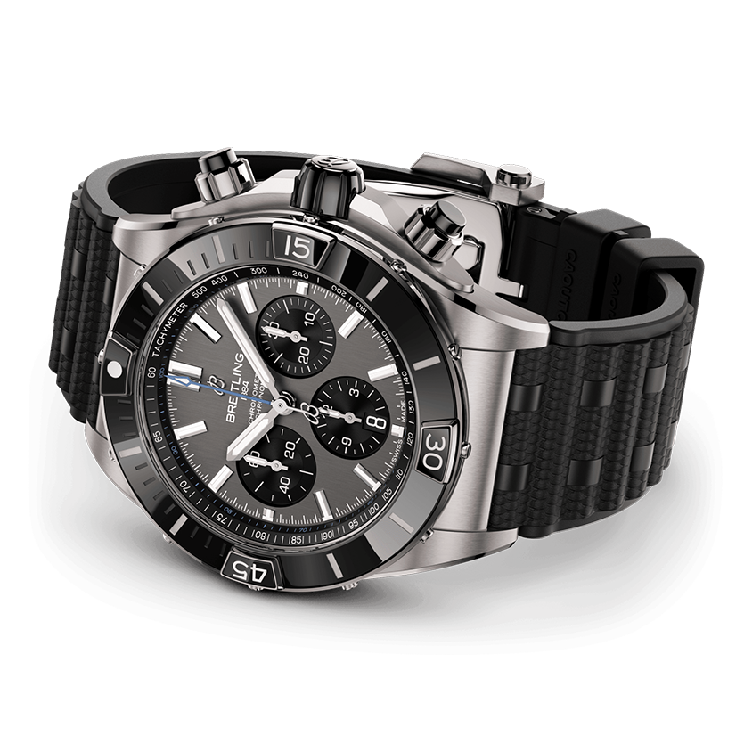 Als wohl auffallendstes Modell dieser Kollektion besticht die Super Chronomat durch mehrere Keramikeinsätze – auf der Lünette, den Chronographendrückern und der Krone – und durch ein Kautschukarmband in Rouleaux-Optik. Sie ist eine vielseitige Sportuhr, ...die sich sowohl im Fitnessstudio als auch auf einer Gala wohlfühlt. Die Super Chronomat ist in verschiedenen Farb- und Metallvarianten erhältlich, von Edelstahl über 18-karätiges Rotgold bis hin zu ultraleichtem Titan. Ergänzt wird sie durch das unverwechselbare Rouleaux-Armband oder durch ein Kautschukarmband in Rouleaux-Optik, jeweils mit passender Faltschliesse. Die Super Chronomat B01 44 wird von einem Breitling-Manufakturkaliber 01, einem COSC-zertifizierten Chronometer, angetrieben.