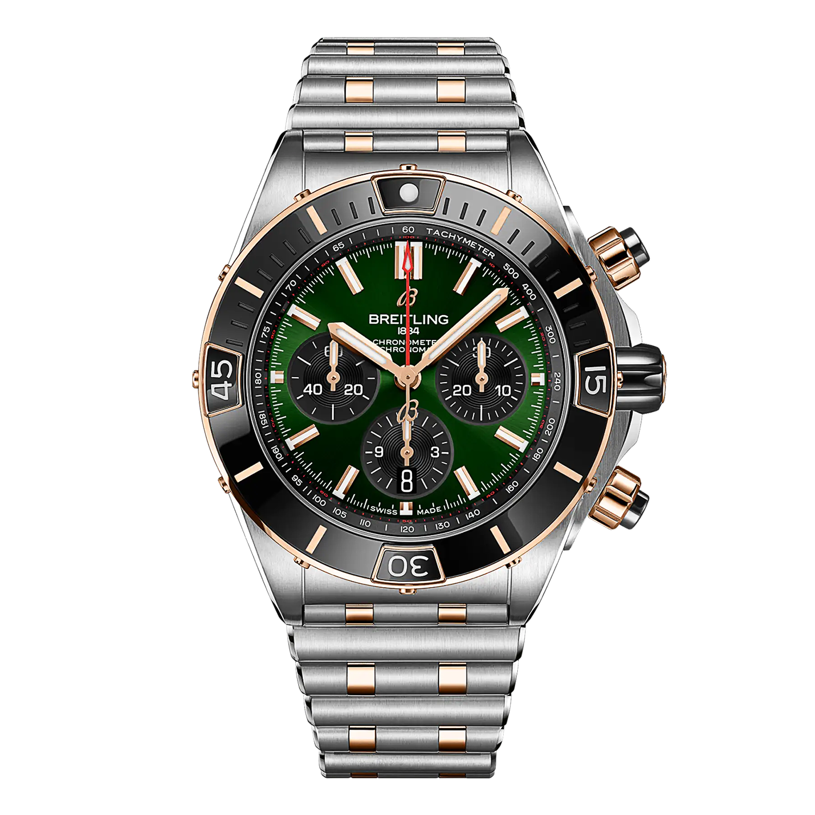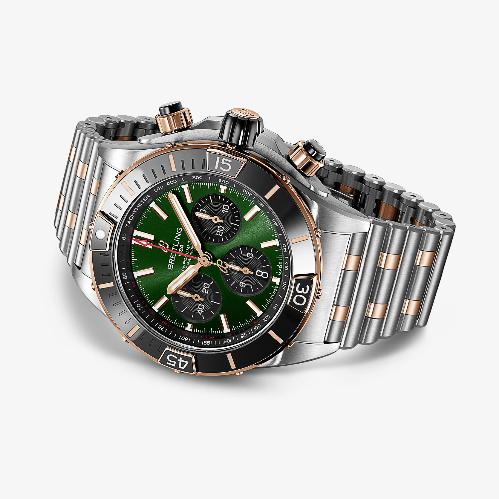 Als wohl auffallendstes Modell dieser Kollektion besticht die Super Chronomat durch mehrere Keramikeinsätze – auf der Lünette, den Chronographendrückern und der Krone – und durch ein Kautschukarmband in Rouleaux-Optik. Bei aller Sportlichkeit ...steht diese Allzweckuhr Ihrem Sinn für Stil aber nicht im Weg. Die Super Chronomat ist in verschiedenen Farb- und Metallvarianten erhältlich, von Edelstahl bis hin zu 18-karätigem Rotgold. Ergänzt wird sie durch das unverwechselbare Rouleaux-Armband oder durch ein Kautschukarmband in der gleichen Optik, jeweils mit passender Faltschliesse. Die Super Chronomat B01 44 wird von einem Breitling-Manufakturkaliber 01, einem COSC-zertifizierten Chronometer, angetrieben.