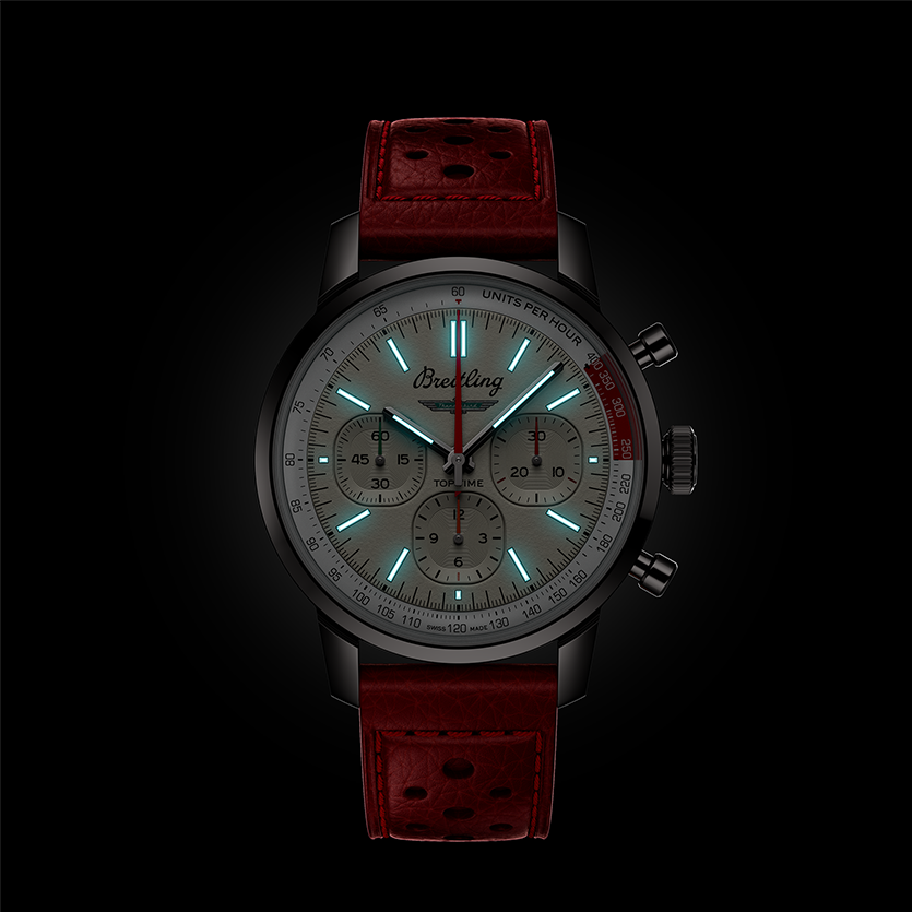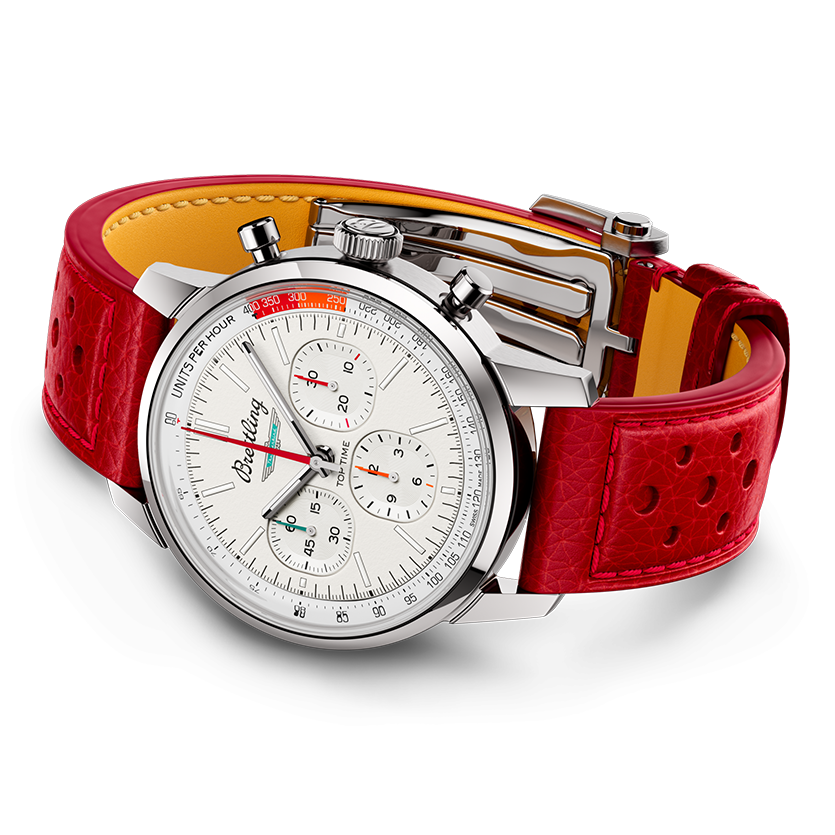 Ob man mit einem Motorrad eine Spritztour machte oder in einem Sportwagen Gas gab, das Leben lief auf Hochtouren. Willy Breitling spürte diesen Tempowechsel und nahm sich vor, einen unkonventionellen Chronographen zu entwickeln, der den Schwung der Epoche ...einfing. Er nannte ihn die Top Time. Diese lebendige Tradition wird auch heute noch fortgesetzt, denn Breitling arbeitet bei der Entwicklung der Top Time mit einigen der angesagtesten Namen der Auto- und Motorradindustrie zusammen. Der Ford Thunderbird wurde zuerst im Jahr 1954 auf der Automobilmesse in Detroit vorgestellt. Das Auto wurde als Cabrio angepriesen, das vor allem für jede Menge Fahrspass stand und sich durch sein luxuriöses Design, seine solide Bauweise und seine dramatische Heckflosse auszeichnete. Die Top Time B01 Ford Thunderbird verfügt über die Farben und das Emblem ihres Oldtimer-Pendants sowie über ein perforiertes Lederarmband, eine Tachymeterskala und kontrastierende «Squircle»-Zifferblätter (nicht ganz quadratisch, nicht ganz rund), die die besondere Atmosphäre klassischer Armaturenbretter erzeugen. Zudem hat sie einen Motor unter der Haube, mit dem man sich sehen lassen kann: das aussergewöhnliche Breitling-Manufakturkaliber 01.