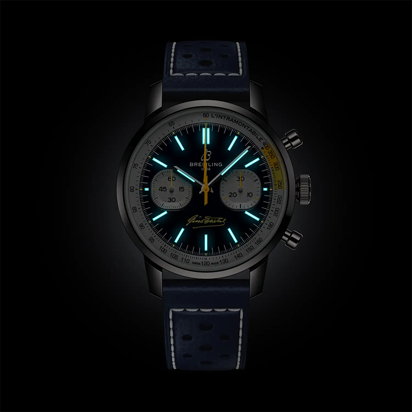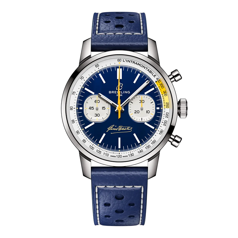 Ref. AB01767A1C1X1 - Die in den 1960er Jahren eingeführte, unkonventionelle, vom Rennsport inspirierte Chronographenlinie von Willy Breitling fing die freizügige Atmosphäre dieser Ära ein. Heute verkörpert die neue Top Time Kollektion diese adrenalingeladene Energie und verbindet modernes Retro-Design mit innovativer Leistung. Fausto Coppi und Gino Bartali waren nicht nur Weltmeister, sondern Symbole des Sportsgeistes. Beide waren Botschafter von Breitling zu einer Zeit, als die Marke offizieller Zeitnehmer der grössten Rennen des Radsports war und ihre Liebe zum Sport ein Millionenpublikum inspirierte. Die Top Time B01 Gino Bartali zeigt sich mit einem blauen Zifferblatt mit gelben Akzenten, das von seinem legendären Trikot inspiriert ist. Der Chronograph trägt Bartalis Spitznamen auf der Tachymeterskala: «L’Intramontabile» (Der Zeitlose) und seine Signatur bei sechs Uhr macht die Verbindung noch persönlicher. Der 41-mm-Chronograph läuft auf dem Manufakturkaliber 01 von Breitling und bietet COSC-zertifizierte Präzision und eine Gangreserve von 70 Stunden. Der transparente Gehäuseboden gibt den Blick auf das filigrane Uhrwerk frei, dessen äusserer Ring mit «Gino Bartali Tribute» und «One of 750» graviert ist. Damals unvergesslich, heute neu interpretiert: Die Top Time B01 Bartali ist eine Hommage an die Widerstandsfähigkeit und die Freundschaften, die selbst im härtesten Wettbewerb geschmiedet wurden.