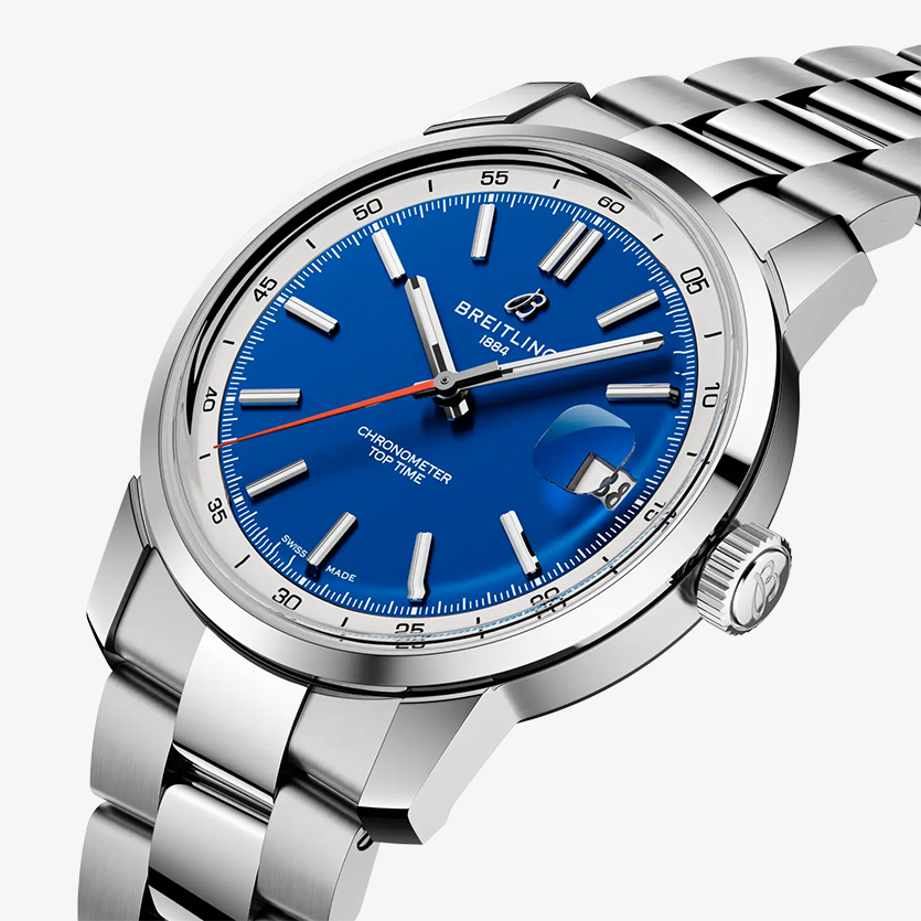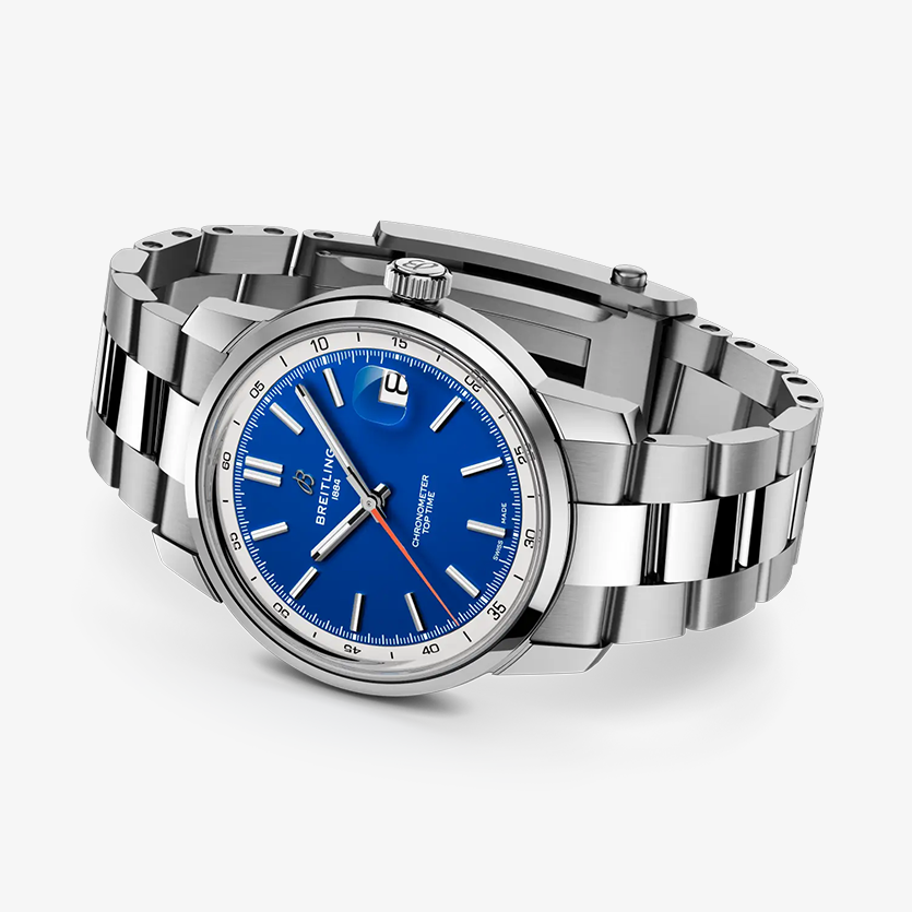 Ref. AB3113A71C1A1 - Die im Jahr 2025 neu lancierte Top Time B31 stellt das Debüt des Manufakturwerks B31 im Hause Breitling dar. Das 38-mm-Gehäuse bleibt der DNA der Top Time treu und gewährleistet einen makellosen Stil, der an jedes Handgelenk passt. Die Top Time B31 vereint Retro-Ästhetik mit modernem Anspruch. Das Design des Zifferblatts ist von den Armaturenbrettern der Oldtimer inspiriert, während das 38-mm-Gehäuse ein Gleichgewicht zwischen Vintage-Proportionen und modernem Design schafft und dank seiner universellen Grösse an jedes Handgelenk passt. Drei Farbvarianten – Grün, Blau oder eine zweifarbige Kombination aus Weiss und Himmelblau – werden entweder mit einem dreireihigen Edelstahlarmband oder einem perforierten Kalbslederarmband kombiniert, das an Rennhandschuhe erinnert. Diese Uhr zelebriert Individualität und Abenteuer, egal ob auf offener Strasse oder einfach im Alltag.