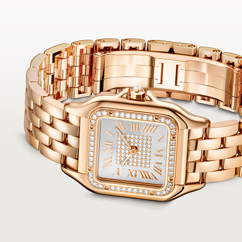 Ref. WJPN0041 - Panthère de Cartier, mittleres Modell, Quarzwerk. Gehäuse aus 750er Roségold, mit 44 Diamanten im Brillantschliff von insgesamt 0,28 Karat besetzt. Maße: 36,5 mm x 26,7 mm. Höhe: 6,8 mm. Mehrkantaufzugskrone aus 750er Roségold, mit einem Diamanten im Brillantschliff von 0,02 Karat besetzt. Versilbertes Zifferblatt mit Sonnenschliff, mit 60 Diamanten im Brillantschliff von insgesamt 0,22 Karat besetzt, schwertförmige Zeiger in Roségold-Finish. Armband aus 750er Roségold. Wasserdicht bis zu 3 bar.