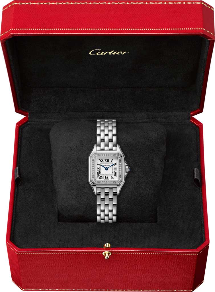 Ref. W4PN0007 - Panthère de Cartier, kleines Modell, Quarzwerk. Gehäuse aus Edelstahl, Lünette mit 36 Diamanten im Brillantschliff von insgesamt 0,24 Karat besetzt. Maße: 23 mm x 30 mm. Höhe: 6 mm. Krone mit einem synthetischen blauen Spinell besetzt, silberfarbenes Zifferblatt, gebläute Zeiger in Schwertform, Armband aus Edelstahl. Wasserdicht bis zu 3 bar.