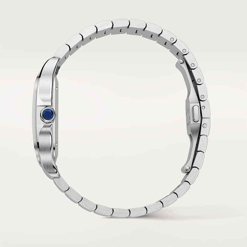 Ref. WSSA0064 - Santos de Cartier, mittleres Modell, mechanisches Uhrwerk mit Automatikaufzug, Kaliber 1847 MC. Gehäuse aus Stahl, Mehrkantaufzugskrone mit einem facettierten synthetischen blauen Spinell besetzt, braun verlaufendes Zifferblatt mit satiniertem Sonnenschliff, schwertförmige Zeiger aus poliertem rhodiniertem Stahl mit Leuchtbeschichtung, Saphirglas. Armband aus Stahl mit „SmartLink“-System zur Längenanpassung. Zweites Armband aus braunem Alligatorleder mit austauschbarer Doppeltfaltschließe aus Stahl. Beide Armbänder sind mit dem QuickSwitch-Armbandwechselsystem ausgestattet. Gehäusebreite: 39,8 mm. Höhe: 9,38 mm. Wasserdicht bis zu 10 bar.