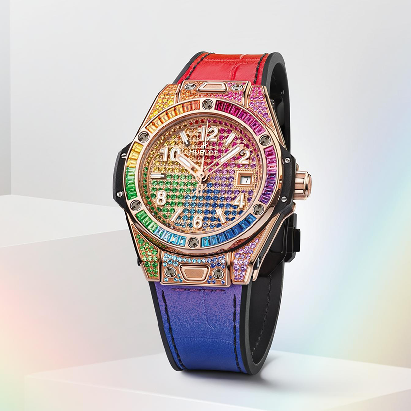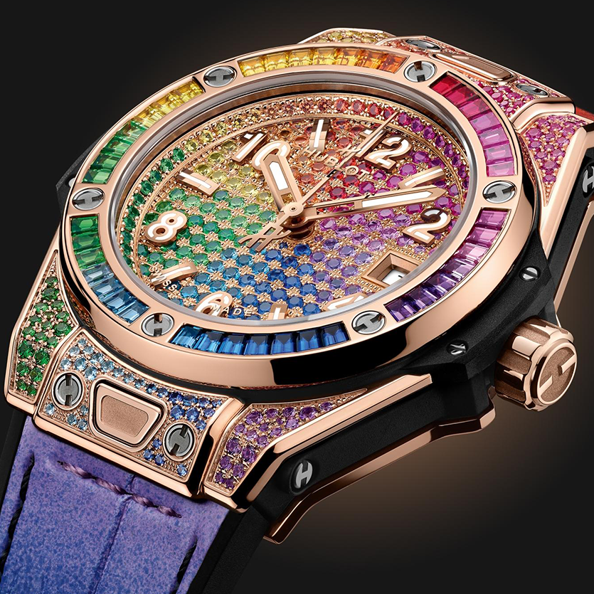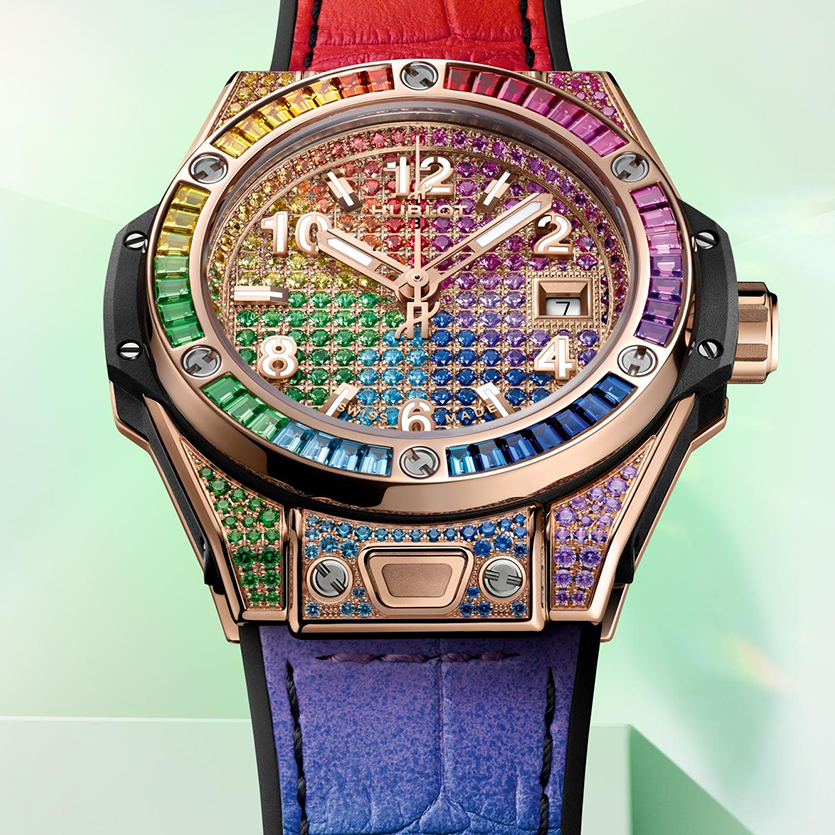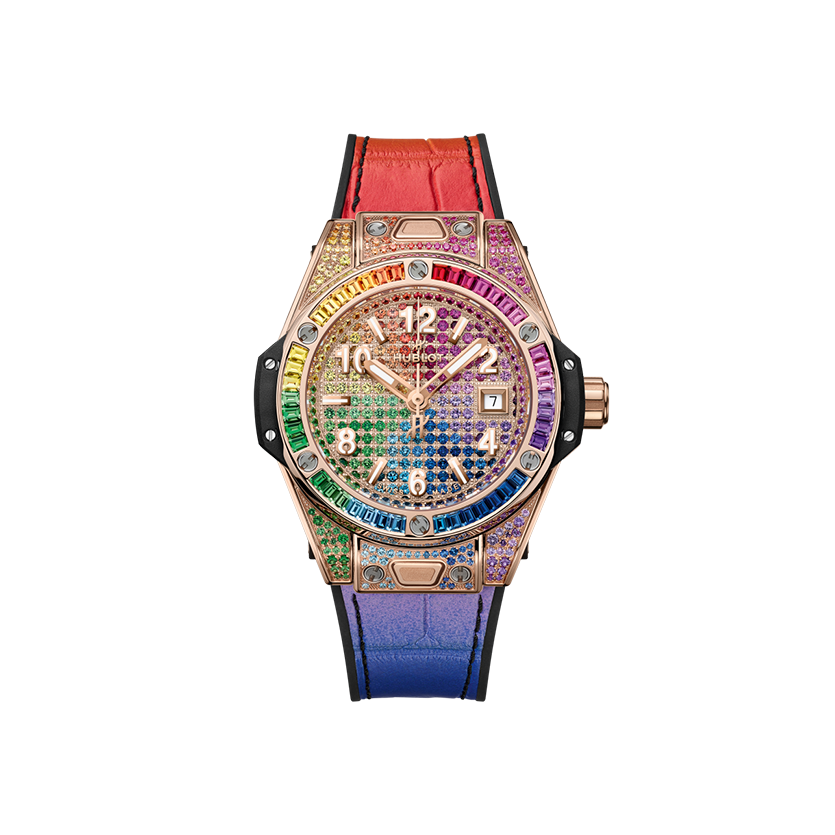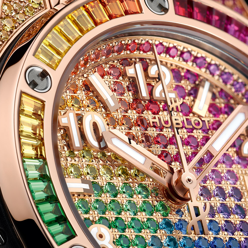 Poliertes 18 Karat King Gold besetzt mit 42 farbigen Edelsteinen im Baguetteschliff