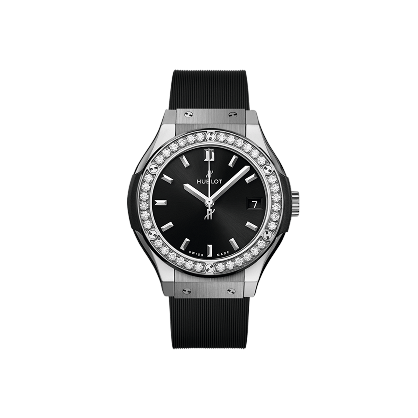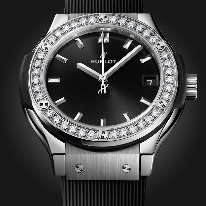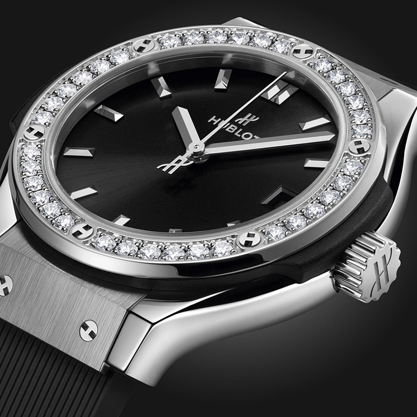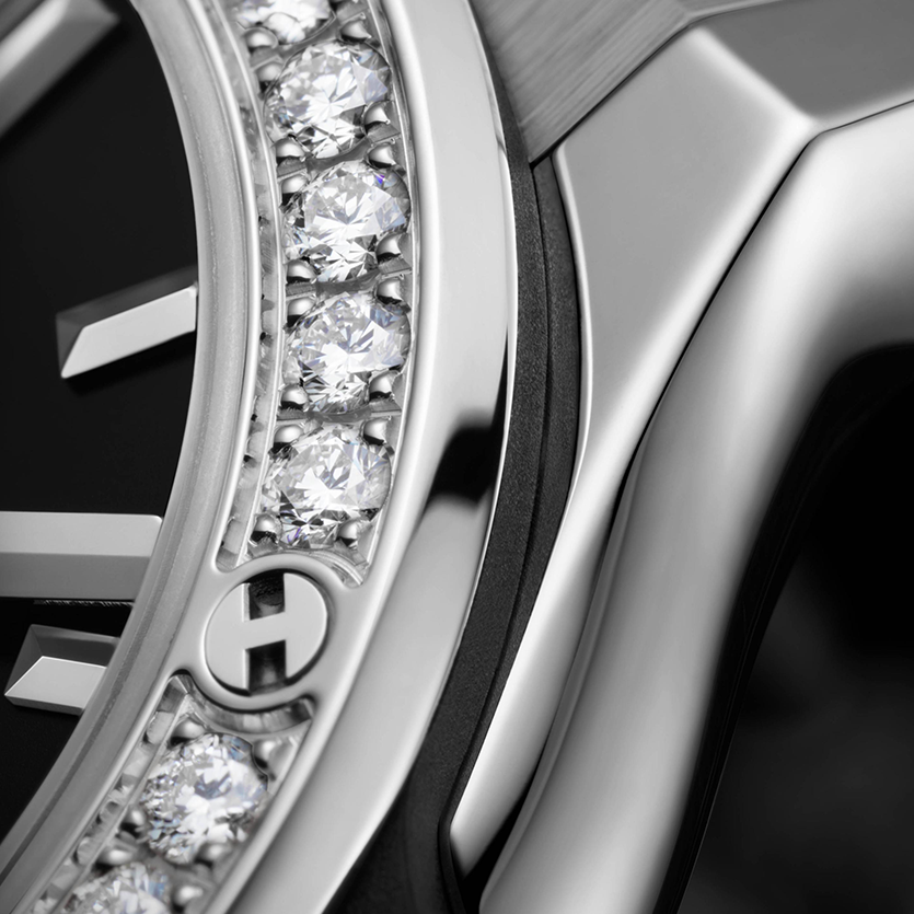 Poliertes Titan besetzt mit 36 Diamanten von insgesamt 0.8 ct und mit 6 H-förmigen Schrauben aus Titan versehen