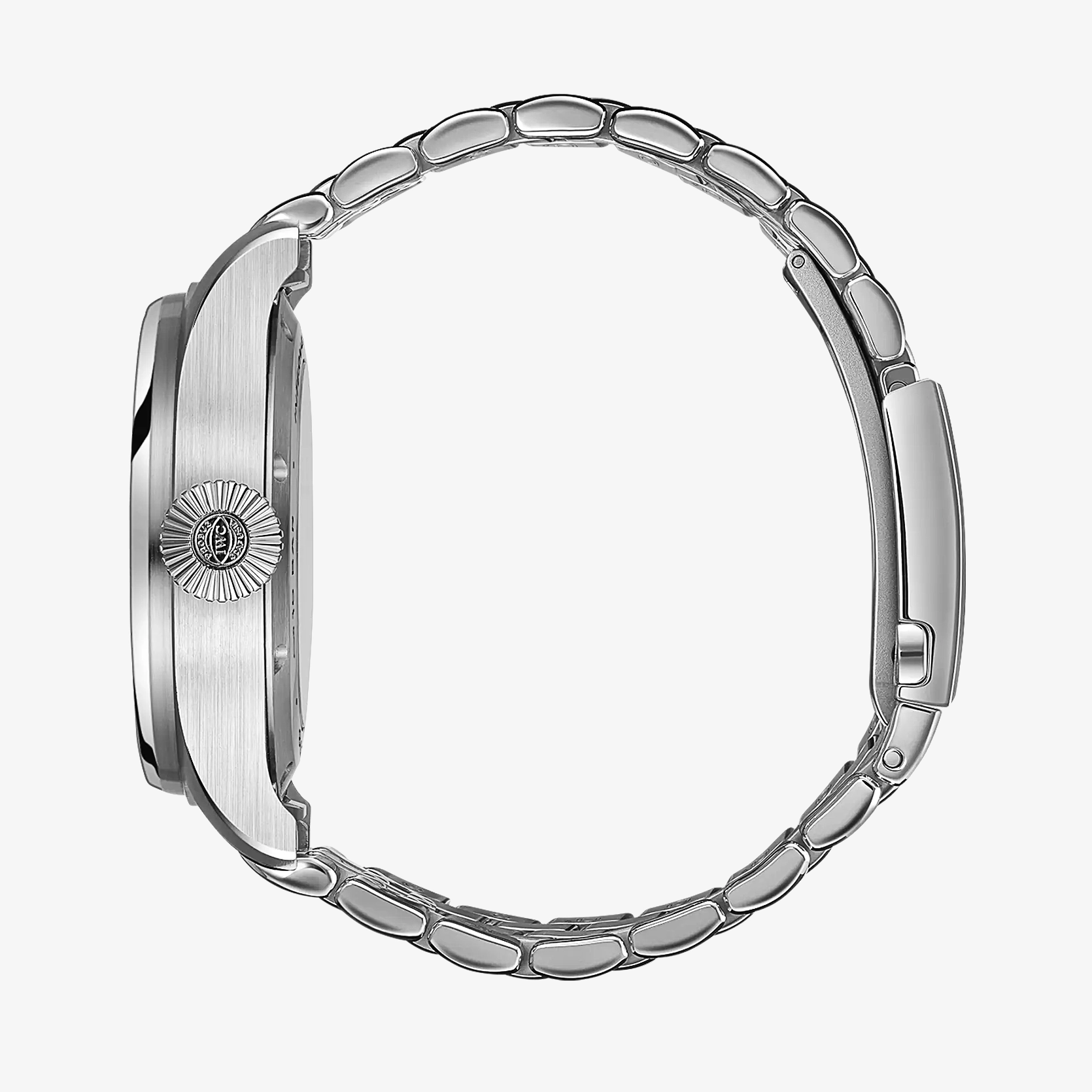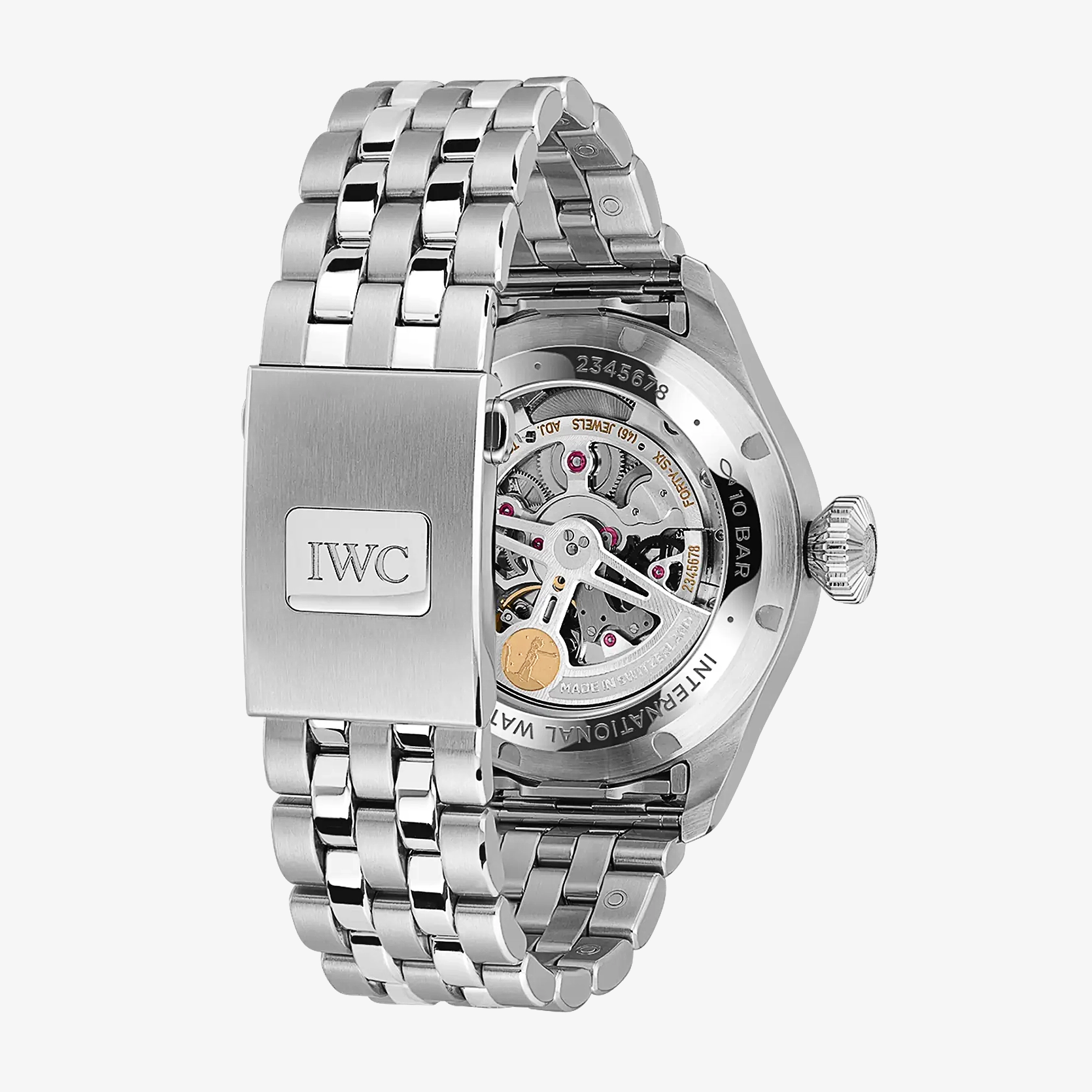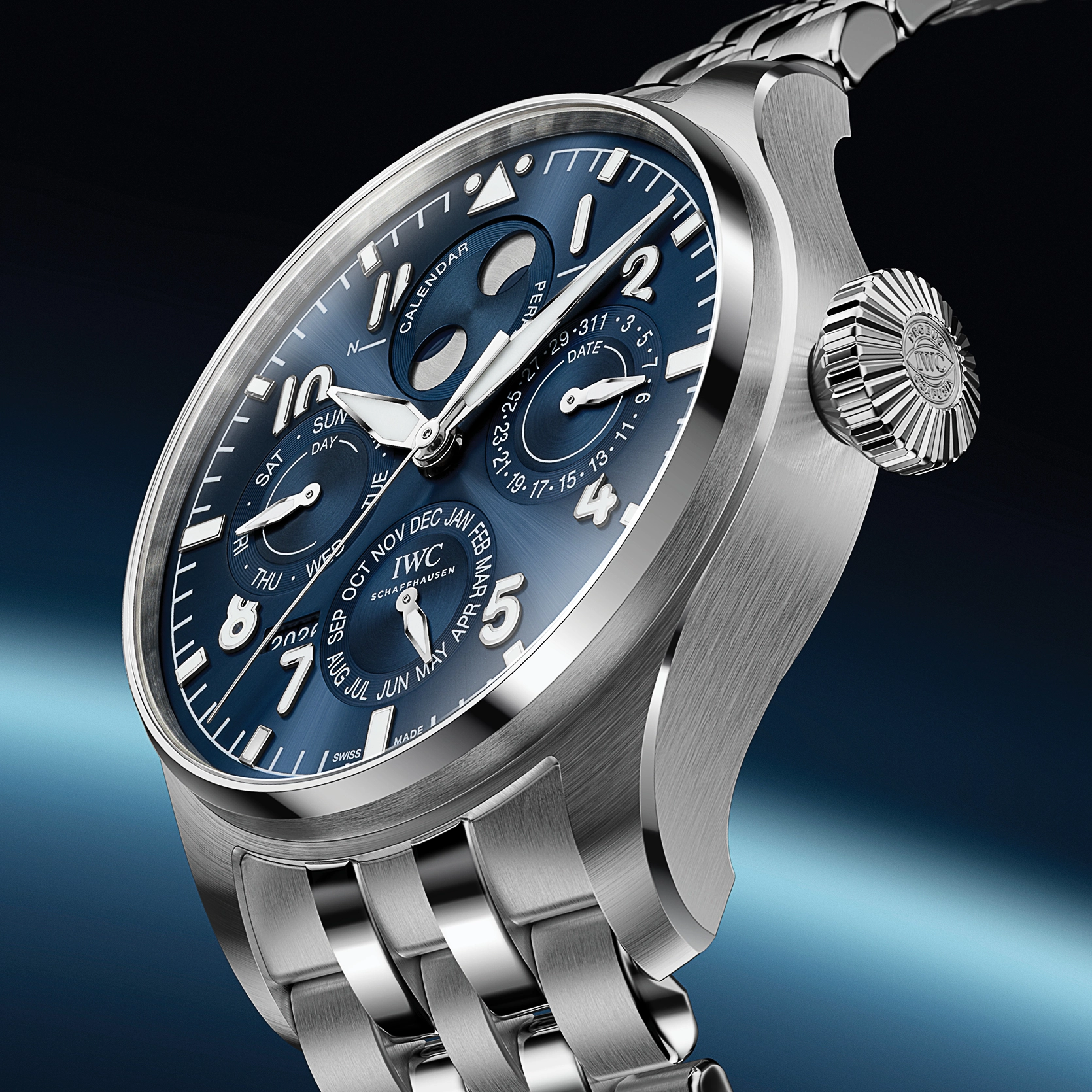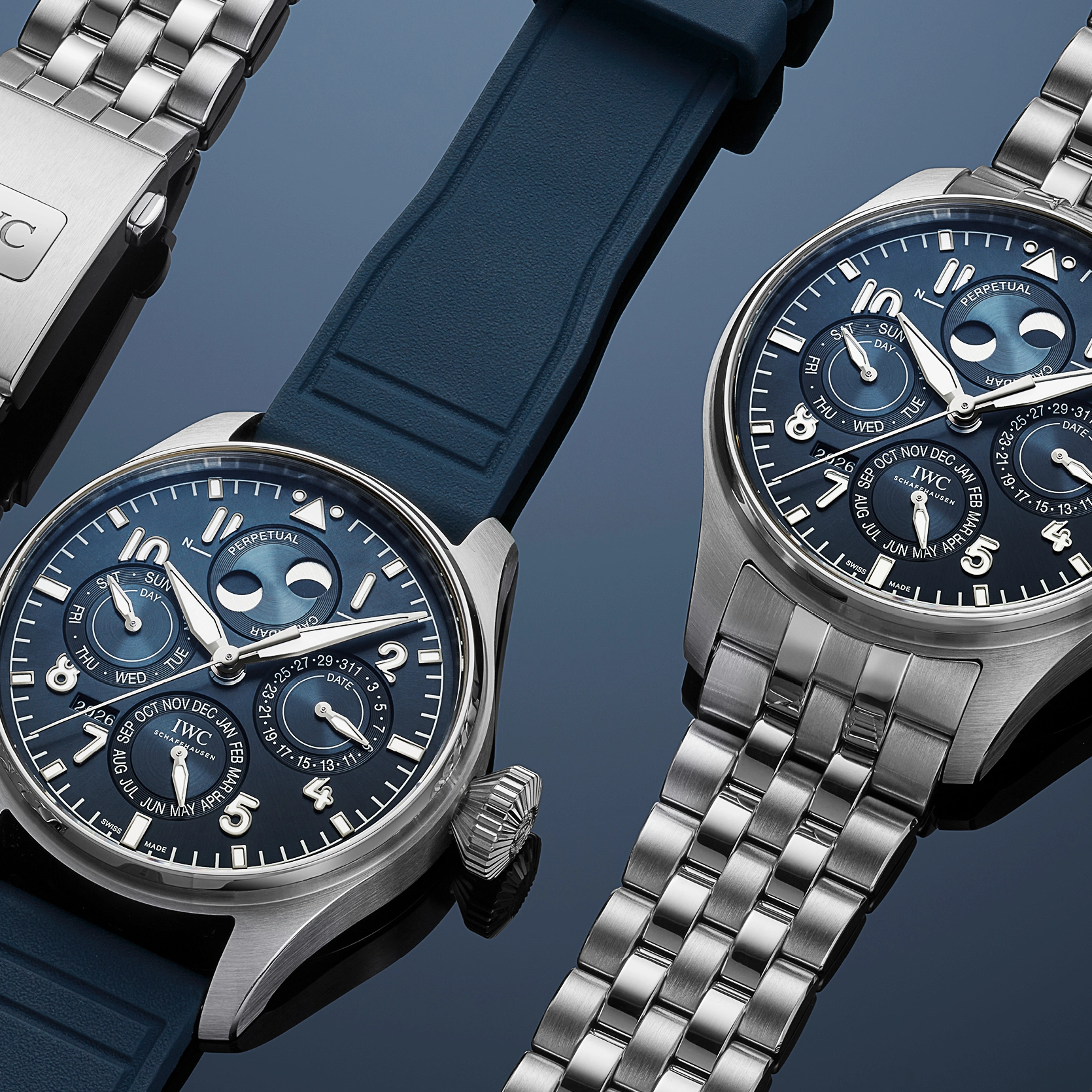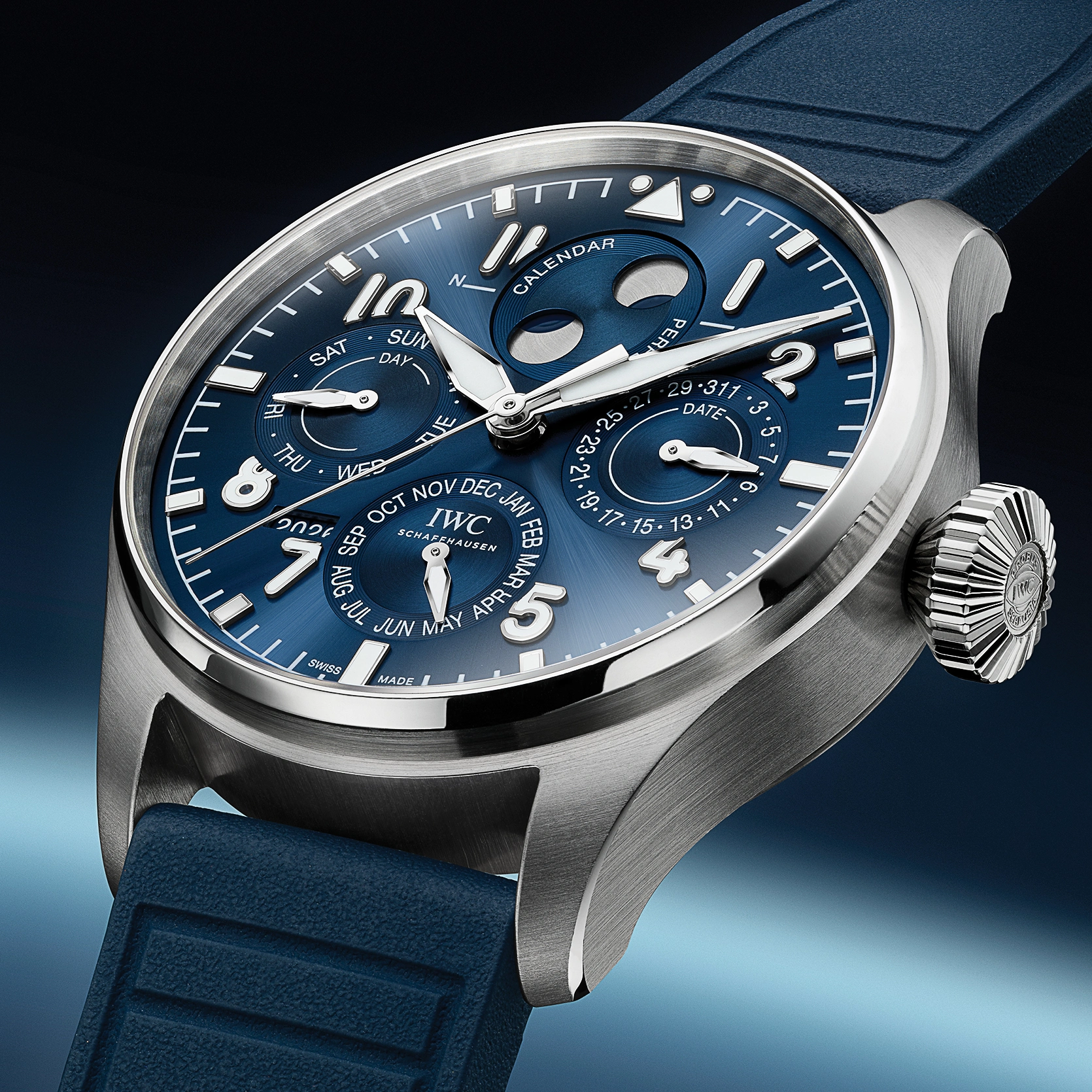 Zahlreiche Komponenten verfügen über hochkomplexe Geometrien und werden daher im sogenannten LIGA-Verfahren hergestellt – einer hochpräzisen Mikrostrukturtechnologie, die Lithographie und Galvanik kombiniert. Der Kalender zeigt Datum, Wochentag, Monat und Mondphase auf vier Hilfszifferblättern an. Die charakteristische vierstellige Jahresanzeige befindet sich zwischen 7 und 8 Uhr. Das Räderwerk der Mondphasenanzeige wurde grundlegend überarbeitet, sodass die Anzeige erst nach 1040 Jahren um einen Tag von der tatsächlichen Umlaufbahn des Mondes abweicht. Die IWC-typische Double Moon® Anzeige zeigt den Mond, wie er sowohl von der nördlichen als auch von der südlichen Hemisphäre aus gesehen wird. Das Kalendermodul ist in das IWC-Manufakturkaliber 82665 integriert. Der Pellaton-Aufzug wurde mit Komponenten aus nahezu verschleissfreier Keramik verstärkt und baut zuverlässig eine Gangreserve von 60 Stunden in der Zugfeder auf. Neben dem Edelstahlarmband wird die Uhr zusätzlich mit einem blauen Kautschukarmband geliefert. Sowohl das Metallarmband als auch das Kautschukarmband verfügen über das EasX-CHANGE® System von IWC, das einen schnellen und werkzeuglosen Wechsel des Armbands auf Knopfdruck ermöglicht.