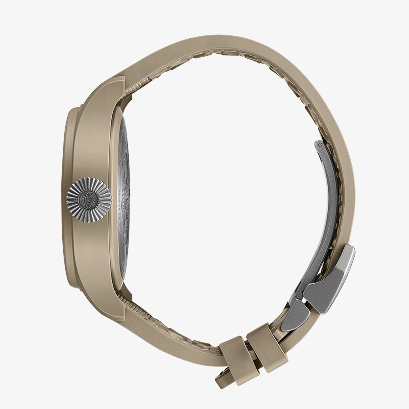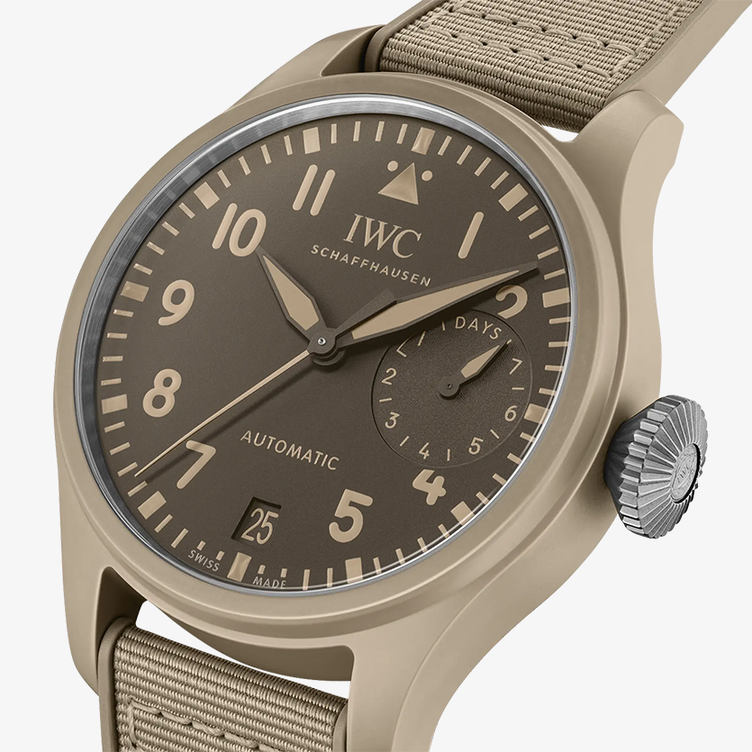 Das dunkelbraune getönte Zifferblatt und das sandfarbene Kautschukarmband mit Textileinlage harmonieren perfekt mit dem Gehäuse. Für Präzision und Ausdauer sorgt das IWC-Manufakturkaliber 52110. Der automatische Pellaton-Aufzug wurde mit Keramikkomponenten verstärkt und baut in zwei Federhäusern eine Gangreserve von 7 Tagen auf – mehr als genug auch auf ausgedehnten Missionen.