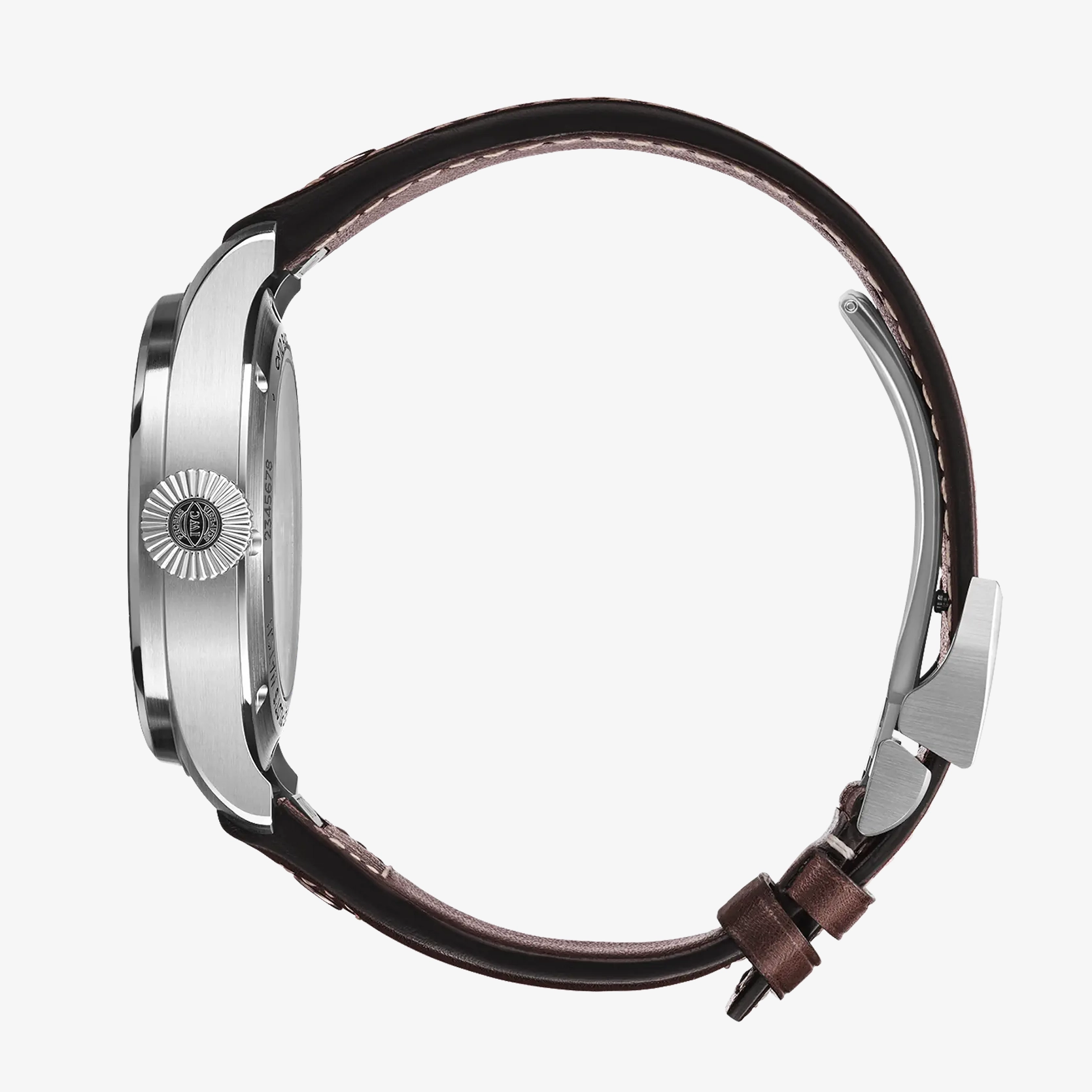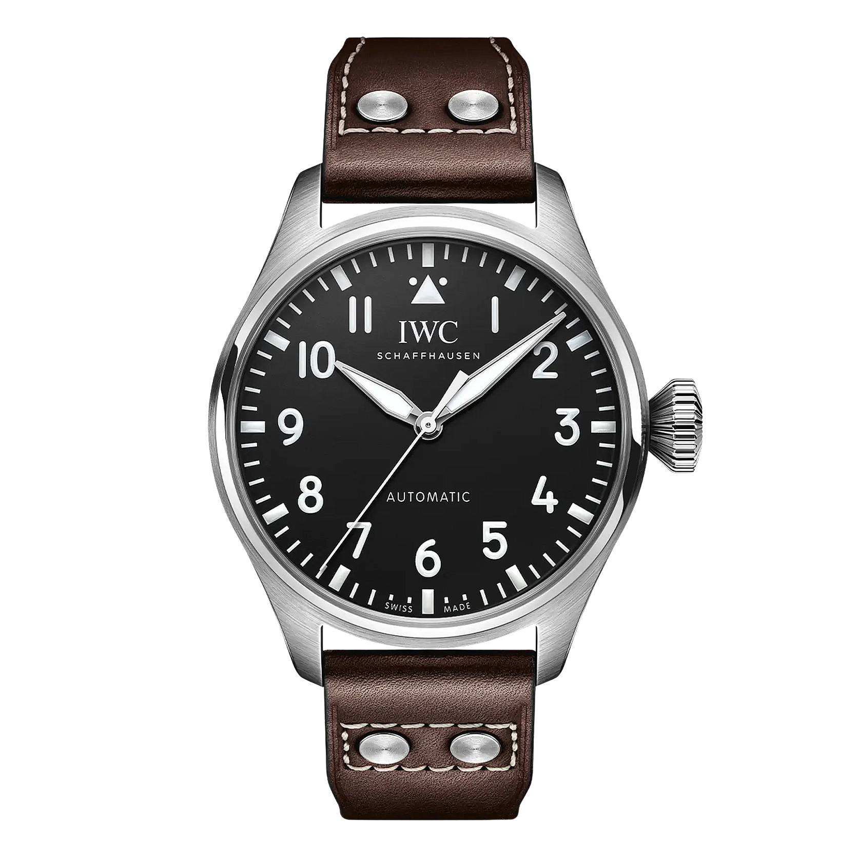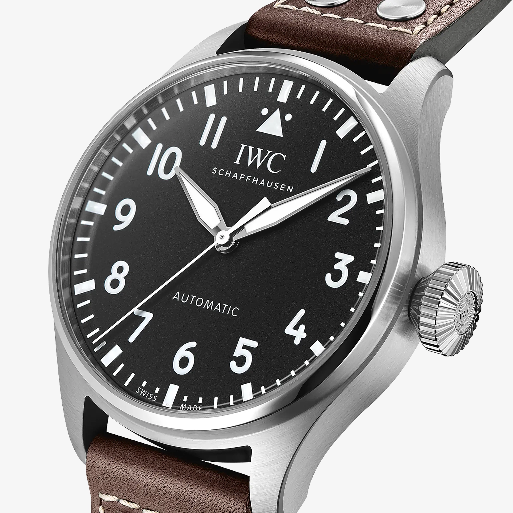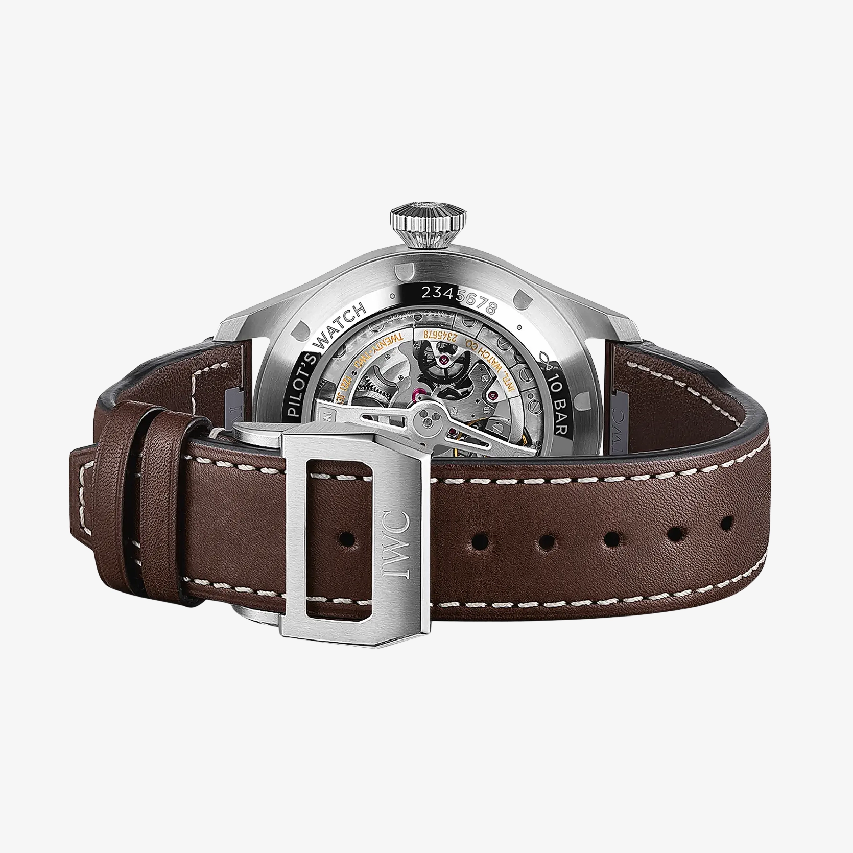 Kein anderes Modell verkörpert die Faszination der Fliegeruhren von IWC Schaffhausen wie die Big Pilot’s Watch. Das funktionale Design im Stil eines einfach ablesbaren Cockpit-Instruments und die übergrosse Kegelkrone wurden von einer militärischen Beobachtungsuhr aus den 1940er-Jahren inspiriert. Die Big Pilot’s Watch 43 ist eine puristische Interpretation dieses ursprünglichen Designs ohne zusätzliche Elemente auf dem Zifferblatt in einem 43-Millimeter-Edelstahlgehäuse, das eine erstaunliche Präsenz am Handgelenk mit höchstem Tragekomfort verbindet. Dieses Modell verfügt über ein schwarzes Zifferblatt, rhodinierte Zeiger und ein braunes Kalbslederarmband. Durch den Saphirglasboden sichtbar ist das IWC-Manufakturkaliber 82100. Der Pellaton-Aufzug wurde mit Keramikkomponenten verstärkt und baut eine Gangreserve von 60 Stunden auf. Für Flexibilität sorgt das praktische EasX-CHANGE System sowie eine Auswahl von Armbändern aus Kalbsleder, Kautschuk oder Edelstahl. In Verbindung mit dem bis 10 bar wasserdichten Gehäuse macht es die Big Pilot’s Watch 43 zu einer modernen und vielseitigen Sportuhr.