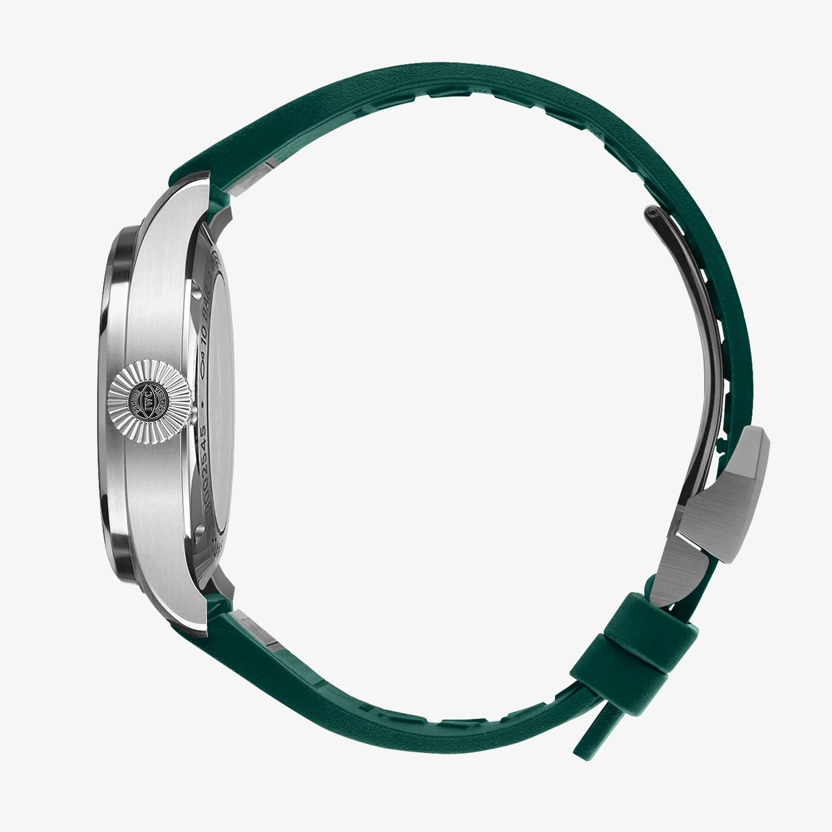 Einfach ablesbares Zifferblatt im charakteristischen Instrumenten-Design, markante Kegelkrone und mutige Präsenz am Handgelenk: Die Big Pilot’s Watch 43 ist eine Big Pilot durch und durch – in einem ergonomischen und gut tragbaren Gehäusedurchmesser von 43 Millimetern. Das Zifferblatt mit drei Zeigern verzichtet auf zusätzliche Elemente wirkt deshalb ausserordentlich übersichtlich und klar. Dieses Modell verfügt über ein Edelstahlgehäuse, ein Zifferblatt in „Racing Green“ sowie rhodinierte Zeiger. Die Leuchtmasse auf dem Zifferblatt und den Zeigern sorgt für eine optimale Ablesbarkeit auch in der Nacht. Durch den Sichtboden aus Saphirglas lässt sich das IWC-Manufakturkaliber 82100 betrachten. Sein automatischer Pellaton-Aufzug ist mit Komponenten aus nahezu verschleissfreier Keramik ausgestattet und baut eine Gangreserve von 60 Stunden auf. Die Uhr wird an einem grünen Kautschukarmband mit vier Nieten getragen. Dank des integrierten EasX-CHANGE® lässt sich das Armband ganz einfach per Knopfdruck wechseln. In Verbindung mit dem bis 10 bar wasserdichten Gehäuse macht diese Flexibilität die Big Pilot’s Watch 43 zu einer sehr vielseitigen Sportuhr.