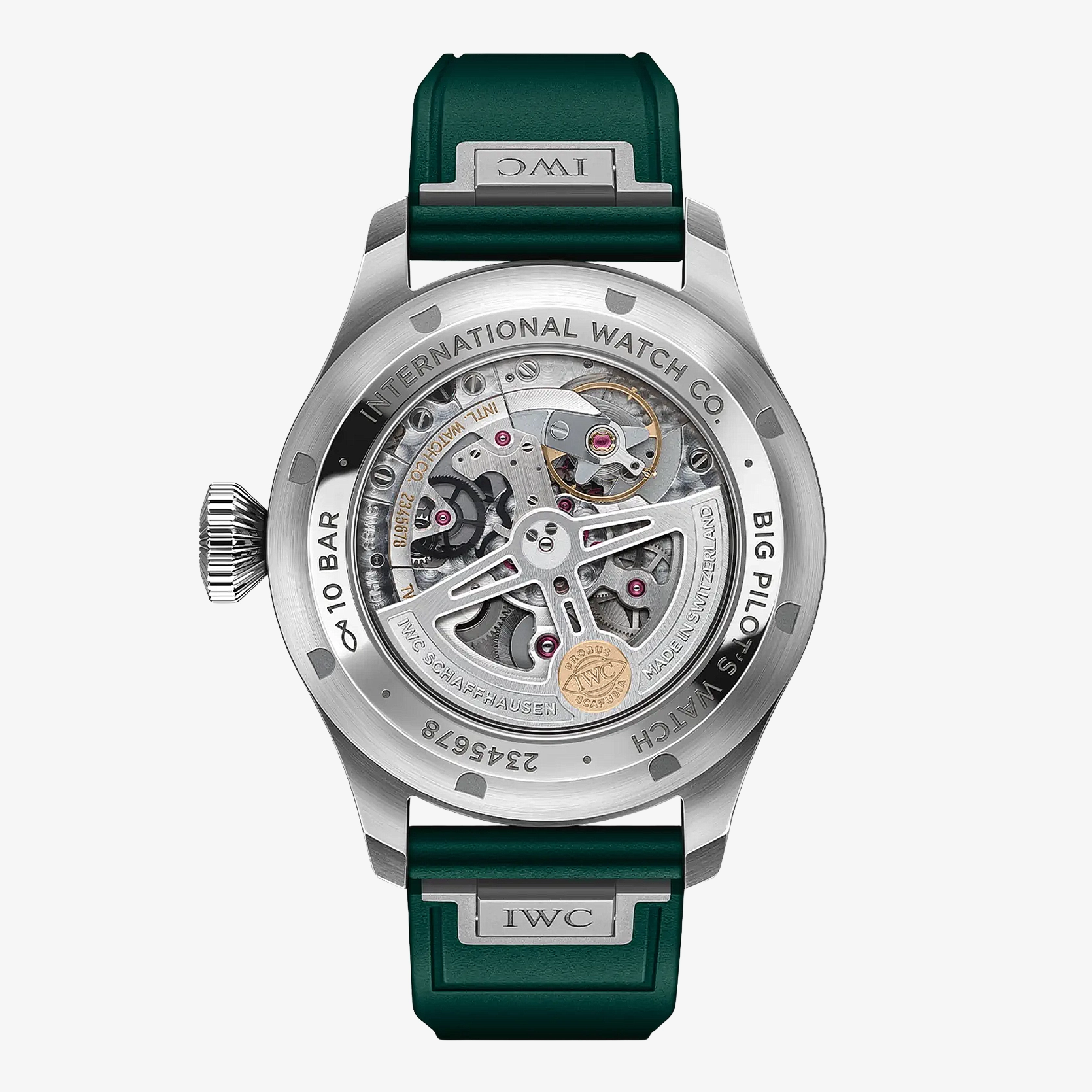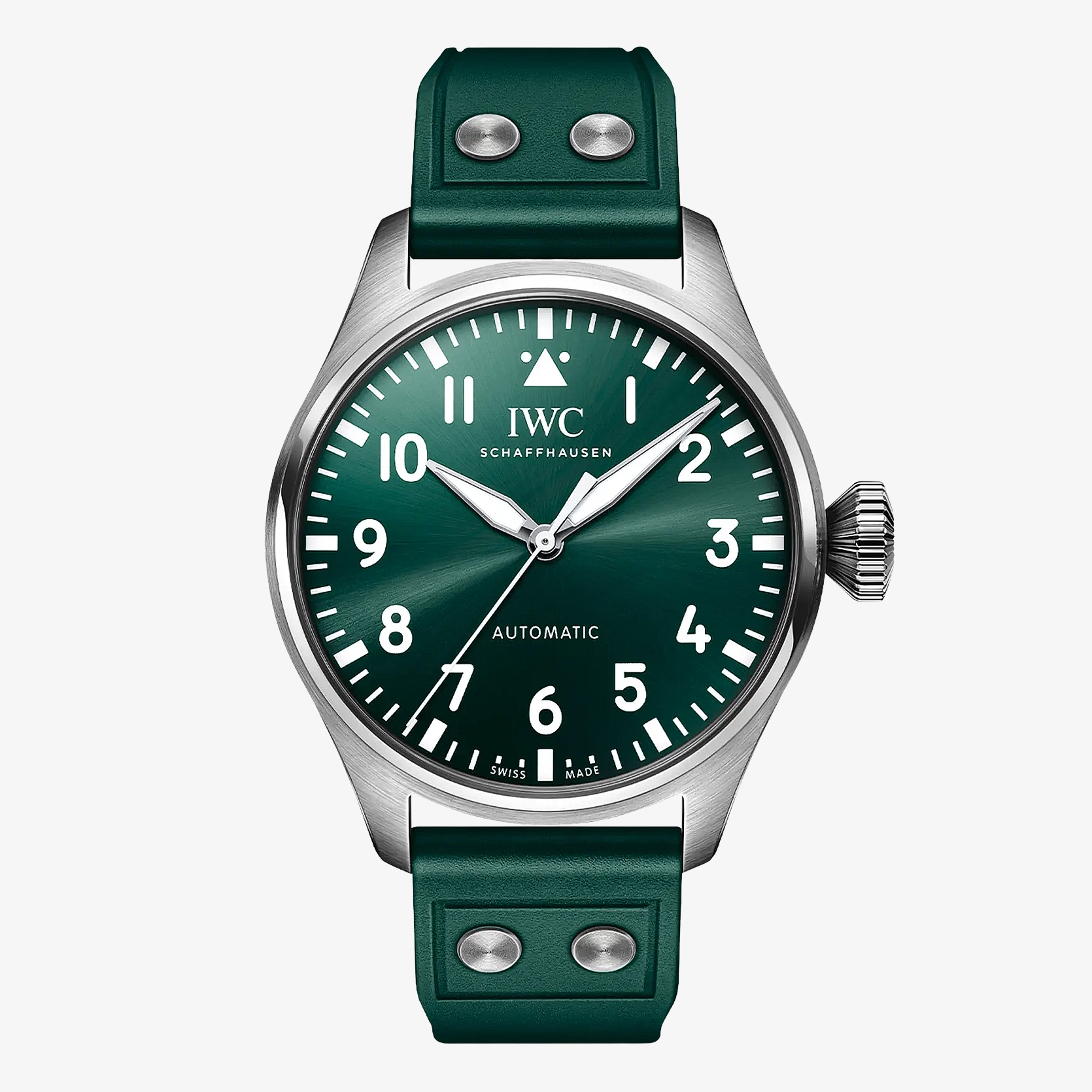 Ref. IW329306 - Diese Big Pilot’s Watch 43 verfügt über ein Edelstahlgehäuse, ein Zifferblatt in «British Racing Green» sowie ein grünes Kautschukarmband. Einfach ablesbares Zifferblatt im charakteristischen Instrumenten-Design, markante Kegelkrone und mutige Präsenz am Handgelenk: Die Big Pilot’s Watch 43 ist eine Big Pilot durch und durch – in einem ergonomischen und gut tragbaren Gehäusedurchmesser von 43 Millimetern. Das Zifferblatt mit drei Zeigern verzichtet auf zusätzliche Elemente wirkt deshalb ausserordentlich übersichtlich und klar. Dieses Modell verfügt über ein Edelstahlgehäuse, ein Zifferblatt in „Racing Green“ sowie rhodinierte Zeiger. Die Leuchtmasse auf dem Zifferblatt und den Zeigern sorgt für eine optimale Ablesbarkeit auch in der Nacht. Durch den Sichtboden aus Saphirglas lässt sich das IWC-Manufakturkaliber 82100 betrachten. Sein automatischer Pellaton-Aufzug ist mit Komponenten aus nahezu verschleissfreier Keramik ausgestattet und baut eine Gangreserve von 60 Stunden auf. Die Uhr wird an einem grünen Kautschukarmband mit vier Nieten getragen. Dank des integrierten EasX-CHANGE® lässt sich das Armband ganz einfach per Knopfdruck wechseln. In Verbindung mit dem bis 10 bar wasserdichten Gehäuse macht diese Flexibilität die Big Pilot’s Watch 43 zu einer sehr vielseitigen Sportuhr.