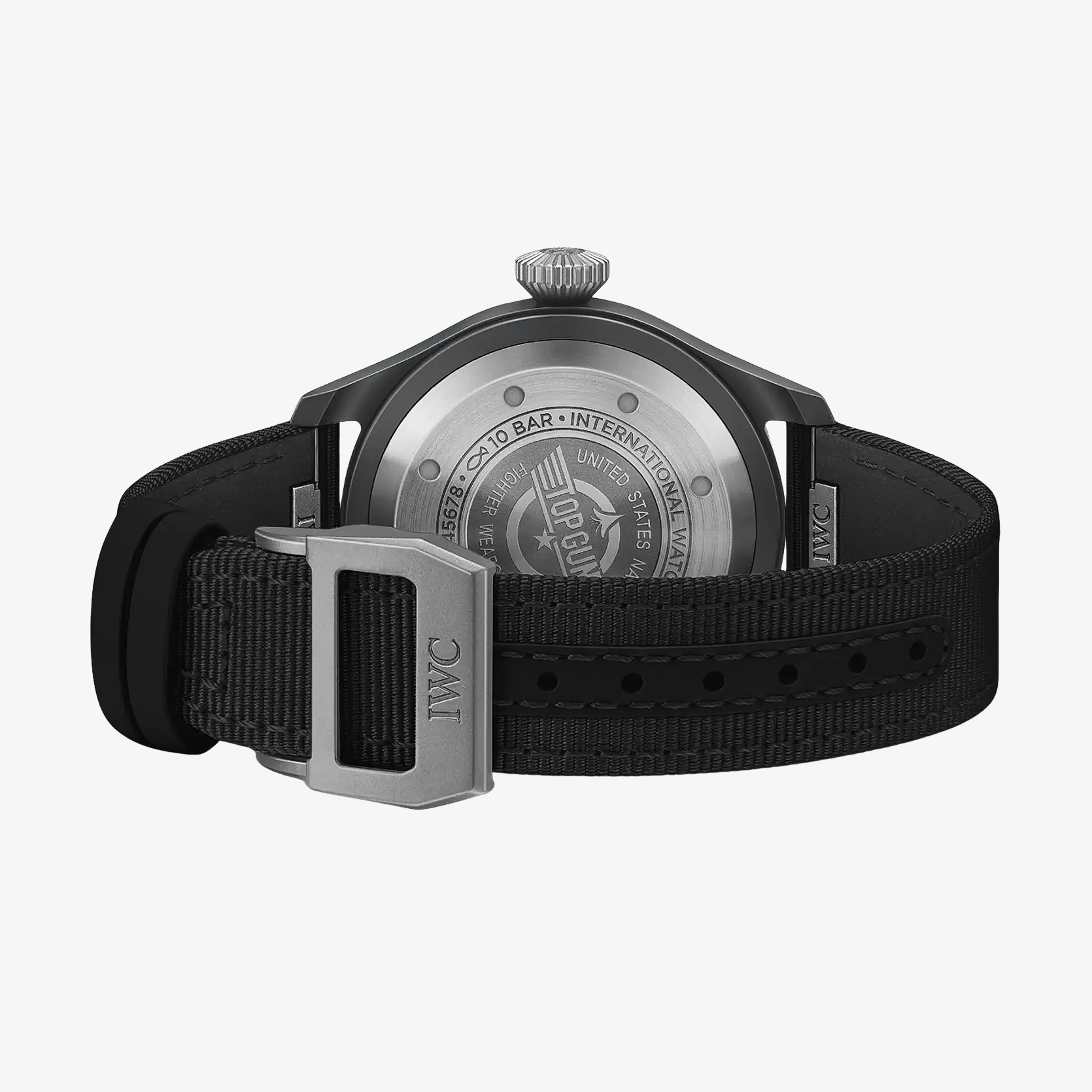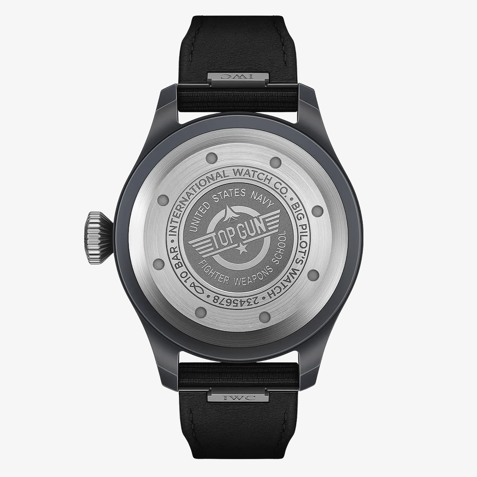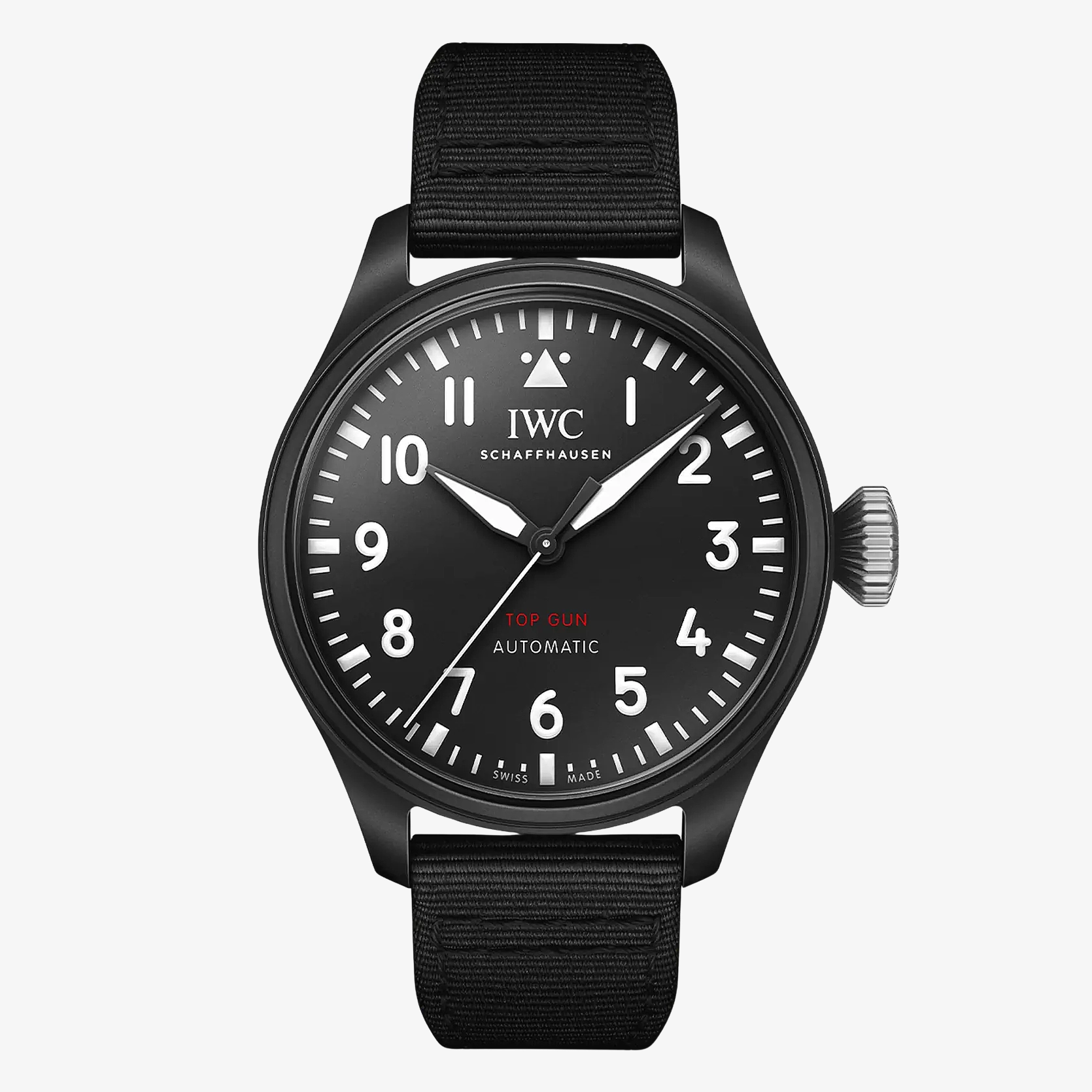 Ref. IW329801 - Die Pilot’s Watch 43 TOP GUN verfügt über ein Gehäuse aus schwarzer Keramik, ein schwarzes Zifferblatt sowie einen Gehäuseboden und eine Krone aus Titan.