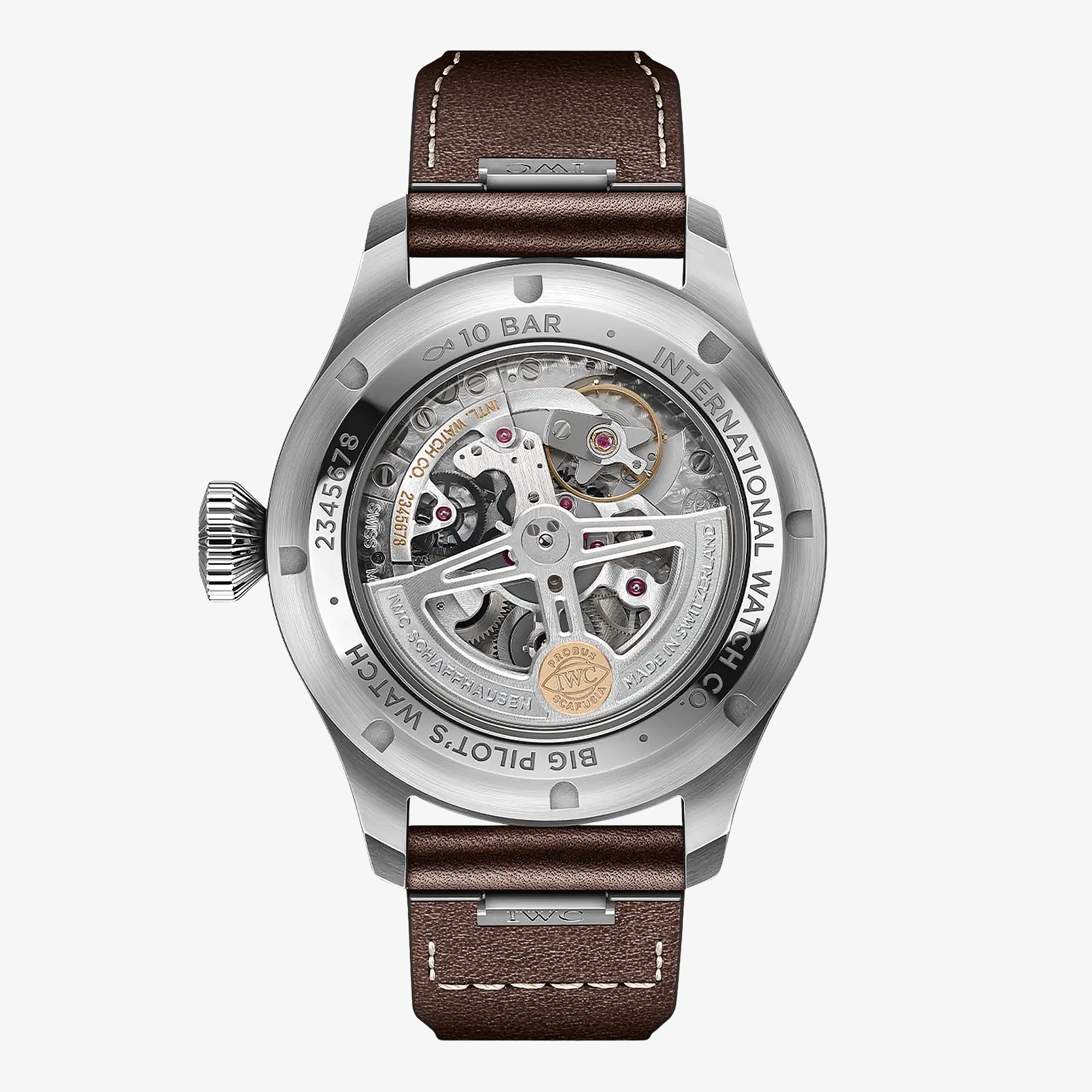 Ref. IW329301 - Die Big Pilot’s Watch 43 verbindet ikonisches Design mit feinster Werktechnik und ausgeprägter Vielseitigkeit in einem ergonomischen Gehäusedurchmesser von 43 Millimetern. Kein anderes Modell verkörpert die Faszination der Fliegeruhren von IWC Schaffhausen wie die Big Pilot’s Watch. Das funktionale Design im Stil eines einfach ablesbaren Cockpit-Instruments und die übergrosse Kegelkrone wurden von einer militärischen Beobachtungsuhr aus den 1940er-Jahren inspiriert. Die Big Pilot’s Watch 43 ist eine puristische Interpretation dieses ursprünglichen Designs ohne zusätzliche Elemente auf dem Zifferblatt in einem 43-Millimeter-Edelstahlgehäuse, das eine erstaunliche Präsenz am Handgelenk mit höchstem Tragekomfort verbindet. Dieses Modell verfügt über ein schwarzes Zifferblatt, rhodinierte Zeiger und ein braunes Kalbslederarmband. Durch den Saphirglasboden sichtbar ist das IWC-Manufakturkaliber 82100. Der Pellaton-Aufzug wurde mit Keramikkomponenten verstärkt und baut eine Gangreserve von 60 Stunden auf. Für Flexibilität sorgt das praktische EasX-CHANGE System sowie eine Auswahl von Armbändern aus Kalbsleder, Kautschuk oder Edelstahl. In Verbindung mit dem bis 10 bar wasserdichten Gehäuse macht es die Big Pilot’s Watch 43 zu einer modernen und vielseitigen Sportuhr.