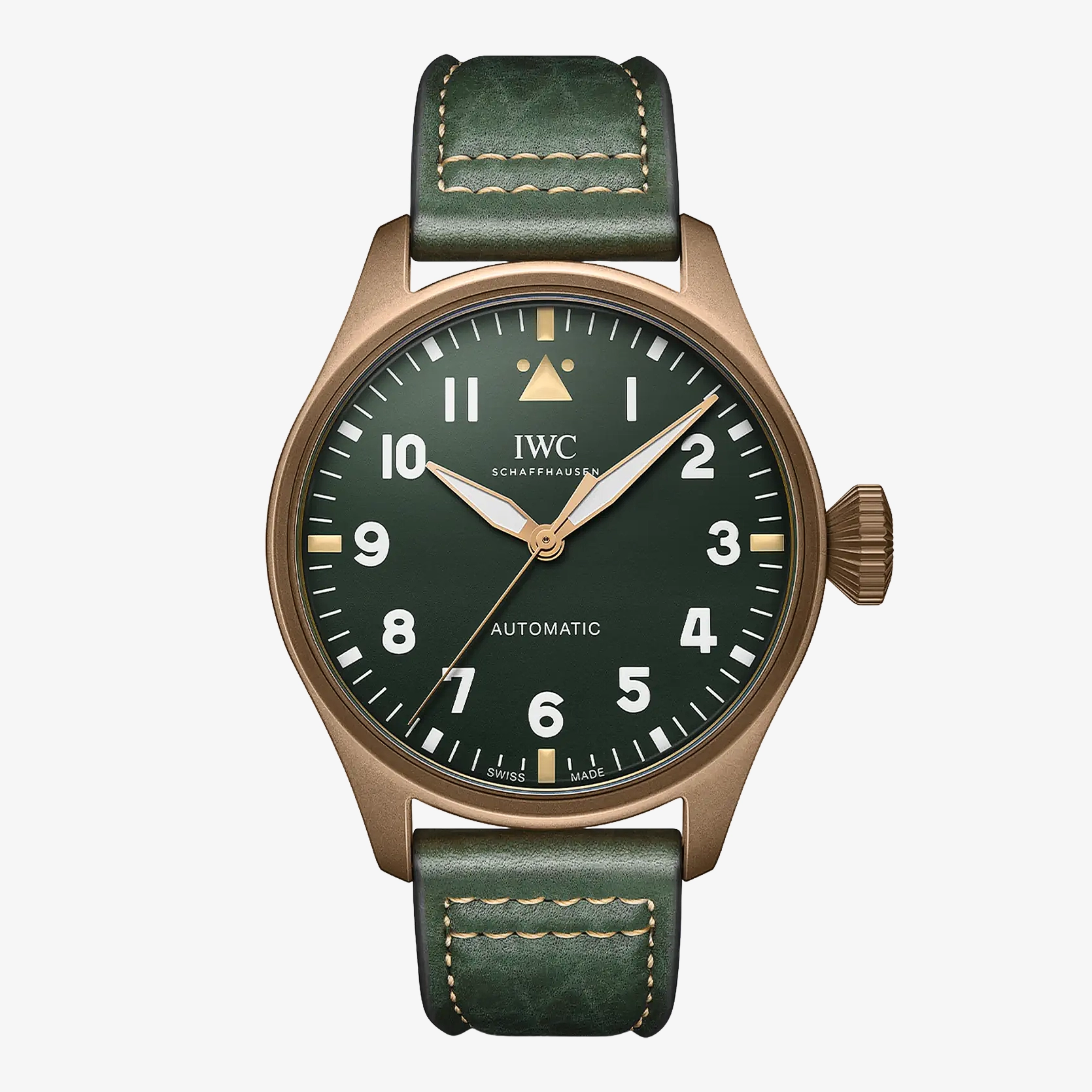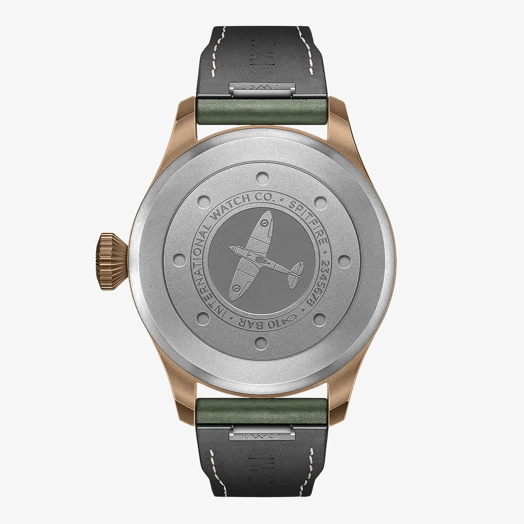 Ref. IW329702 - Die Big Pilot's Watch 43 Spitfire zeichnet sich durch eine militärische Ästhetik mit einem Gehäuse und einer Krone aus Bronze sowie einem militärgrünen Zifferblatt und vergoldeten Zeigern aus. Im Laufe ihrer Geschichte hat IWC Schaffhausen zahlreiche «field watches» für verschiedene Bereiche des britischen Militärs gefertigt. Mil-spec Uhren wie die Mark 11 zeichneten sich aus durch hochpräzise Werke, eine extreme Robustheit, ein funktionales Design mit gut ablesbaren Zifferblättern sowie auf spezifische Anforderungen hin entwickelte technische Funktionalitäten. Die Spitfire-Modelle in der Pilot’s Watches Kollektion widerspiegeln dieses Kapitel der Markengeschichte. Die Big Pilot’s Watch 43 Spitfire verfügt über das typische Big Pilot’s Design mit der markanten Kegelkrone in einem ergonomischen 43-Millimeter-Gehäuse, kombiniert mit einer ausgeprägten militärischen Ästhetik. Das Gehäuse und die Krone sind aus Bronze, der Gehäuseboden aus Titan. Die von IWC verwendete Bronze enthält neben Kupfer auch Aluminium und Eisen. Diese spezielle Zusammensetzung macht die Legierung rund 50 Prozent härter als herkömmliche Bronze. Bronze entwickelt mit der Zeit eine Patina, die jedem Zeitmesser einen eigenen Charakter verleiht. Die warme Farbe der Bronze harmoniert mit dem militärgrünen Zifferblatt und den vergoldeten Zeigern. Um die Ablesbarkeit bei Nacht zu erleichtern, wurden die Zeiger und Stundenmarkierungen mit Leuchtmasse beschichtet. Die Uhr wird an einem grünen Armband aus Büffelleder mit einer einzigartigen Textur getragen. Sie verfügt zudem über das neue EasX-CHANGE System von IWC. Es erlaubt dem Träger, das Armband schnell und einfach mit einem simplen Knopfdruck und ohne zusätzliches Werkzeug zu wechseln. Im Inneren des Gehäuses arbeitet das IWC-Manufakturkaliber 82100. Der mit Keramik-Komponenten verstärkte Pellaton-Aufzug baut eine Gangreserve von 60 Stunden auf. Ein Innenkäfig aus Weicheisen schützt das Uhrwerk vor den Einflüssen von Magnetfeldern.
