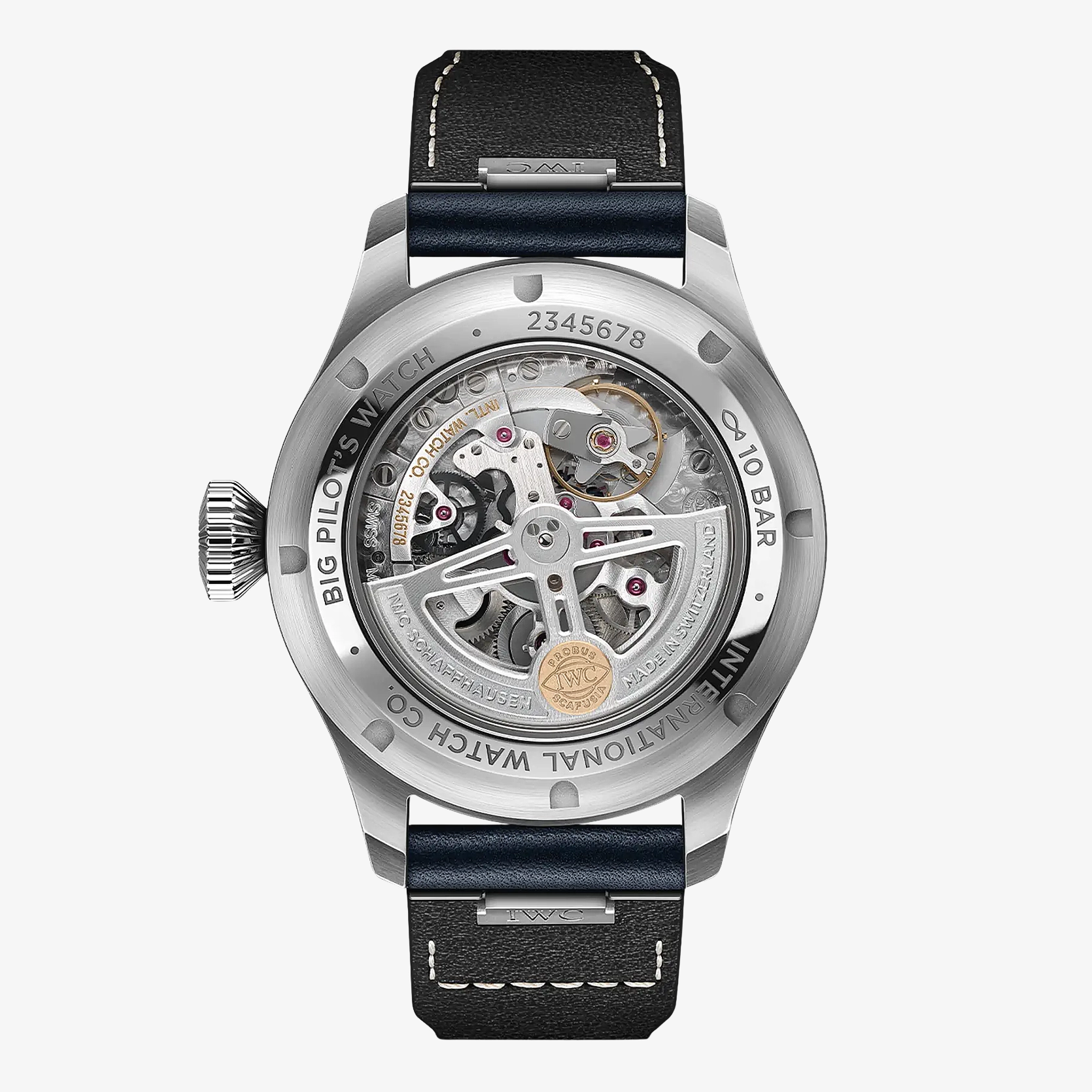 Ref. IW329303 - Die Big Pilot’s Watch 43 verbindet ikonisches Design mit feinster Werktechnik und ausgeprägter Vielseitigkeit in einem ergonomischen Gehäusedurchmesser von 43 Millimetern. Kein anderes Modell verkörpert die Faszination der Fliegeruhren von IWC Schaffhausen wie die Big Pilot’s Watch. Das funktionale Design im Stil eines einfach ablesbaren Cockpit-Instruments und die übergrosse Kegelkrone wurden von einer militärischen Beobachtungsuhr aus den 1940er-Jahren inspiriert. Die Big Pilot’s Watch 43 ist eine puristische Interpretation dieses ursprünglichen Designs ohne zusätzliche Elemente auf dem Zifferblatt in einem 43-Millimeter-Edelstahlgehäuse, das eine erstaunliche Präsenz am Handgelenk mit höchstem Tragekomfort verbindet. Dieses Modell verfügt über ein blaues Zifferblatt, rhodinierte Zeiger und ein blaues Kalbslederarmband. Durch den Saphirglasboden sichtbar ist das IWC-Manufakturkaliber 82100. Der Pellaton-Aufzug wurde mit Keramikkomponenten verstärkt und baut eine Gangreserve von 60 Stunden auf. Für Flexibilität sorgt das praktische EasX-CHANGE System sowie eine Auswahl von Armbändern aus Kalbsleder, Kautschuk oder Edelstahl. In Verbindung mit dem bis 10 bar wasserdichten Gehäuse macht es die Big Pilot’s Watch 43 zu einer modernen und vielseitigen Sportuhr.