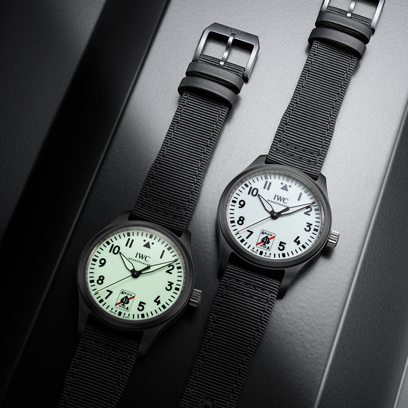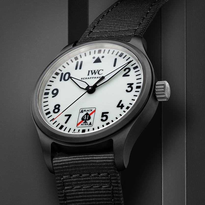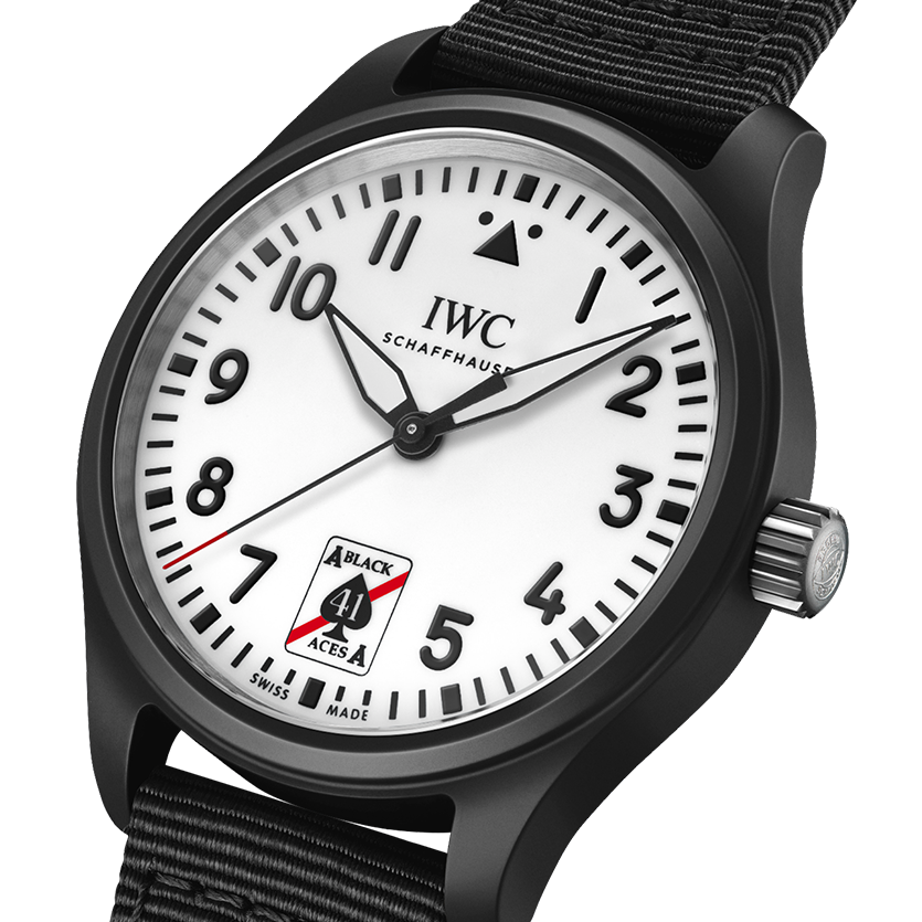Die Pilot’s Watch Automatic 41 Black Aces ist inspiriert von einem Modell, das IWC im Rahmen des Professional Pilot’s Watches Programms für Mitglieder des Strike Fighter Squadrons 41, auch bekannt als «Black Aces», entwickelt hat. Der Zeitmesser verfügt über ein 41-Millimeter-Gehäuse aus harter und kratzfester schwarzer Zirkonoxid-Keramik sowie ein speziell angefertigtes, nachtleuchtendes Zifferblatt. Das vollständig mit Leuchtmasse beschichtete weisse Zifferblatt wurde in Zusammenarbeit mit Piloten der «Black Aces» entwickelt und ermöglicht eine besonders einfache Ablesbarkeit in der Nacht. Das Abzeichen der Einheit – ein schwarzes Pik-Ass – befindet sich bei 6 Uhr. Der Gehäuseboden aus Titan zeigt eine Gravur des Jets der Einheit vor einem Hintergrund mit Pik-Muster. Angetrieben wird die Uhr vom IWC-Manufakturkaliber 32100 mit automatischem Aufzug und einer Gangreserve von fünf Tagen. Ein Weicheisen-Innengehäuse schützt das Uhrwerk vor den Einflüssen von Magnetfeldern. Das Frontglas ist speziell gesichert, damit es sich selbst bei einem plötzlichen Druckabfall nicht von seinem Platz lösen kann. Die bis 6 bar wasserdichte Uhr wird an einem schwarzen Textilband mit sandgestrahlter Edelstahlschliesse getragen.