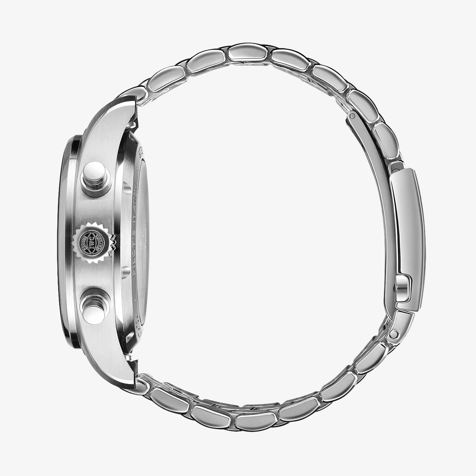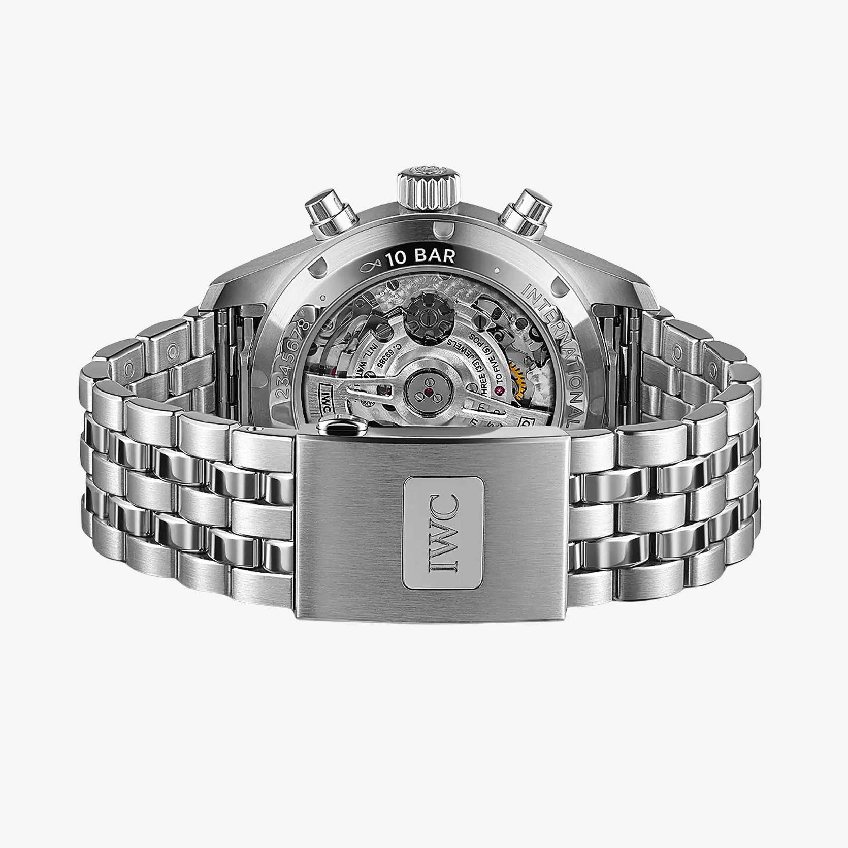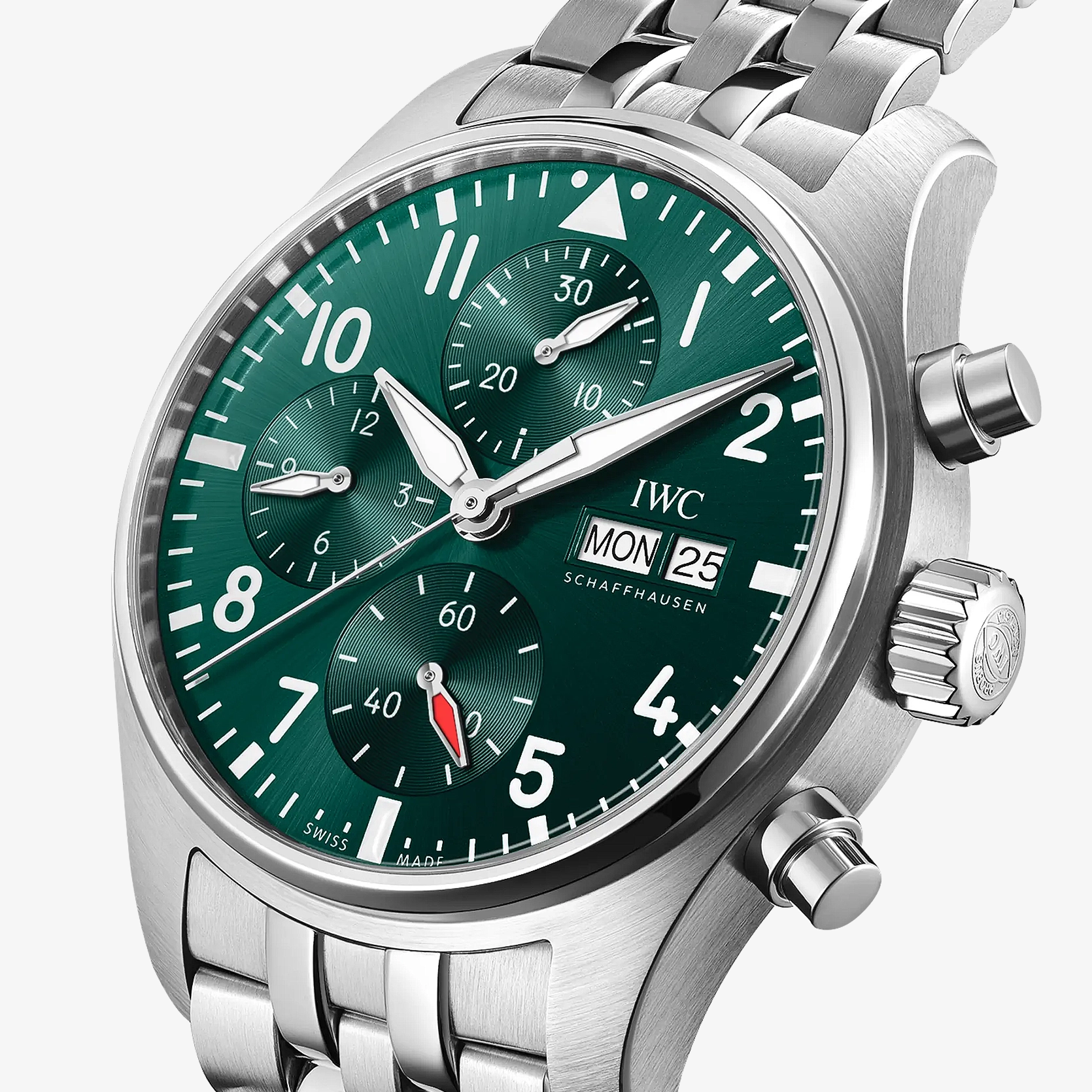 Seit 1994 sind Chronographen eine tragende Säule der Fliegeruhren-Kollektion von IWC. Das Zifferblatt mit den verschiedenen Zählern unterstreicht nicht nur das typische Instrumenten-Design. Die mechanische Stoppuhr bietet auch nahezu unbegrenzte Anwendungsmöglichkeiten im Alltag. Die Pilot’s Watch Chronograph 41 in einem ergonomischen Durchmesser von 41 Millimetern wird vom IWC-Manufakturkaliber 69385 angetrieben. Das robuste und präzise Chronographenwerk mit Kolonnenrad ist durch den Saphirglasboden sichtbar. Dieses Modell verfügt über ein Edelstahlgehäuse, ein grünes Zifferblatt, rhodinierte Zeiger sowie ein hochwertiges Edelstahlarmband mit Feineinstellverschluss und einer sich zur Schliesse verjüngenden Form. Das integrierte EasX-CHANGE System ermöglicht es, das Armband im Handumdrehen zu wechseln. Erhältlich sind auch Armbänder aus Kalbsleder oder Kautschuk in verschiedenen Farben. In Kombination mit dem bis 10 bar wasserdichten Gehäuse macht diese Vielseitigkeit den Chronographen zum perfekten Begleiter für jedes Abenteuer – nicht nur im Cockpit.