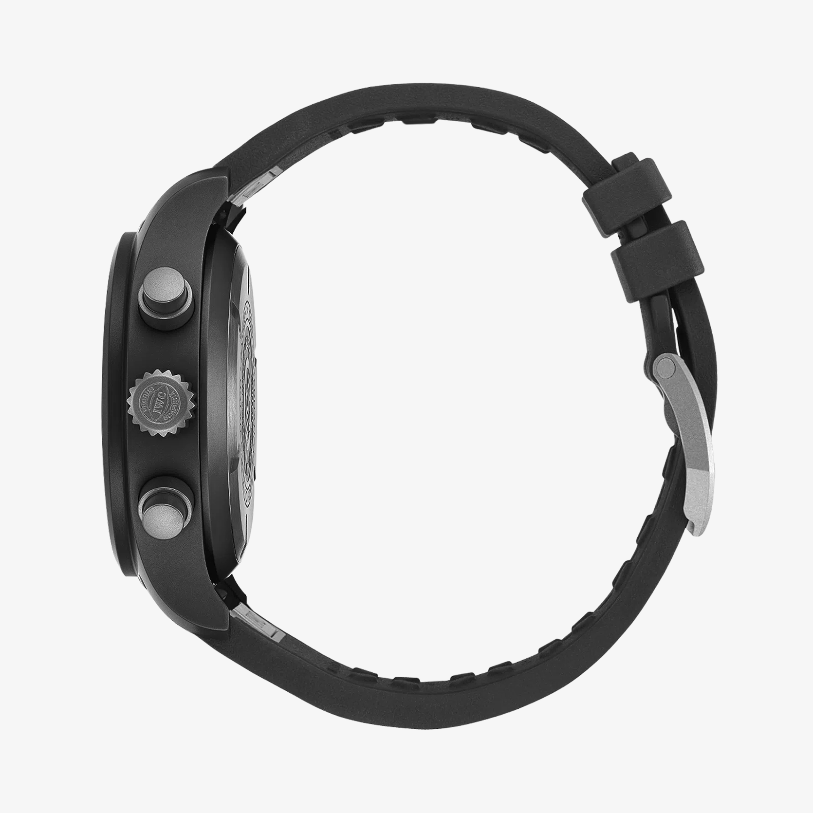 Seit der Einführung der IWC TOP GUN Linie im Jahr 2007 ist schwarze Zirkonoxid-Keramik das charakteristische Material der Kollektion. Auf einem aufwendigen Herstellungsprozess basierend, sind Keramikgehäuse nicht nur extrem hart und kratzfest, sondern auch leicht und korrosionsbeständig. Die Pilot’s Watch 41 TOP GUN kombiniert ein «Jet Black» Keramikgehäuse in einer ergonomischen Grösse von 41 Millimetern mit einem schwarzen Zifferblatt und einem schwarzen Kautschukarmband. Die Krone und Drücker sind aus Titan gefertigt. Ein Gehäuseboden aus Titan ergänzt das reduziert sportliche Chronographen-Design. Angetrieben wird der Zeitmesser vom IWC-Manufakturkaliber 69380. Das robuste und präzise Chronographenwerk in klassischer Kolonnenradbauweise ist von einem Weicheisen-Innengehäuse umgeben, um es vor den Einflüssen von Magnetfeldern zu schützen. Diese vielseitige Sportuhr weist eine Wasserdichtigkeit von 10 bar auf und ist mit dem IWC EasX-CHANGE®-System ausgestattet, das ein schnelles und einfaches Austauschen des Armbands ohne zusätzliches Werkzeug ermöglicht.