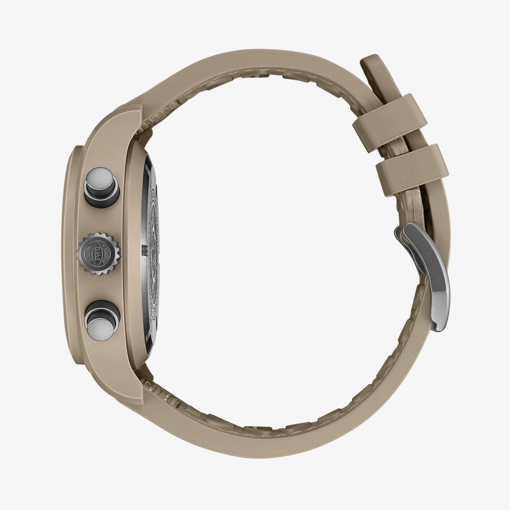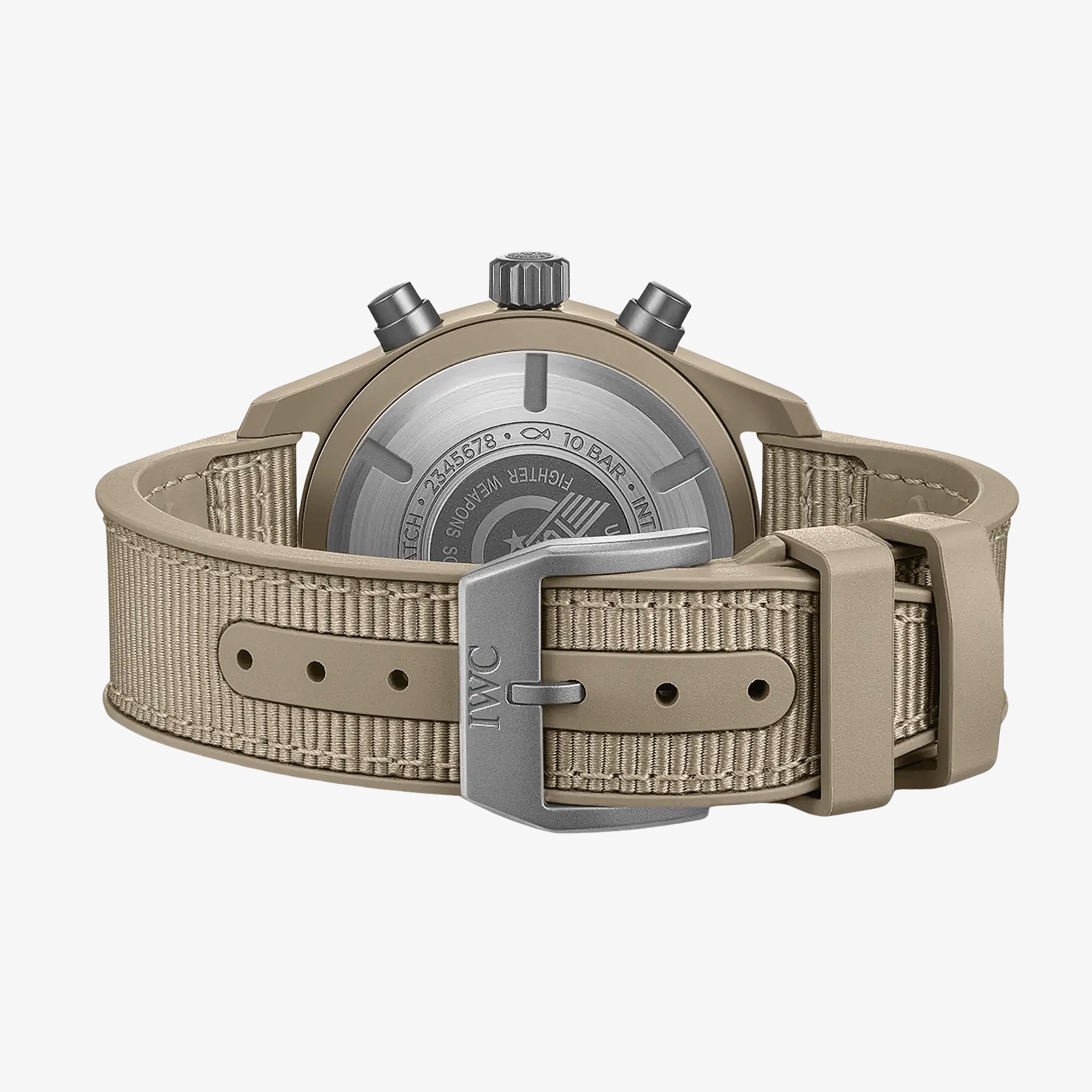 Die Pilot’s Watch Chronograph 41 TOP GUN Mojave Desert verfügt über ein 41-Millimeter-Gehäuse aus sandfarbener Keramik. Diese in Zusammenarbeit mit Pantone® entwickelte Keramikfarbe wurde von den Fluganzügen der Marineflieger und der kargen Wüstenlandschaft rund um den China Lake inspiriert, wo sich die berühmte TOPGUN-Flugschule der U.S. Navy befindet. Technische Keramik ist bemerkenswert leicht und kratzfest, was sie zum perfekten Material für eine Fliegeruhr macht. Das braune Zifferblatt mit dezenten Indizes und Ziffern und das beigefarbene Kautschukarmband mit Textileinlage passen perfekt zur Farbe des Keramikgehäuses. Der Gehäuseboden mit der charakteristischen «TOP GUN»-Gravur, die Krone und die Drücker sind aus Titan gefertigt. Im Inneren des Gehäuses arbeitet das von IWC-Manufakturkaliber 69380. Dieser mechanische Chronograph im klassischen Säulenrad-Design wurde mit kompromisslosem Fokus auf Robustheit, Zuverlässigkeit und Präzision entwickelt. Er verfügt über das IWC-typische vertikale Zifferblattlayout, das die gestoppten Minuten zur besseren Ablesbarkeit direkt bei der 12 platziert. Zusätzlich befindet sich bei 3 Uhr eine Datumsanzeige. Eine innere Gehäusekonstruktion aus Weicheisen schützt das Uhrwerk vor der Einwirkung von Magnetfeldern. Das Frontglas ist zudem speziell gesichert, damit es auch bei einem plötzlichen Druckabfall in seiner Position bleibt.