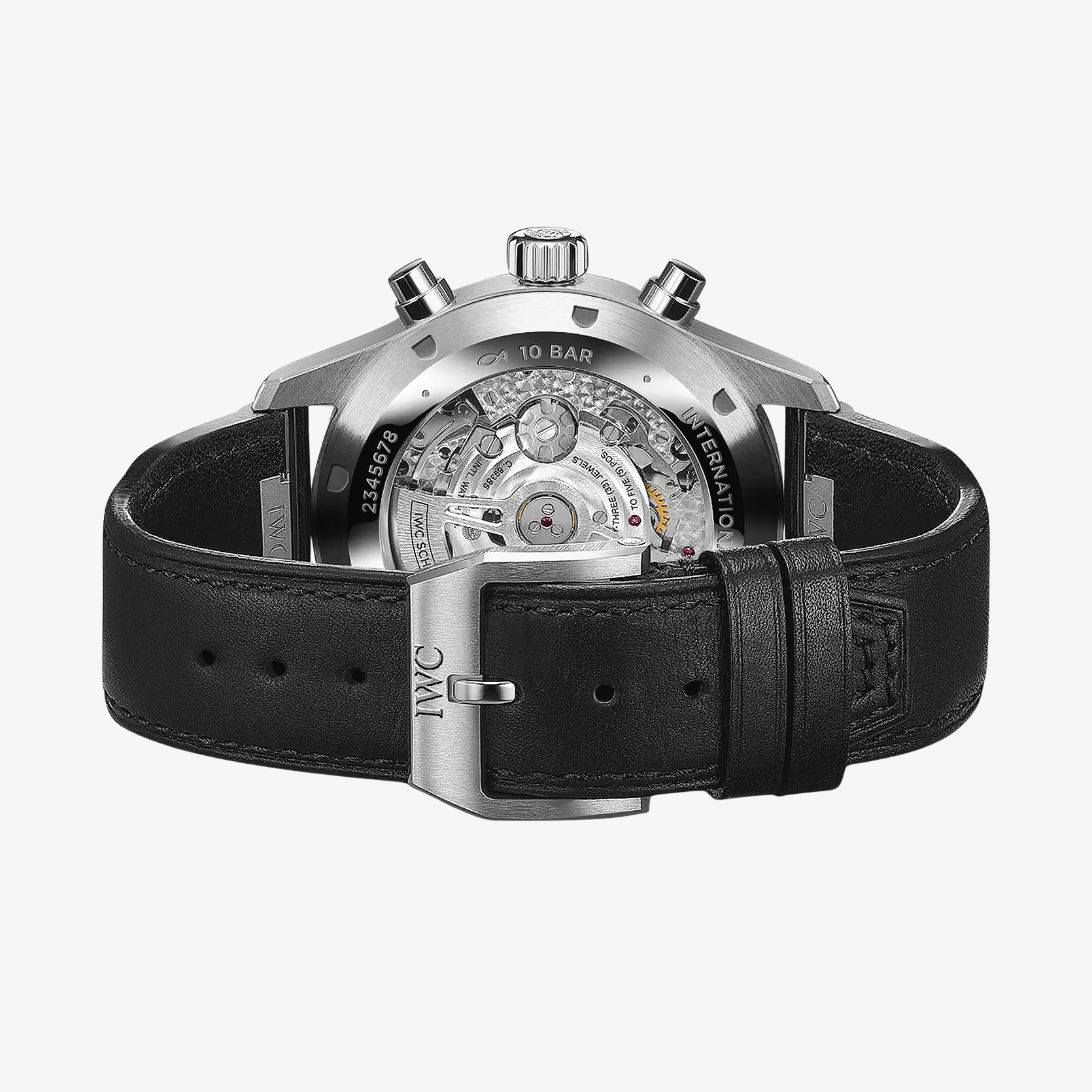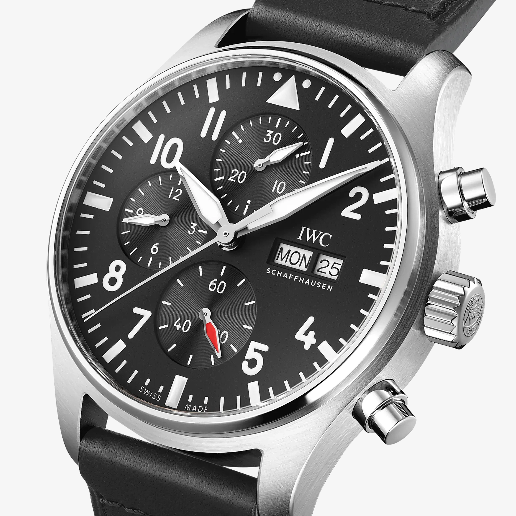 Chronographen bilden seit 1994 einen integralen Bestandteil der Pilot’s Watch Kollektion von IWC Schaffhausen. Dieser Pilot’s Watch Chronograph verfügt über ein Gehäuse aus Edelstahl mit einem Durchmesser von 43 Millimetern, ein schwarzes Zifferblatt sowie rhodinierte Zeiger. Das kontrastreiche Zifferblatt mit den grossen arabischen Zahlen und dem Markierungsdreieck bei 12 Uhr ist im Stil eines einfach ablesbaren Cockpit-Instruments gestaltet. Dank Leuchtelementen lässt sich die Zeit auch in der Nacht oder bei schwierigen Sichtverhältnissen auf einen Blick ablesen. Das IWC-Manufakturkaliber 69385, ein präzises und robustes Chronographenwerk in klassischer Kolonnenradbauweise, ermöglicht die Messung von Stopp- oder Additionszeiten bis zu 12 Stunden. Die gemessenen Stunden werden auf dem Zähler bei 9 Uhr und die Minuten bei 12 Uhr angezeigt, während sich die kleine Sekunde mit einem roten Zeiger bei 6 Uhr befindet. Das dekorierte Uhrwerk mit Automatikaufzug und einer Gangreserve von 46 Stunden ist durch den Saphirglasboden sichtbar. Der bis 10 bar wasserdichte Chronograph wird an einem schwarzen Armband aus Kalbsleder mit Dornschliesse getragen. Dank des integrierten EasX-CHANGE® Systems lässt sich das Armband einfach und ohne zusätzliches Werkzeug wechseln.