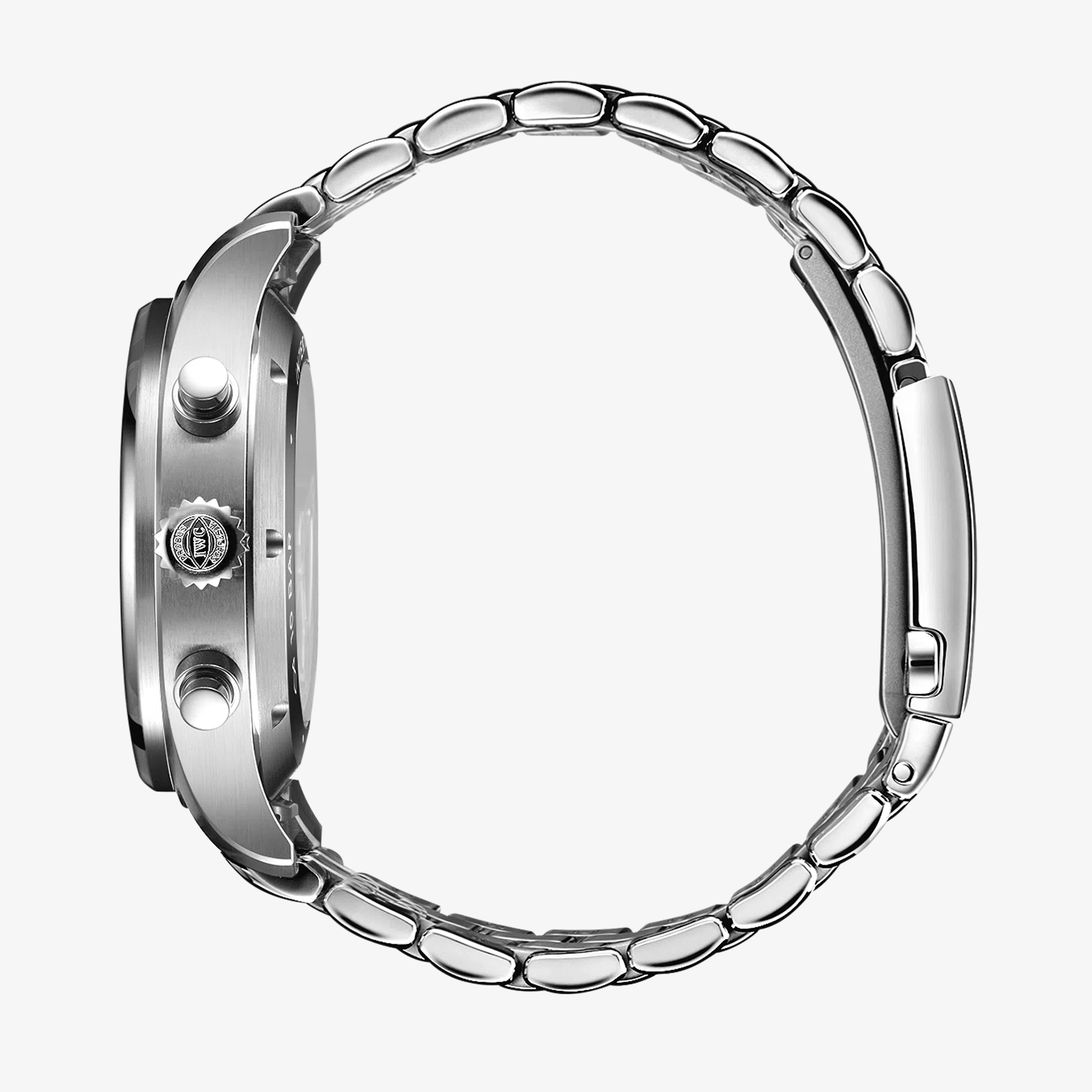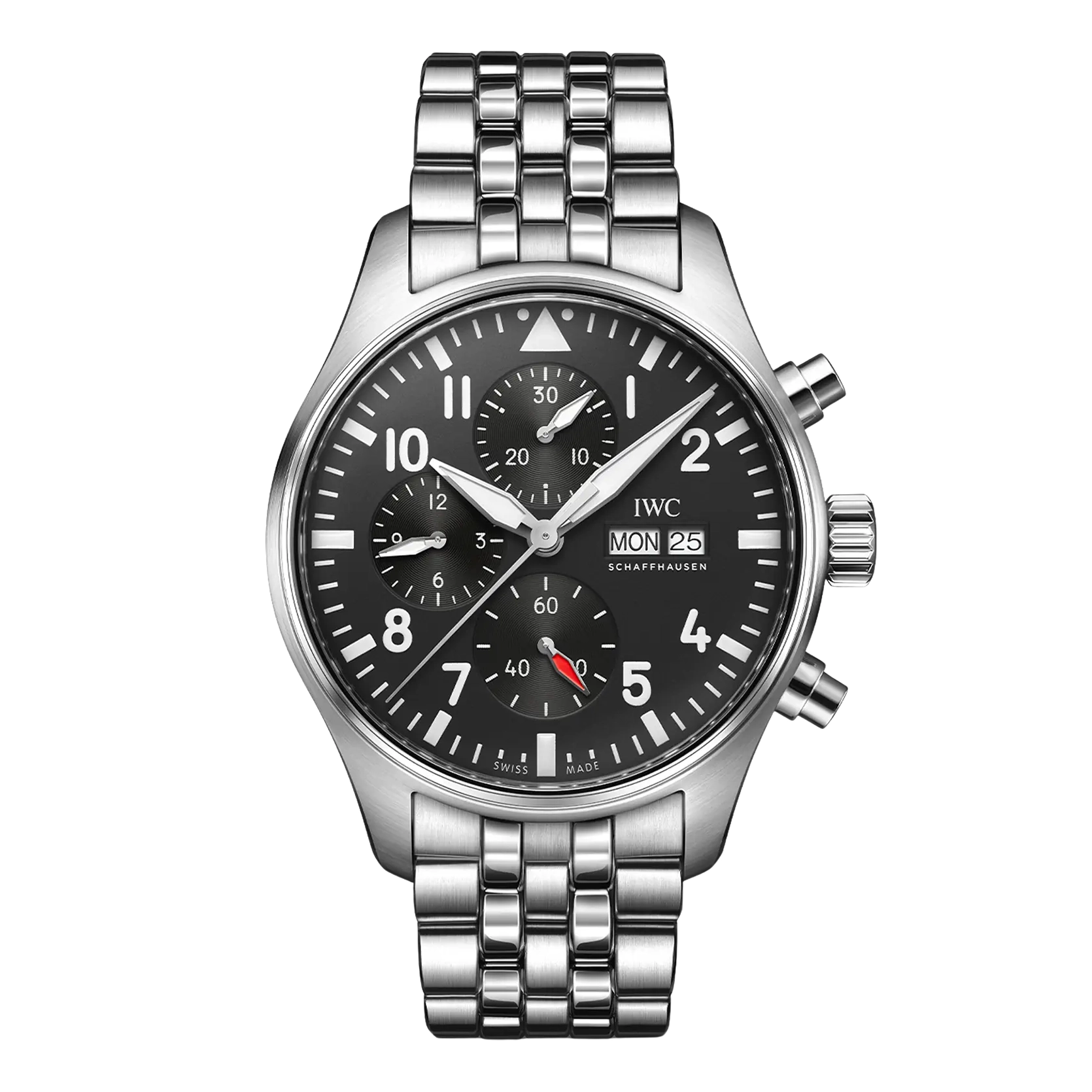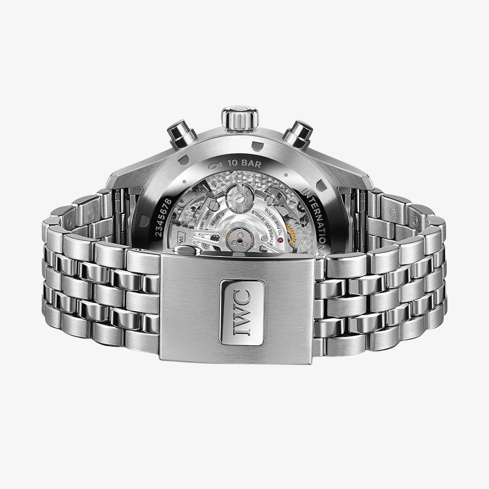 Chronographen bilden seit 1994 einen integralen Bestandteil der Pilot’s Watch Kollektion von IWC Schaffhausen. Dieser Pilot’s Watch Chronograph verfügt über ein Gehäuse aus Edelstahl mit einem Durchmesser von 43 Millimetern, ein schwarzes Zifferblatt sowie rhodinierte Zeiger. Das kontrastreiche Zifferblatt mit den grossen arabischen Zahlen und dem Markierungsdreieck bei 12 Uhr ist im Stil eines einfach ablesbaren Cockpit-Instruments gestaltet. Dank Leuchtelementen lässt sich die Zeit auch in der Nacht oder bei schwierigen Sichtverhältnissen auf einen Blick ablesen. Das IWC-Manufakturkaliber 69385, ein präzises und robustes Chronographenwerk in klassischer Kolonnenradbauweise, ermöglicht die Messung von Stopp- oder Additionszeiten bis zu 12 Stunden. Die gemessenen Stunden werden auf dem Zähler bei 9 Uhr und die Minuten bei 12 Uhr angezeigt, während sich die kleine Sekunde mit einem roten Zeiger bei 6 Uhr befindet. Das dekorierte Uhrwerk mit Automatikaufzug und einer Gangreserve von 46 Stunden ist durch den Saphirglasboden sichtbar. Der bis 10 bar wasserdichte Chronograph wird an einem fünfgliedrigen Armband aus Edelstahl mit Faltschliesse getragen. Dank des integrierten EasX-CHANGE® Systems lässt sich das Armband einfach und ohne zusätzliches Werkzeug wechseln.