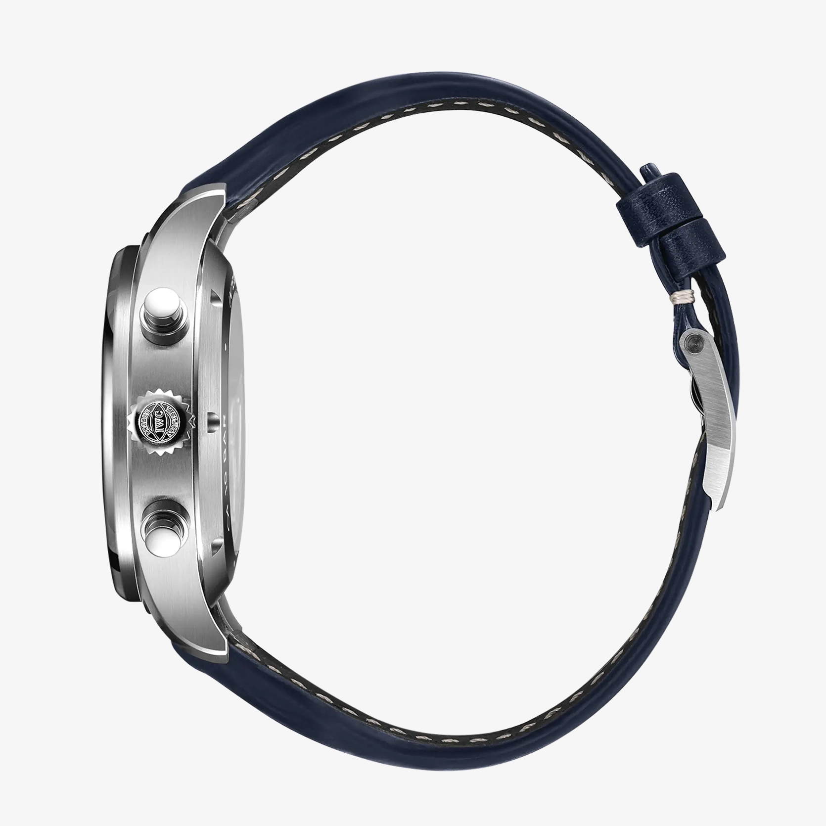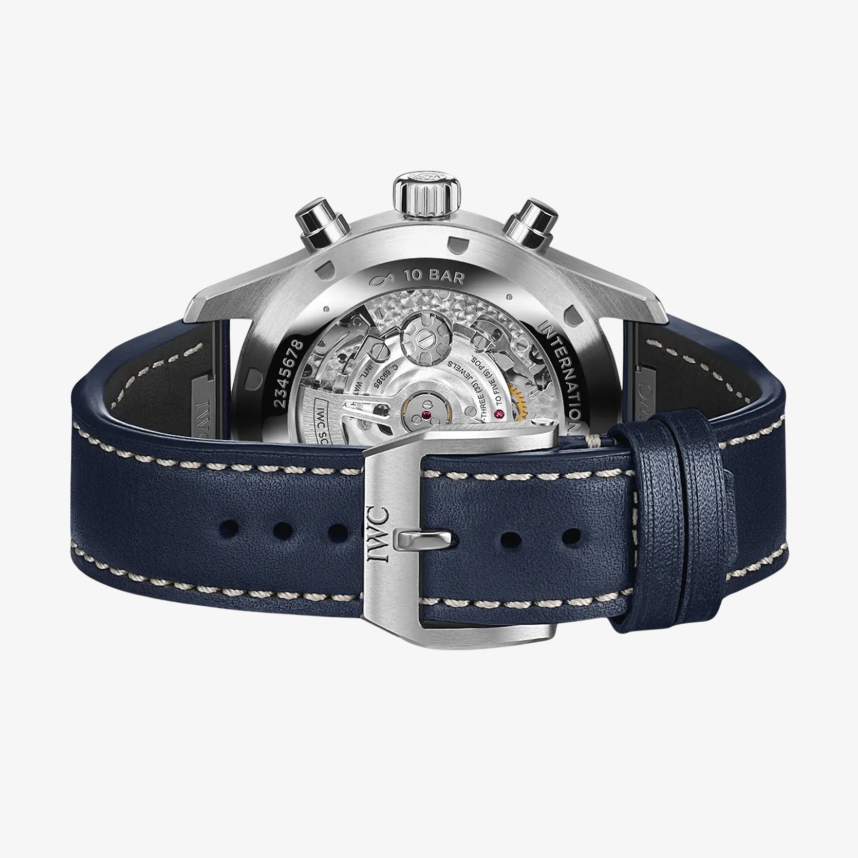 Chronographen bilden seit 1994 einen integralen Bestandteil der Pilot’s Watch Kollektion von IWC Schaffhausen. Dieser Pilot’s Watch Chronograph verfügt über ein Gehäuse aus Edelstahl mit einem Durchmesser von 43 Millimetern, ein blaues Zifferblatt sowie rhodinierte Zeiger. Das kontrastreiche Zifferblatt mit den grossen arabischen Zahlen und dem Markierungsdreieck bei 12 Uhr ist im Stil eines einfach ablesbaren Cockpit-Instruments gestaltet. Dank Leuchtelementen lässt sich die Zeit auch in der Nacht oder bei schwierigen Sichtverhältnissen auf einen Blick ablesen. Das IWC-Manufakturkaliber 69385, ein präzises und robustes Chronographenwerk in klassischer Kolonnenradbauweise, ermöglicht die Messung von Stopp- oder Additionszeiten bis zu 12 Stunden. Die gemessenen Stunden werden auf dem Zähler bei 9 Uhr und die Minuten bei 12 Uhr angezeigt, während sich die kleine Sekunde mit einem roten Zeiger bei 6 Uhr befindet. Das dekorierte Uhrwerk mit Automatikaufzug und einer Gangreserve von 46 Stunden ist durch den Saphirglasboden sichtbar. Der bis 10 bar wasserdichte Chronograph wird an einem blauen Armband aus Kalbsleder mit Dornschliesse getragen. Dank des integrierten EasX-CHANGE® Systems lässt sich das Armband einfach und ohne zusätzliches Werkzeug wechseln.