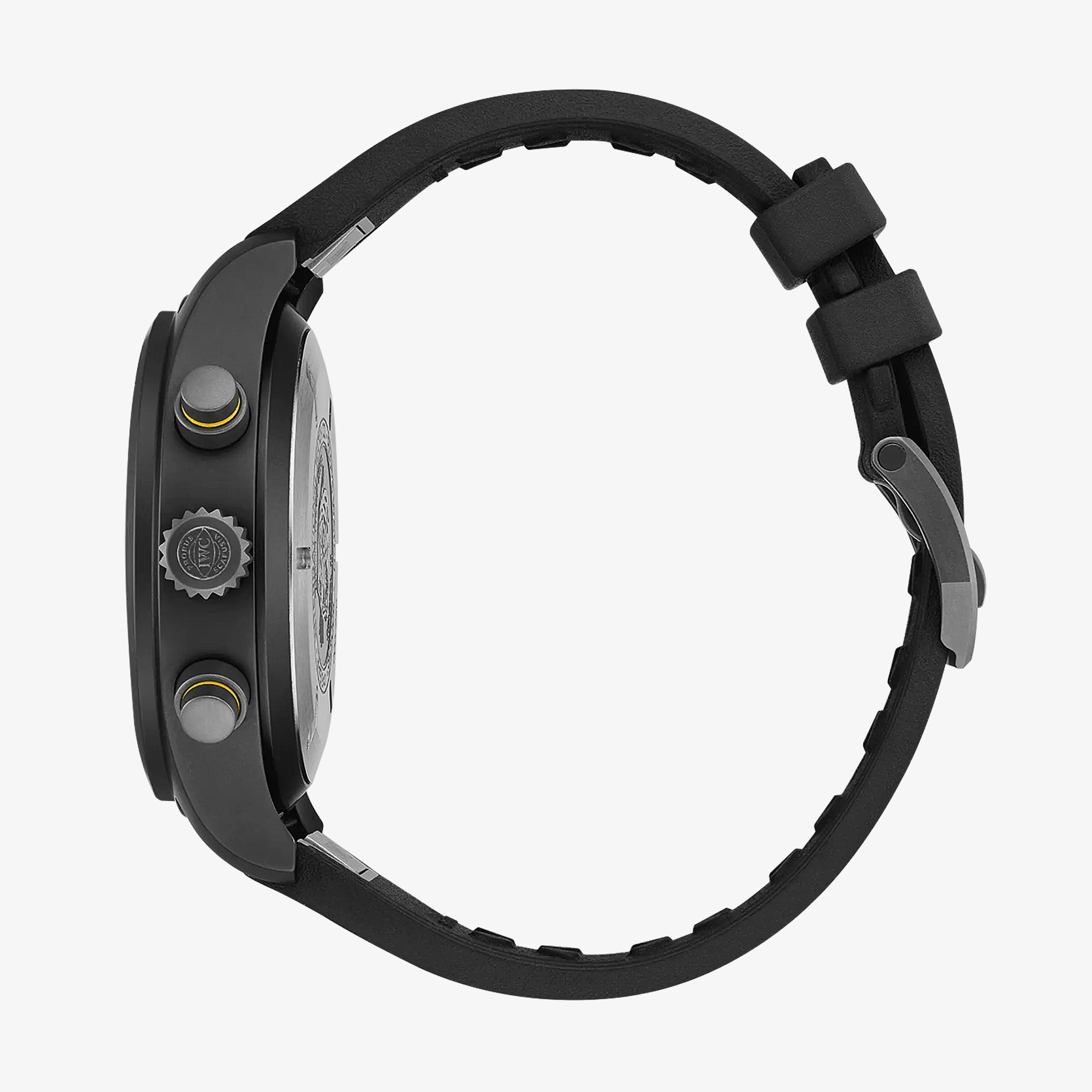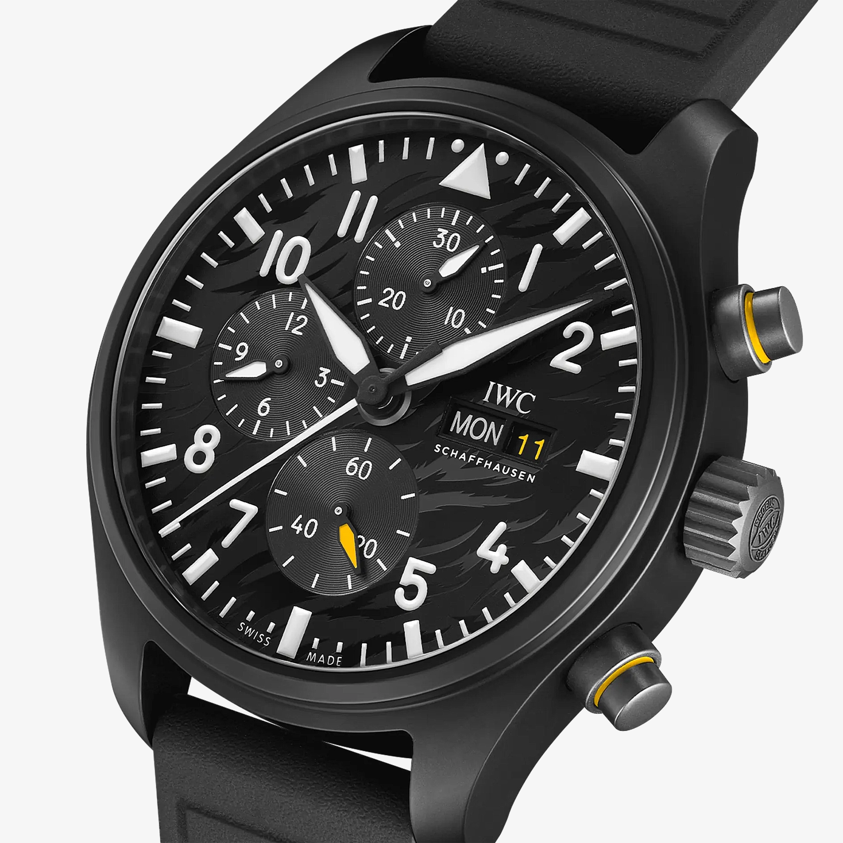 Ref. IW389112 - Die Pilot’s Watch Chronograph Staffel 11 ist der Fliegerstaffel 11 der Schweizer Luftwaffe gewidmet und verfügt über ein schwarzes Gehäuse aus Zirkonoxidkeramik. Ein Tigerkopf, das Emblem der Staffel, findet sich als Gravur auf dem Gehäuseboden aus Titan.