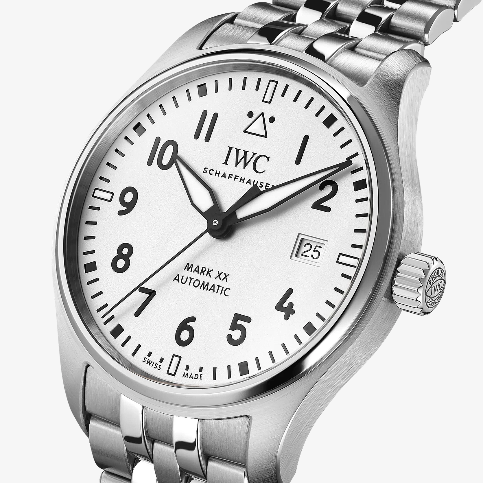 Weniger ist mehr: Die Mark XX reduziert das Design und die technische Funktionalität einer Fliegeruhr auf die pure Essenz. Sie ist die Nachfolgerin der legendären Mark 11, einer präzisen amagnetischen Instrumentenuhr, die IWC 1948 für die Navigatoren und Piloten der British Royal Air Force entwickelt hat. Diese Variante verfügt über ein robustes und korrosionsbeständiges Gehäuse aus Edelstahl in einem Durchmesser von 40 Millimetern, ein weisses Zifferblatt sowie schwarze Zeiger. Das kontrastreiche Zifferblatt mit schwarzen Zahlen und Indizes, dem Markierungsdreieck bei 12 Uhr und Leuchtelementen ist bei allen Lichtverhältnissen einfach ablesbar. Für Präzision sorgt das IWC-Manufakturkaliber 32111 mit Automatikaufzug und einer Gangreserve von 120 Stunden. Das Frontglas ist speziell gesichert, dass es sich bei einem plötzlichen Druckabfall nicht von seinem Platz lösen kann. Die Pilot’s Watch Mark XX ist bis 10 bar wasserdicht und wird an einem fünfgliedrigen Armband aus Edelstahl getragen. Dank des integrierten EasX-CHANGE® Systems lässt sich das Armband einfach und ohne zusätzliches Werkzeug gegen ein anderes wechseln.