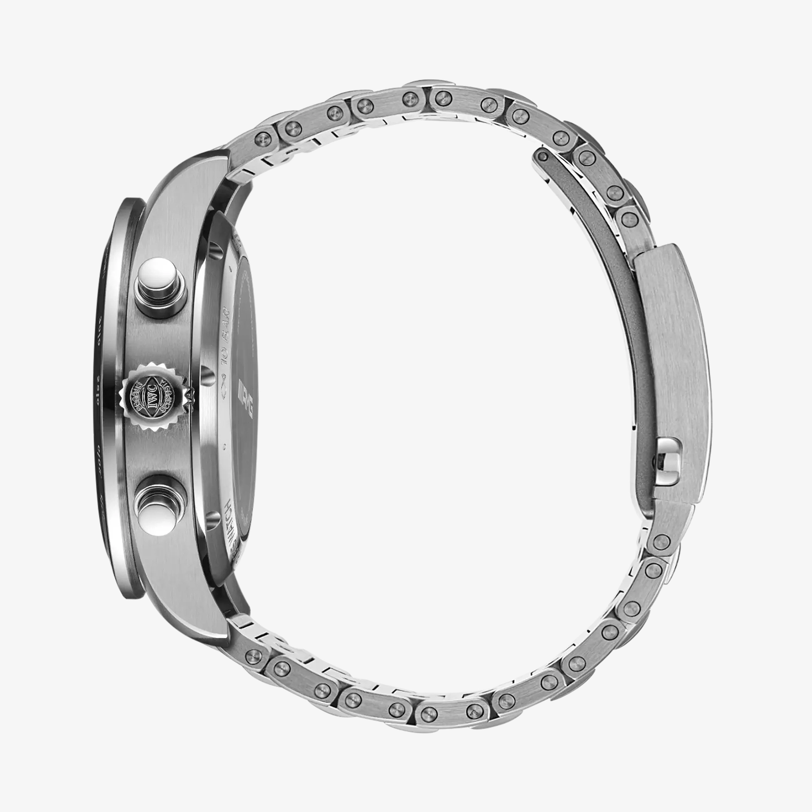 Leistungsbezogene Aspekte wie eine hohe Robustheit, einfache Ablesbarkeit und maximale Präzision sind tief in der DNA von IWC Schaffhausen als Uhrenhersteller verwurzelt. Mit der Pilot's Watch Performance Chronograph präsentiert die Manufaktur einen Chronographen, der kompromisslos auf Performance ausgelegt wurde. Diese Version ist Mercedes-AMG gewidmet. Der zu Mercedes-Benz gehörende Hersteller von Performance Cars ist seit 2004 ein Partner von IWC Schaffhausen. Das 41-Millimeter-Gehäuse, die Krone und die Drücker sind aus Grad 5 Titan gefertigt. Diese Titanlegierung ist rund 45 % leichter als Stahl und besonders fest. Das Gehäuse verfügt über eine gebürstete Oberfläche mit polierten Details an den Bandanstössen. Ein herausragendes funktionales Merkmal der Uhr ist die Keramiklünette mit einer Tachymeterskala, die es dem Träger ermöglicht, die Durchschnittsgeschwindigkeit im Verhältnis zur zurückgelegten Strecke zu messen. Passend zu der polierten schwarzen Keramiklünette verfügt das Modell über ein schwarzes, glänzendes Zifferblatt. Die vertieften Totalisatoren, die Zeiger sowie die applizierten Indizes und Ziffern aus geschwärztem Nickel, die mit Super-LumiNova® gefüllt sind, sorgen für zusätzliche Tiefe und eine hervorragende Ablesbarkeit bei Nacht. Angetrieben wird die Pilot's Watch Performance Chronograph 41 vom IWC-Manufakturkaliber 69385. Dieses mechanische Chronographenwerk besteht aus 242 Einzelteilen und ist durch den getönten Saphirglasboden sichtbar. Der bidirektionale Klinkenaufzug baut in der Zugfeder eine Gangreserve von 46 Stunden auf. Die Säulenradsteuerung des Chronographen sorgt dafür, dass die einzelnen Phasen im Schaltablauf klar definiert sind. Zudem ist ein deutlicher taktiler Widerstand beim Betätigen der Drücker spürbar. Der Chronograph verfügt über die für IWC typische vertikale Anordnung der Hilfszifferblätter. Die gestoppten Minuten werden direkt bei 12 Uhr angezeigt, was die Ablesbarkeit erleichtert. Diese bis 10 bar wasserdichte Uhr wird mit einem integrierten Armband aus Titan mit polierten Mittelgliedern geliefert.
