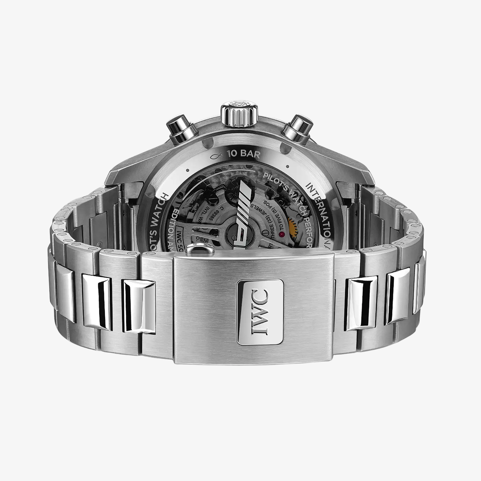 Ref. IW388304 - Die Pilot's Watch Performance Chronograph 41 AMG verfügt über ein 41-Millimeter-Gehäuse aus Titan, ein schwarzes Zifferblatt, Zeiger und Appliken aus geschwärztem Nickel sowie ein Armband aus Titan.