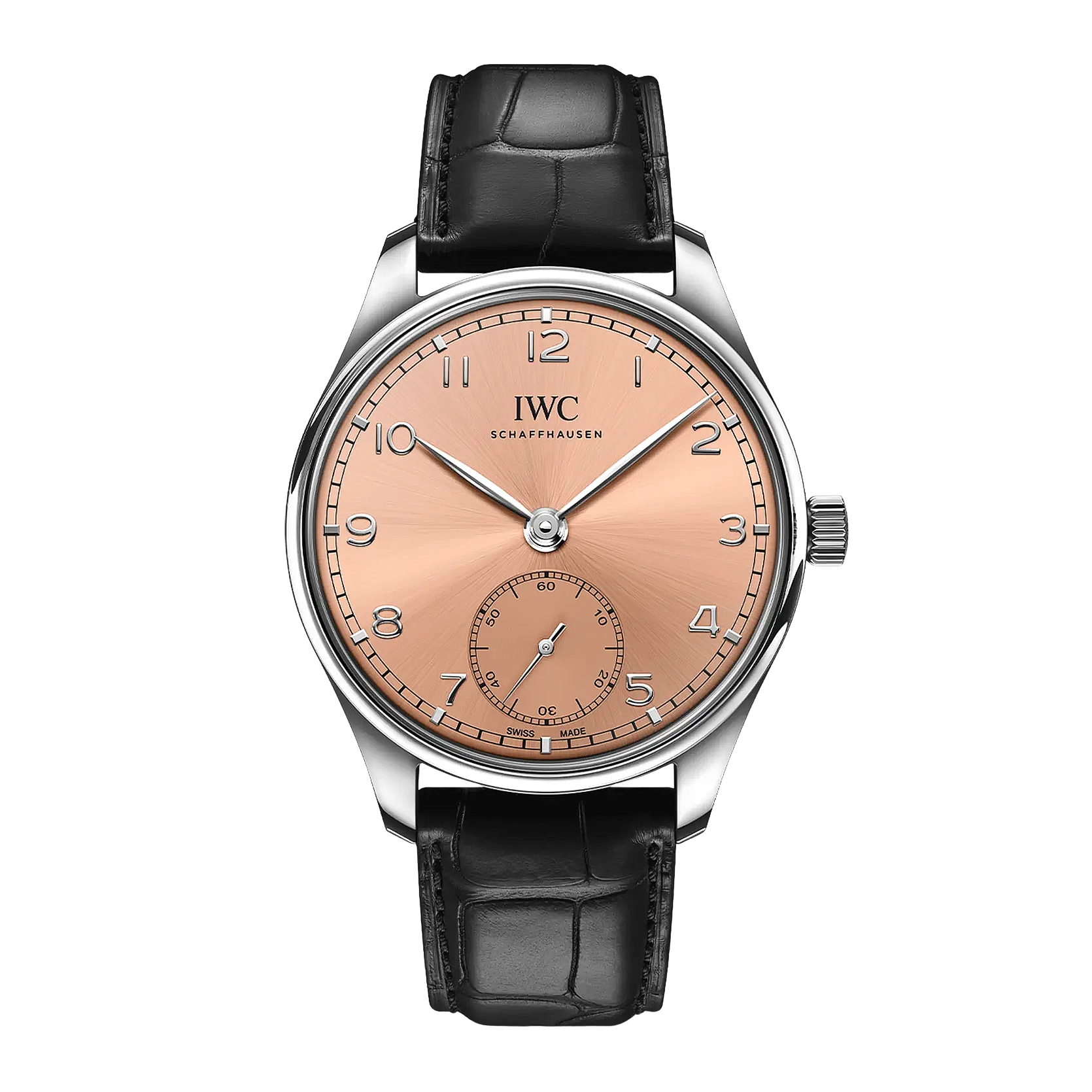 Ein klar strukturiertes, offenes Zifferblatt, eine charakteristische Minutenskala und die kleine Sekunde bei 6 Uhr: Mit der Referenz 325 hat IWC in den späten 1930er-Jahren eine klassische Formensprache begründet, die sich seither wie ein roter Faden durch die Geschichte der Portugieser-Familie zieht. Die Portugieser Automatic 40 präsentiert dieses zeitlos moderne Design in einem kompakten und gut tragbaren Durchmesser von 40 Millimetern. Diese Version verfügt über ein Gehäuse aus Edelstahl sowie rhodinierte Zeiger und Appliken. Ein Blickfang ist das lachsfarbene Zifferblatt. Dank dem reduzierten Portugieser-Design und dem feinen Sonnenschliff kommt die Farbe besonders schön zur Geltung. Zum Zifferblatt passt das schwarze Armband aus Allitgatorleder, dessen Butterfly-Faltschliesse für einen hohen Tragekomfort sorgt. Angetrieben wird der Zeitmesser vom IWC-Manufakturkaliber 82200. Das hochwertige und robuste Automatikwerk verfügt über einen Pellaton-Aufzug mit Komponenten aus nahezu verschleissfreier Keramik, der eine Gangreserve von 60 Stunden aufbaut.