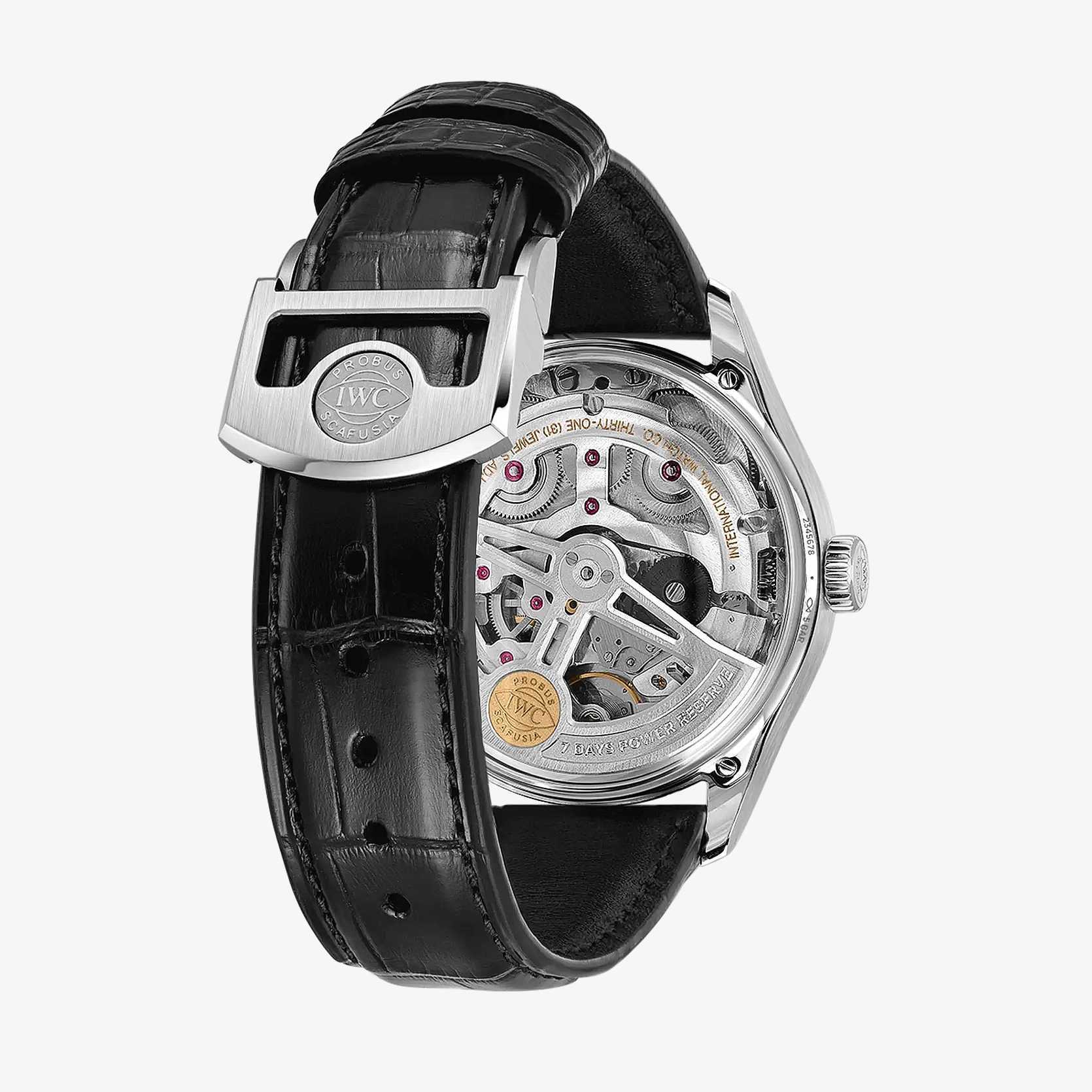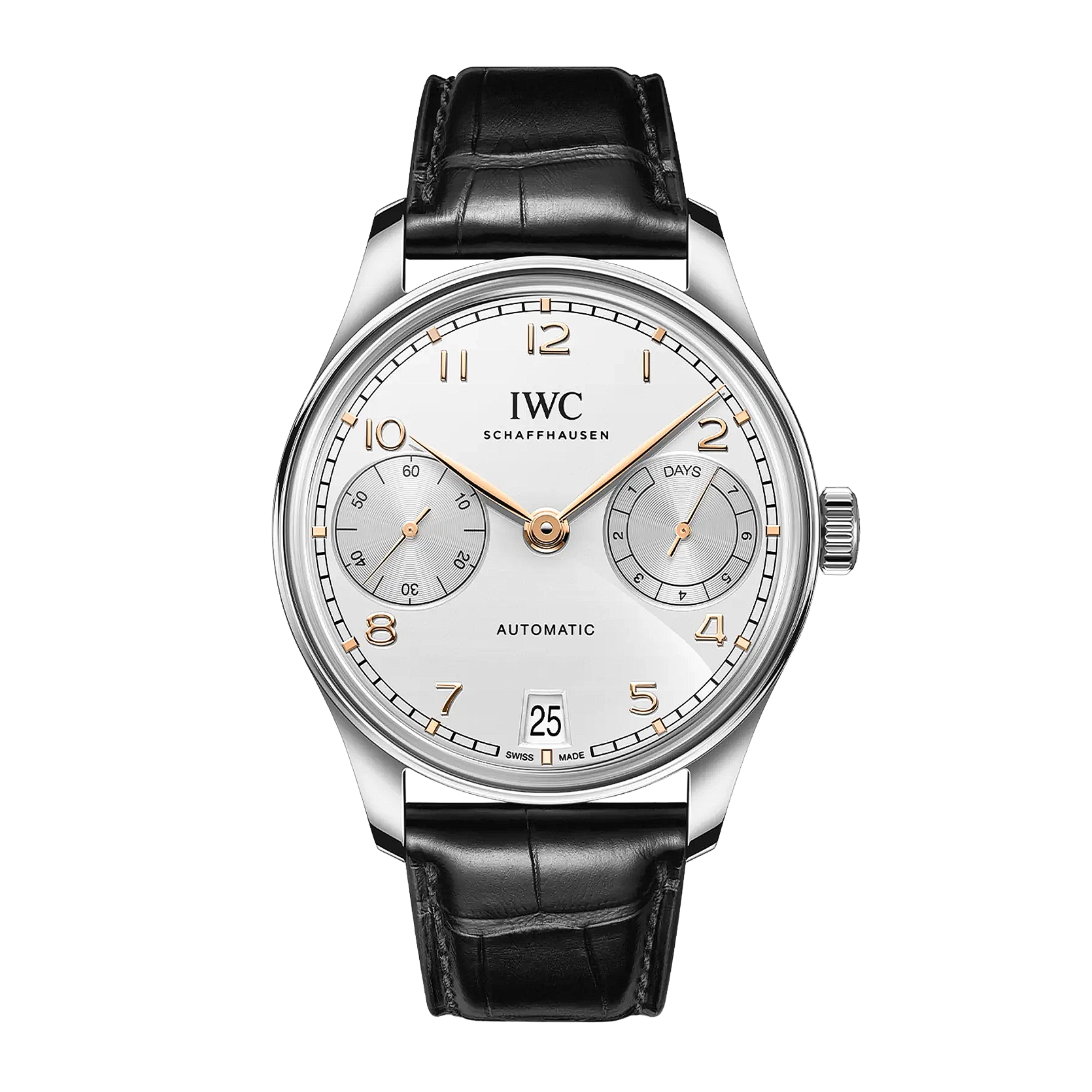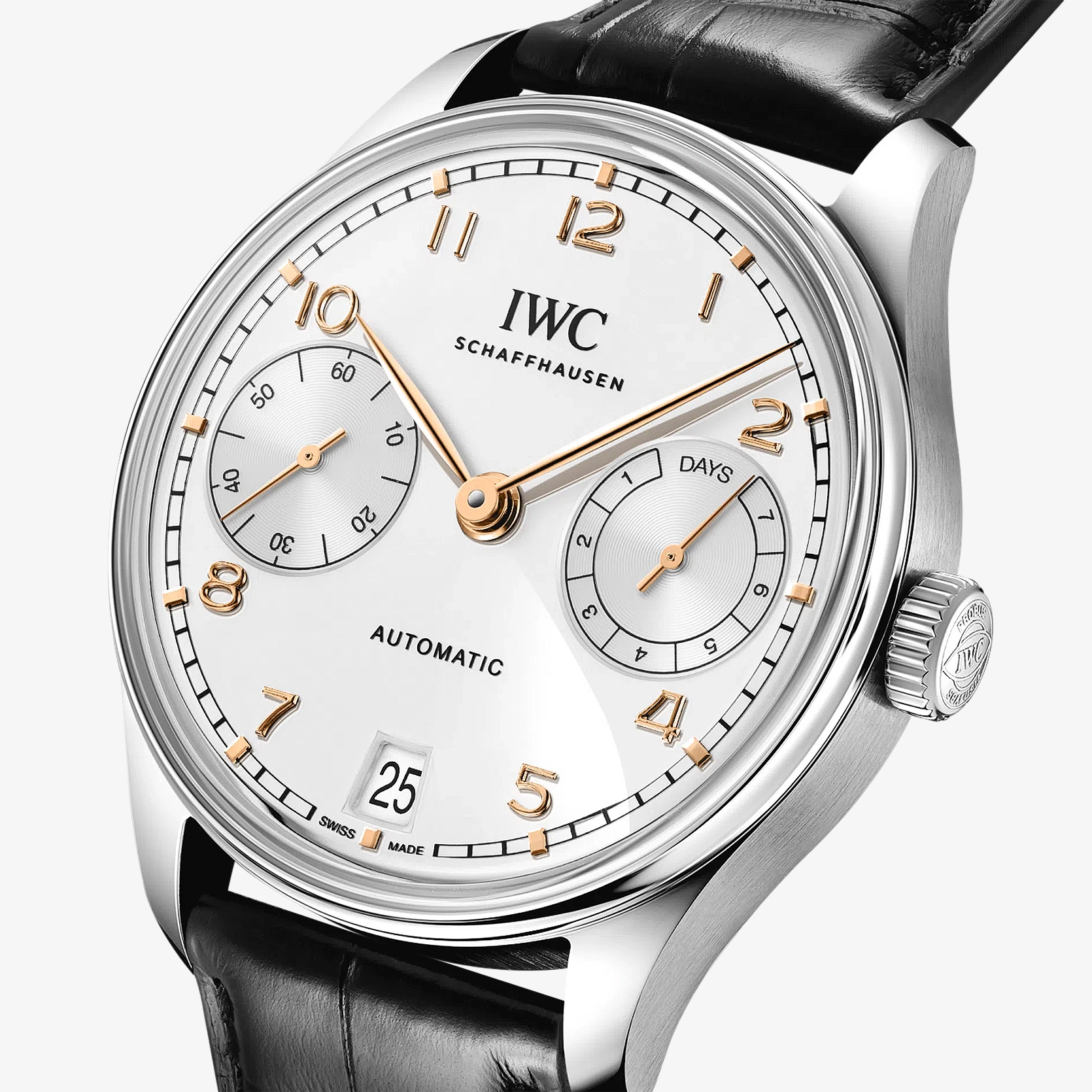 Diese Version verfügt über ein Gehäuse Edelstahl mit einem Durchmesser von 42.4 Millimetern, ein argentéfarbenes Zifferblatt, sowie vergoldete Zeiger und Appliken. Dank einer von Grund auf überarbeiteten Gehäusekonstruktion mit einem dünneren Gehäusering und kastenförmigen Saphirgläsern auf der Vorder- und Rückseite wirkt die Uhr besonders leicht und elegant. Ein Highlight der Uhr ist das aufwendig gefertigte Zifferblatt, das in einem komplexen Herstellungsprozess mit 60 einzelnen Schritten gefertigt wird. Die ungewöhnliche optische Tiefe entsteht durch das Auftragen von 15 Schichten transparenten Lacks, der fein geschliffen und anschliessend auf Hochglanz poliert wird. Die Hilfszifferblätter werden sowohl in den Messingrohling als auch in die Lackschicht gefräst. Ein spezielles Druckverfahren verstärkt den dreidimensionalen Effekt. Zum Schluss werden die Appliken einzeln von Hand aufgesetzt. Angetrieben wird die Portugieser Automatic 42 vom IWC-Manufakturkaliber 52011, das aufwendig mit kreisförmigen Genfer Streifen veredelt ist. Der Pellaton-Aufzug ist mit nahezu verschleissfreien Zirkonoxid-Keramikkomponenten verstärkt und baut in zwei Federhäusern eine Gangreserve von sieben Tagen (168 Stunden) auf. Die Uhr ist mit einem schwarzen Alligatorleder-Armband mit einer Faltschliesse aus Edelstahl ausgestattet.