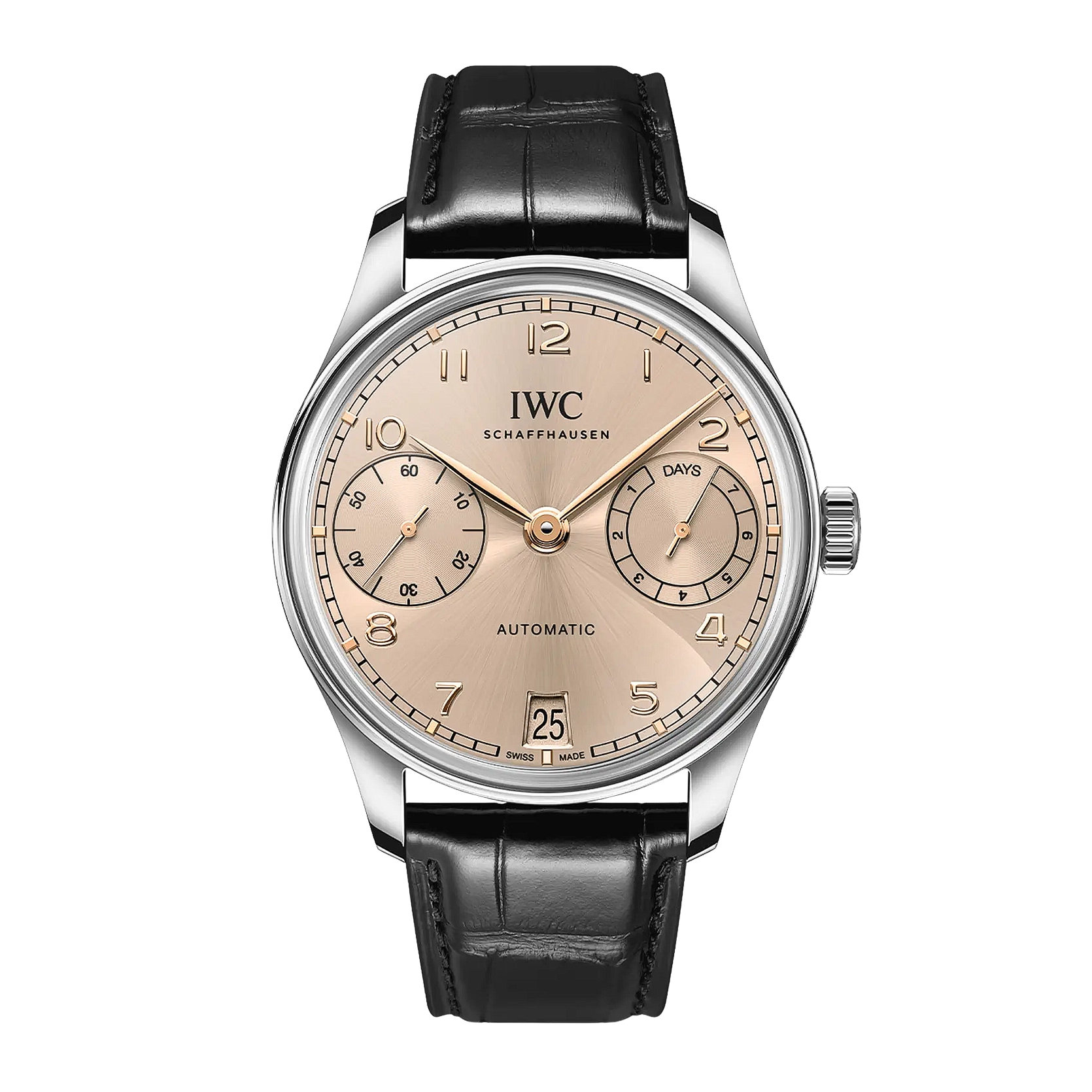 Diese Version verfügt über ein Gehäuse Edelstahl mit einem Durchmesser von 42.4 Millimetern, ein Zifferblatt in der Farbe Dune, sowie vergoldete Zeiger und Gold-Appliken. Dank einer von Grund auf überarbeiteten Gehäusekonstruktion mit einem dünneren Gehäusering und kastenförmigen Saphirgläsern auf der Vorder- und Rückseite wirkt die Uhr besonders leicht und elegant. Ein Highlight der Uhr ist das aufwendig gefertigte Zifferblatt, das in einem komplexen Herstellungsprozess mit 60 einzelnen Schritten gefertigt wird. Die ungewöhnliche optische Tiefe entsteht durch das Auftragen von 15 Schichten transparenten Lacks, der fein geschliffen und anschliessend auf Hochglanz poliert wird. Die Hilfszifferblätter werden sowohl in den Messingrohling als auch in die Lackschicht gefräst. Ein spezielles Druckverfahren verstärkt den dreidimensionalen Effekt. Zum Schluss werden die Appliken einzeln von Hand aufgesetzt. Angetrieben wird die Portugieser Automatic 42 vom IWC-Manufakturkaliber 52011, das aufwendig mit kreisförmigen Genfer Streifen veredelt ist. Der Pellaton-Aufzug ist mit nahezu verschleissfreien Zirkonoxid-Keramikkomponenten verstärkt und baut in zwei Federhäusern eine Gangreserve von sieben Tagen (168 Stunden) auf. Die Uhr ist mit einem schwarzen Alligatorleder-Armband mit einer Faltschliesse aus Edelstahl ausgestattet.