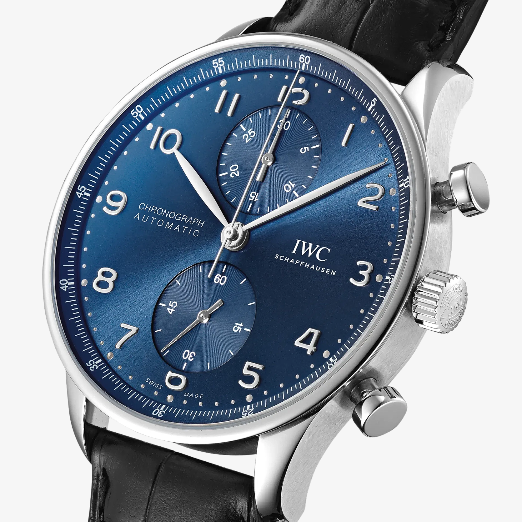 Der Portugieser Chronograph ist eines der ikonischsten Modelle von IWC Schaffhausen. Mit seinem kompakten Durchmesser von 41 Millimetern passt er an fast jedes Handgelenk. Durch die filigrane Lünette entsteht jedoch der Eindruck, als würde man eine bedeutend grössere Uhr tragen. Das klare, funktionale Zifferblatt besticht mit applizierten arabischen Zahlen und schlanken Feuille-Zeigern. Der charakteristische, mit einer Viertelsekundenskala bedruckte Rehaut ermöglicht nicht nur ein präzises Ablesen der Stoppzeit, sondern erinnert auch an den Ursprung der Portugieser als nautisches Präzisionsinstrument für das Handgelenk. Dieses Modell verfügt über ein Gehäuse aus Edelstahl, ein blaues Zifferblatt sowie rhodinierte Zeiger und Appliken. Es wird an einem schwarzen Armband aus Alligatorleder getragen. Im Inneren des sportlich-eleganten Chronographen arbeitet das IWC-Manufakturkaliber 69355. Das robuste und präzise Chronographenwerk in klassischer Kolonnenradbauweise lässt sich durch einen Sichtboden aus Saphirglas betrachten.