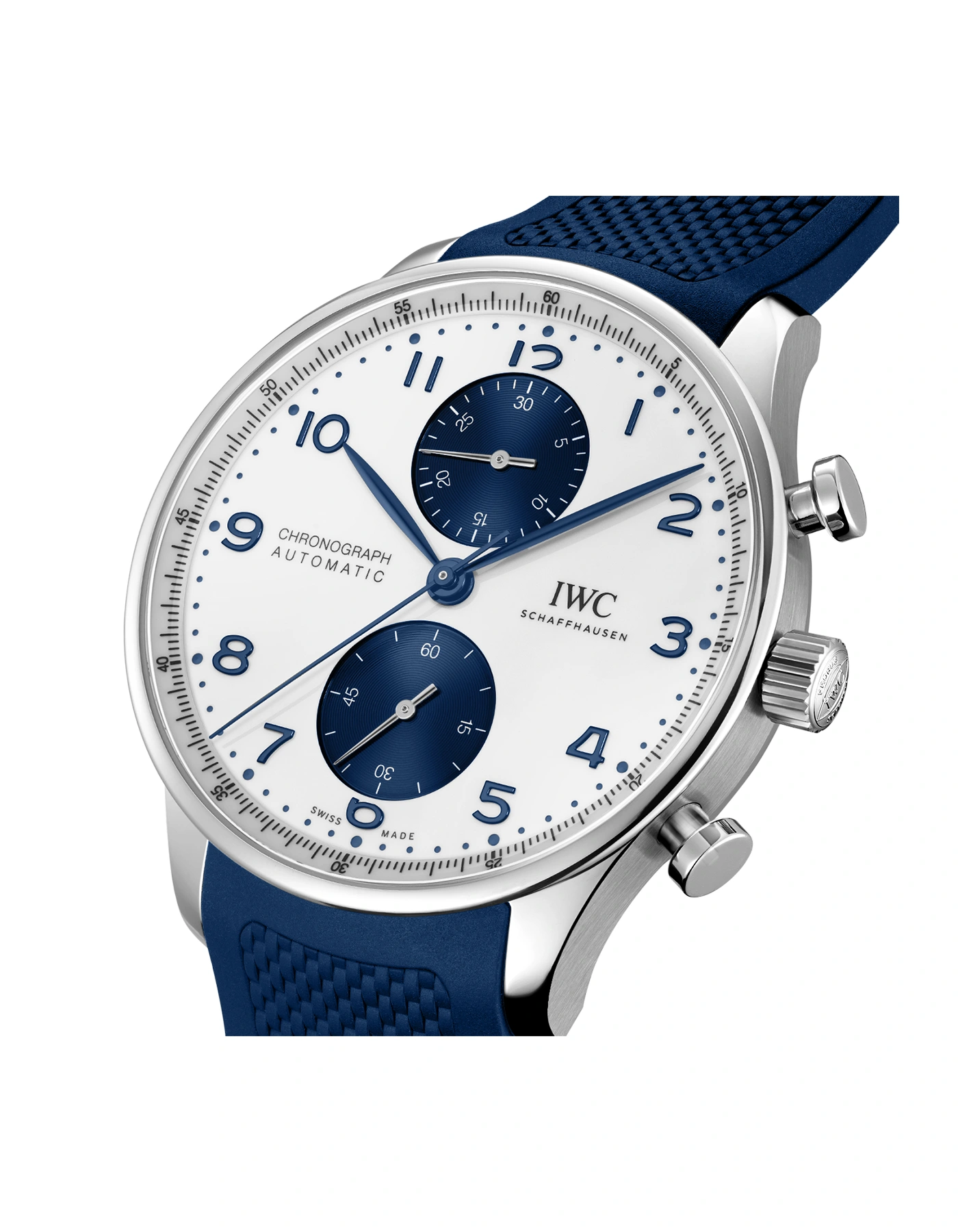 Ikonisches Portugieser-Design, vereint mit einer praktischen und einfach zu bedienenden Chronographenfunktion: Dank der gelungenen Kombination aus Eleganz und Sportlichkeit ist die Portugieser Chronograph zu einer der grössten Ikonen von IWC Schaffhausen geworden. Diese Version ist eine frische und zeitgemässe Interpretation des etablierten Designs mit einem 41-Millimeter-Edelstahlgehäuse, einem weissen Zifferblatt mit kontrastierenden blauen Hilfszifferblättern, blauen arabischen Ziffern und gebläuten Feuille-Zeigern. Der Minutenzähler des Chronographen befindet sich bei 12 Uhr, die kleine Sekunde bei 6 Uhr. Der Sichtboden aus Saphirglas gibt den Blick frei auf das IWC-Manufakturkaliber 69355. Das Chronographenwerk in klassischer Kolonnenradbauweise erlaubt die Messung von Stoppzeiten bis zu 30 Minuten. Diese elegante Sportuhr ist mit einem flexiblen und widerstandsfähigen blauen Kautschukarmband mit Dornschliesse ausgestattet, um einen perfekten Sitz am Handgelenk zu gewährleisten und hohen Tragekomfort zu bieten.