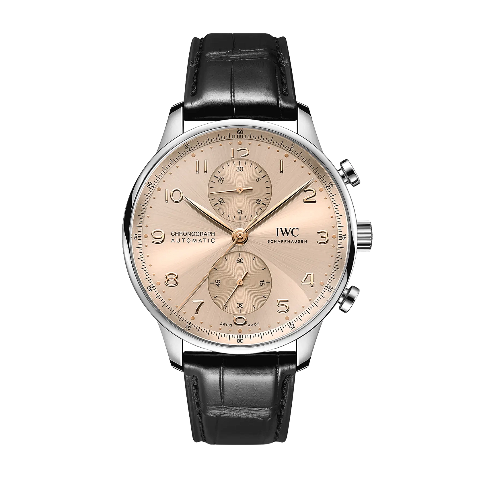 Diese Version verfügt über ein Edelstahl-Gehäuse mit einem Durchmesser von 41 Millimetern, ein Zifferblatt in der Farbe Dune sowie vergoldete Zeiger und Gold-Appliken. Das Highlight der Uhr ist das aufwendig gefertigte Zifferblatt, das in einem komplexen Herstellungsprozess mit 60 einzelnen Schritten gefertigt wird. Die ungewöhnliche optische Tiefe entsteht durch das Auftragen von 15 Schichten transparenten Lacks, der fein geschliffen und anschliessend auf Hochglanz poliert wird. Die Hilfszifferblätter werden sowohl in den Messingrohling als auch in die Lackschicht gefräst. Ein spezielles Druckverfahren verstärkt den dreidimensionalen Effekt. Zum Schluss werden die Appliken einzeln von Hand aufgesetzt. Angetrieben wird die Portugieser Chronograph durch das IWC-Manufakturkaliber 69355, ein mechanisches Chronographenwerk, das mit einem kompromisslosen Fokus auf Robustheit, Zuverlässigkeit und Langlebigkeit entwickelt wurde. Die Uhr ist mit einem schwarzen Alligatorleder-Armband mit einer Dornschliesse aus Edelstahl ausgestattet.
