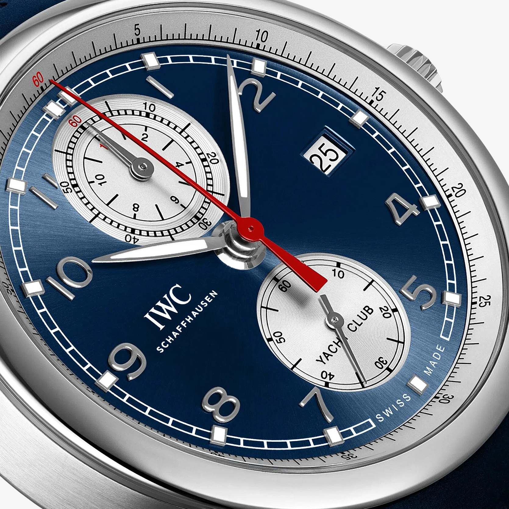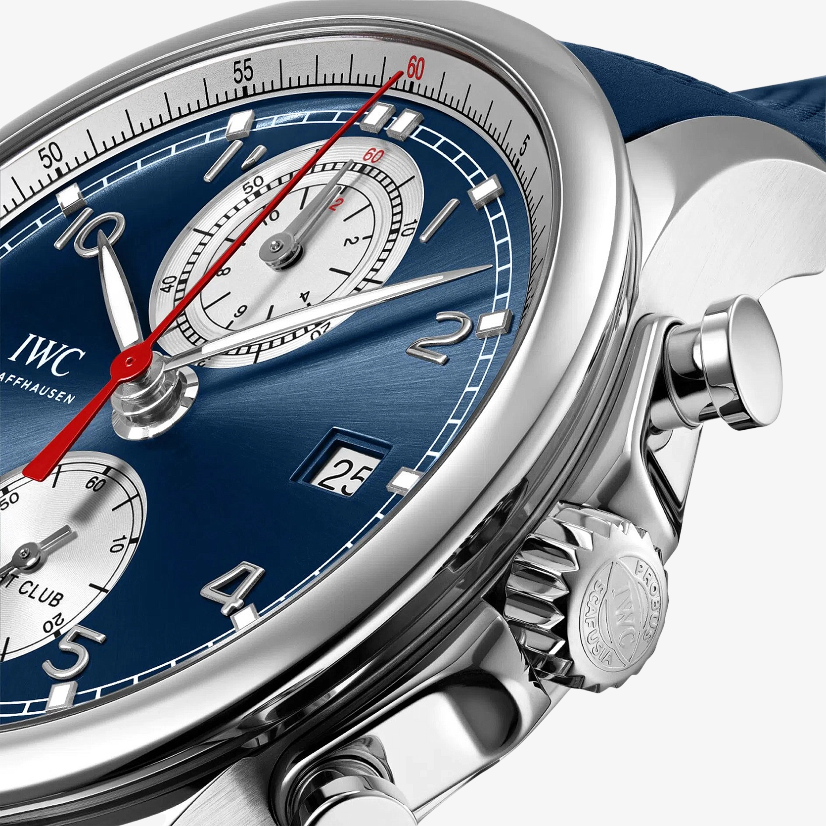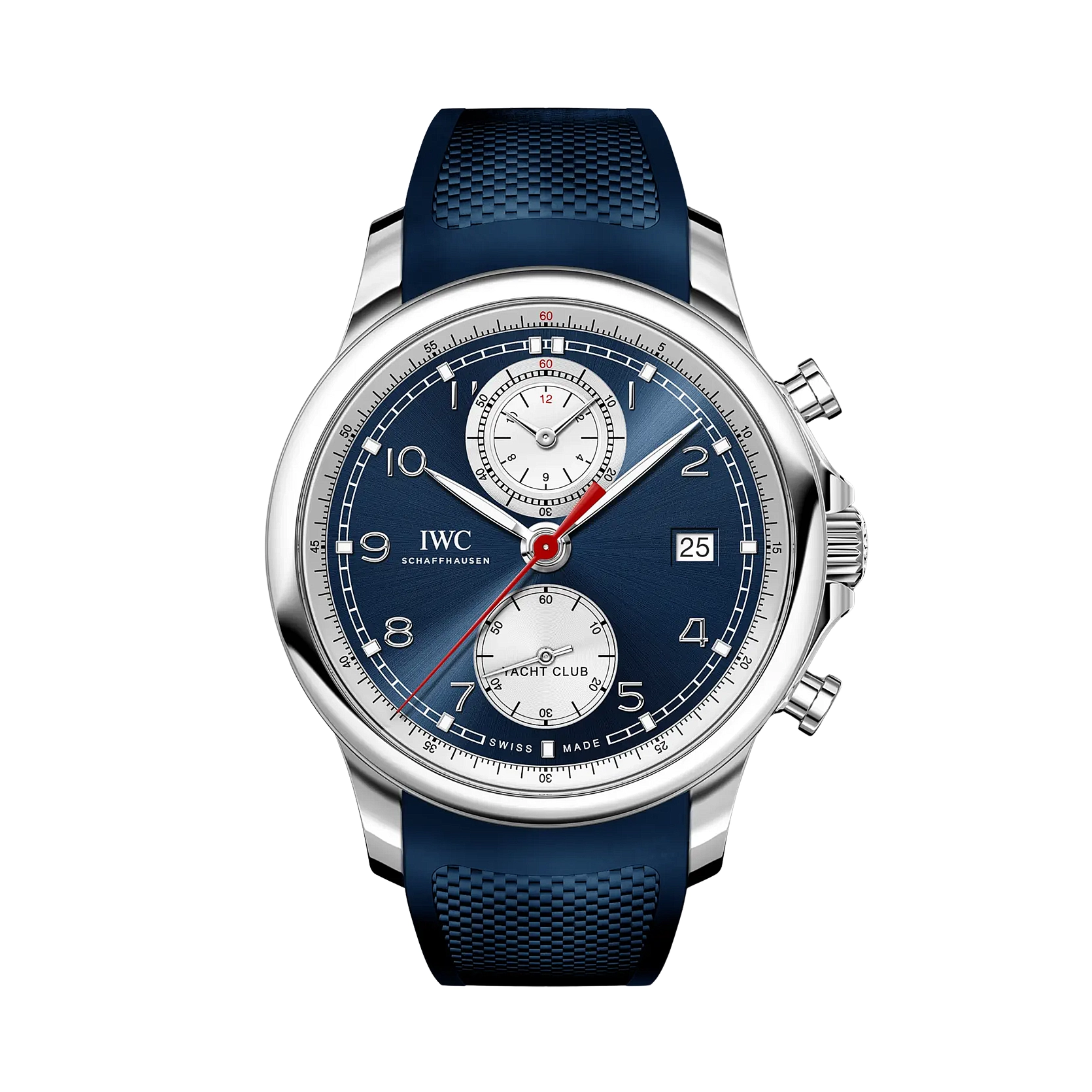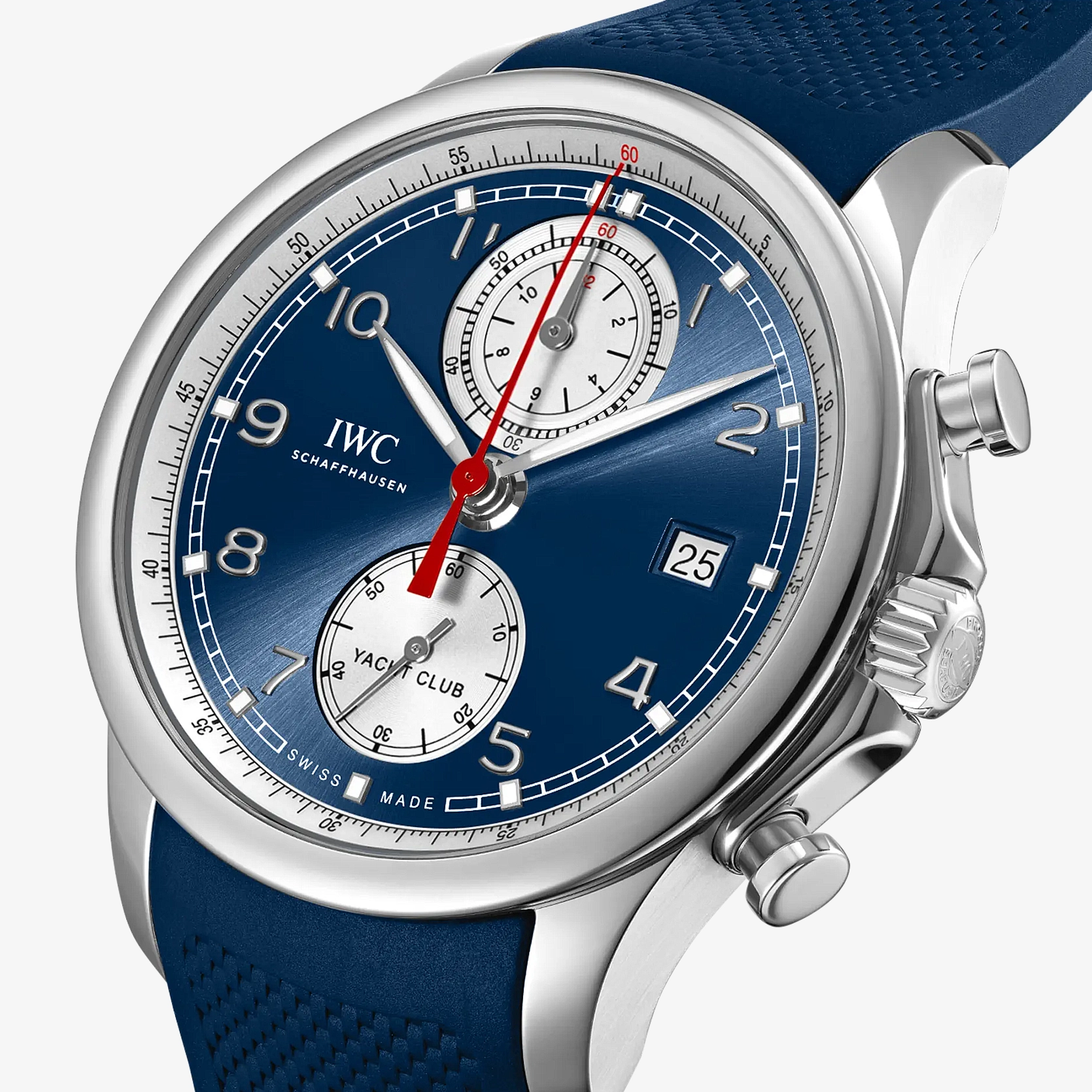 Ref. IW390507 - Wasserdichtes Gehäuse, blaues Zifferblatt und robustes Armband aus blauem Kautschuk: Dieser Portugieser Yacht Club Chronograph ist wie gemacht für den Sommer.