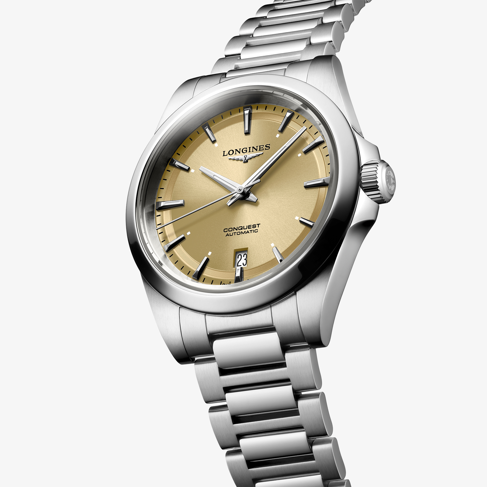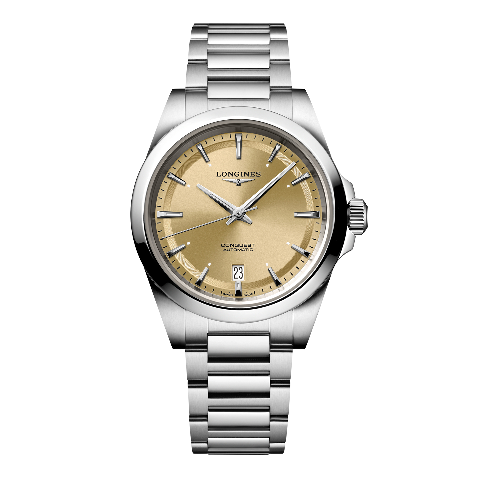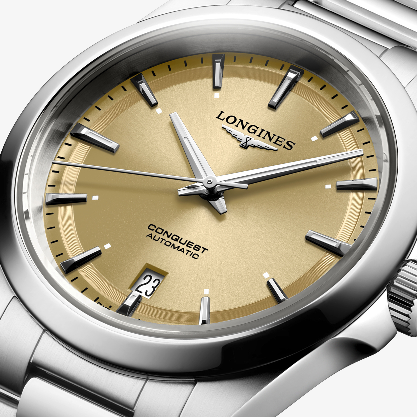 Ref. L3.720.4.62.6 - Datum, Mechanisches Uhrwerk mit Automatikaufzug, Frequenz von 25.200 Halbschwingungen pro Stunde, Gangreserve von ca. 72 Stunden, mit Unruhfeder aus monokristallinem Silizium. Verschraubte Krone, Wasserdicht bis zu einem Druck von 10 bar, Kratzfestes Saphirglas mit mehreren Antireflexschichten auf beiden Seiten. Zifferblatt: Goldenes Zifferblatt mit Sonnenschliff, Swiss Super-LumiNova®. Edelstahl Armband, Mit Dreifach-Sicherheitsfaltschließe und Drückern.