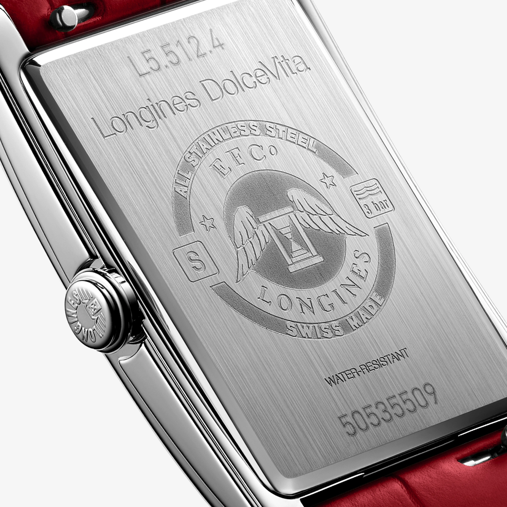 Ref. L5.512.4.91.2 - Die Longines DolceVita Kollektion ist der Inbegriff von zeitloser Eleganz und Raffinesse, die klassisches Design mit modernem Flair nahtlos verbindet. Diese Linie, inspiriert von einem Modell aus den 1920er Jahren und charakterisiert durch ihr rechteckiges Gehäuse und die harmonischen Proportionen, ist über die Jahre gewachsen, ohne dabei jemals ihre Identität zu verlieren. Die in einer Vielzahl von Materialien und Farben erhältlichen Uhren sind ein kraftvoller Ausdruck der Eleganz und des süßen italienischen Lebens – la dolce vita –, die seit jeher mit der Kollektion verbunden sind.