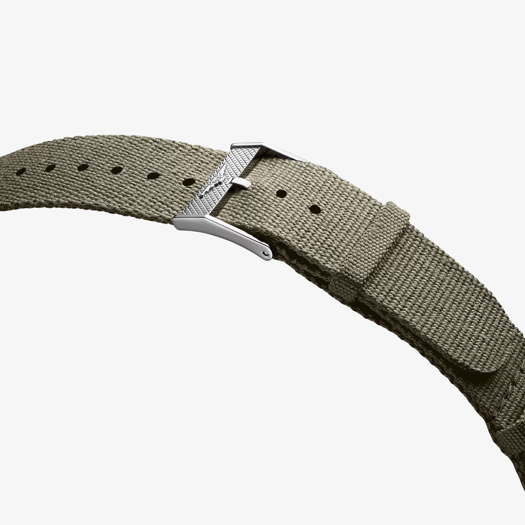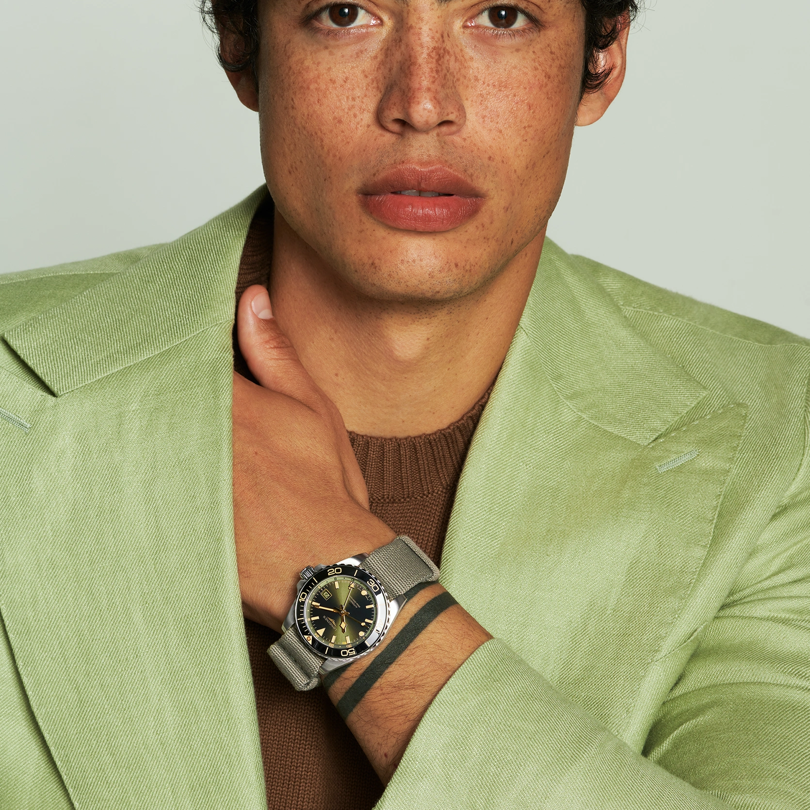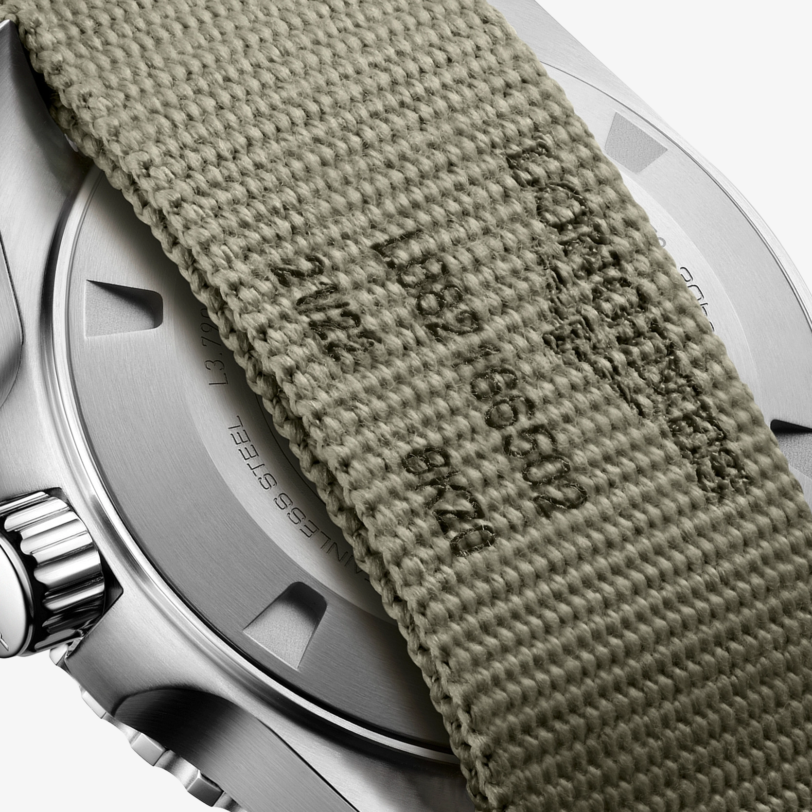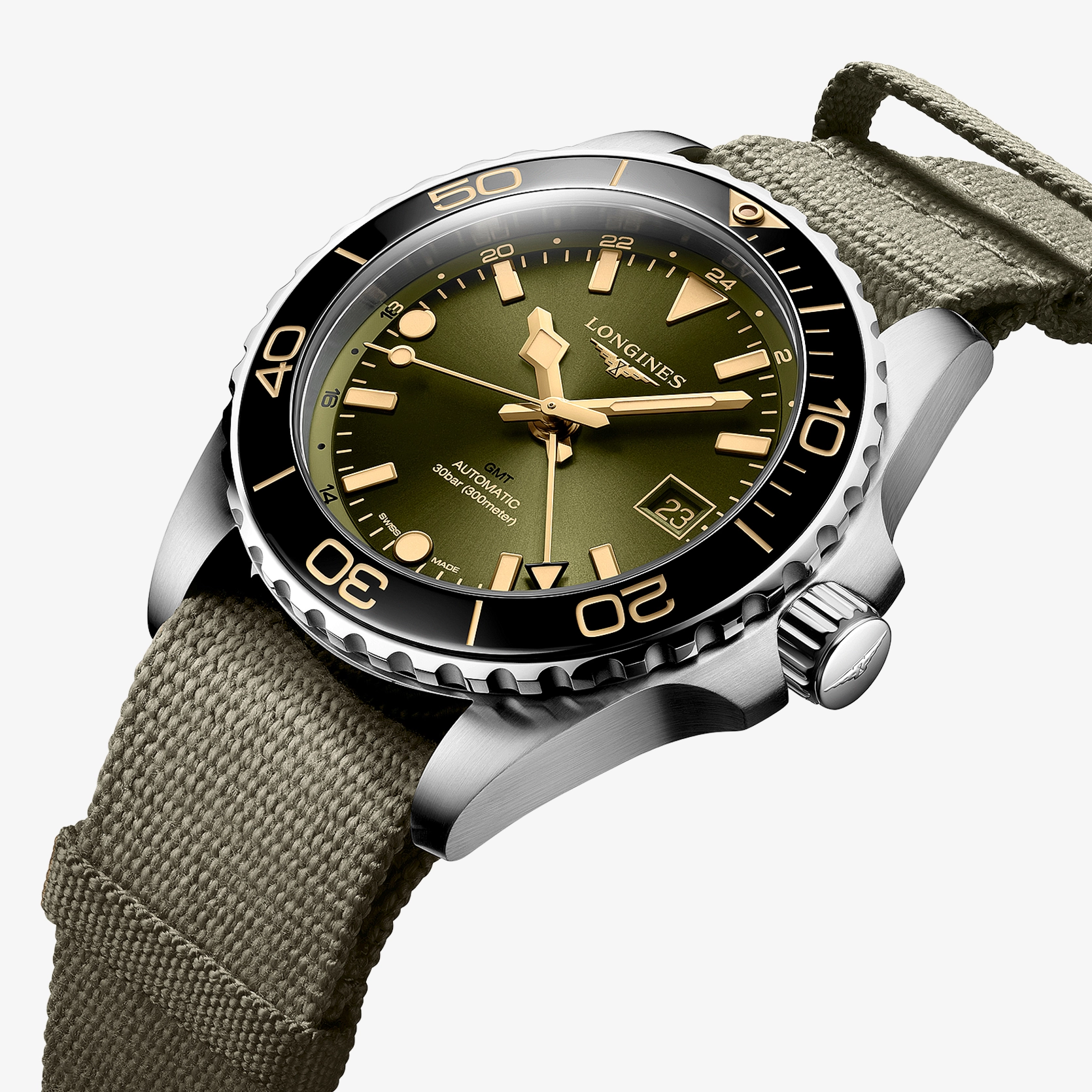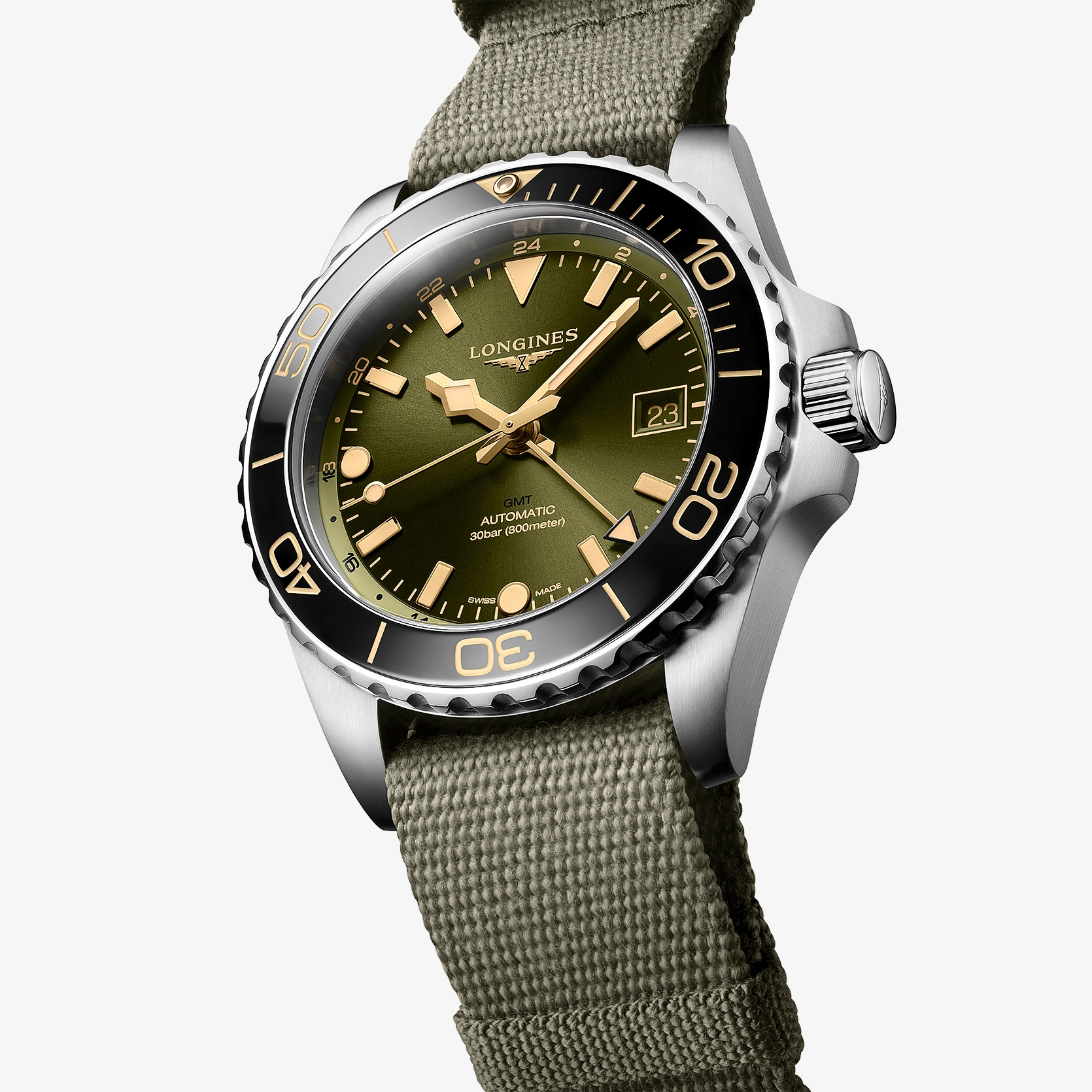 Die HydroConquest GMT zeichnet sich zudem durch ihr Edelstahlgehäuse mit einem Durchmesser von 41 mm mit verschraubtem Gehäuseboden und verschraubter Krone aus. Das Modell ist mit einer neuen einseitig drehbaren, gekerbten Lünette aus schwarzer Keramik mit Leuchtkapsel versehen. Das Zifferblatt ist grün. Die Version ist mit einem Edelstahlarmband oder einem grünen NATO-Armband aus recyceltem Material erhältlich.