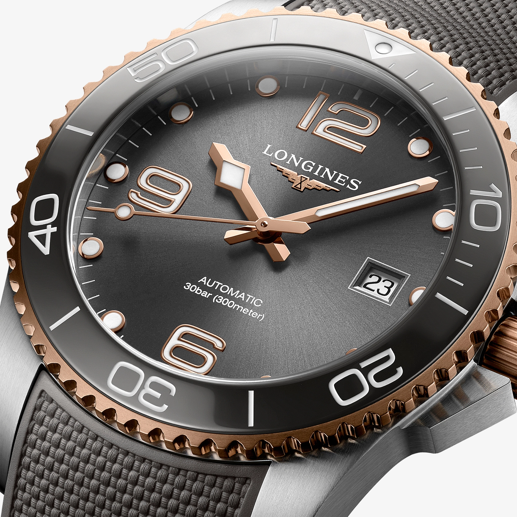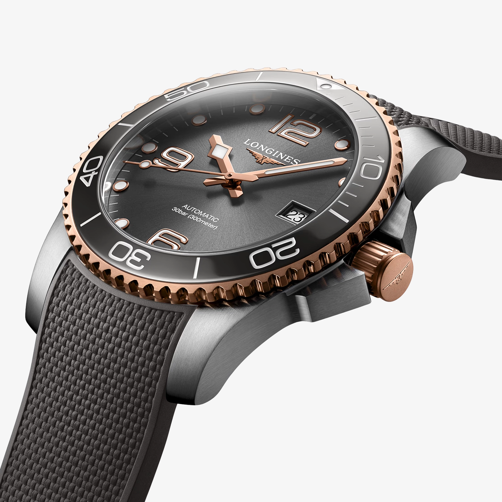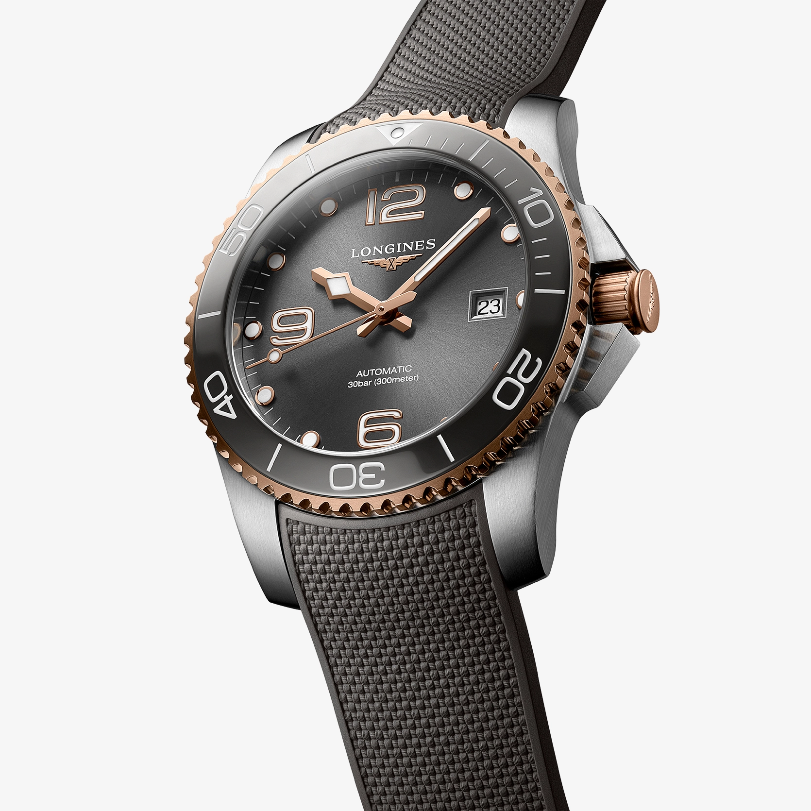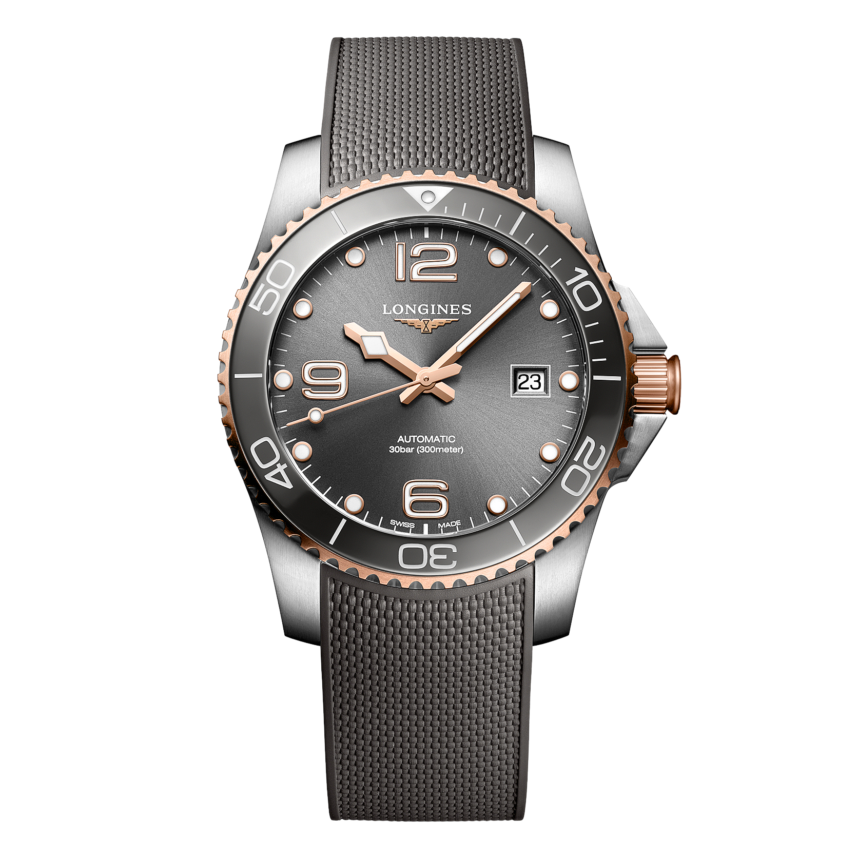 Das Gehäuse von 41 mm Durchmesser wird an einem grauen Kautschukband getragen und birgt ein mechanisches Automatikuhrwerk (Kaliber L888.5). Die Longines HydroConquest sitzt nicht nur bequem am Handgelenk sondern ist auch ein sportlicher Begleiter bei Ihrem nächsten Tauchgang -bis zu 30 bar.